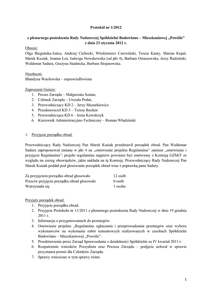 Protokół nr 1/2012 z plenarnego posiedzenia Rady Nadzorczej Spółdzielni Budowlano – Mieszkaniowej „Powiśle” z dnia 23 stycznia 2012 r. Obecni: Olga Bieguńska-Jońca, Andrzej Cichocki, Włodzimierz Czerwiński, Teresa Kanty, Marian Kepal, Marek Kusiak, Joanna Łoś, Jadwiga Nowakowska (od pkt 4), Barbara Ostaszewska, Jerzy Rudziński, Waldemar Sadura, Grażyna Stadnicka, Barbara Stojanowska. Nieobecni: Blandyna Wasilewska – usprawiedliwiona Zaproszeni Goście: 1. Prezes Zarządu – Małgorzata Szatan, 2. Członek Zarządu – Urszula Prałat, 3. Przewodniczący KD 2 – Jerzy Mazurkiewicz 4. Przedstawiciel KD 3 – Teresa Bochen 5. Przewodnicząca KD 6 – Irena Kowalczyk 6. Kierownik Administracyjno-Techniczny – Roman Władziński 1. Przyjęcie porządku obrad. Przewodniczący Rady Nadzorczej Pan Marek Kusiak przedstawił porządek obrad. Pan Waldemar Sadura zaproponował zmianę w pkt 4 na „omówienie projektu Regulaminu” zamiast „omówienie i przyjęcie Regulaminu”; projekt regulaminu najpierw powinien być omówiony z Komisją GZMiT ze względu na szereg obowiązków, jakie nakłada na tę Komisję. Przewodniczący Rady Nadzorczej Pan Marek Kusiak poddał pod głosowanie porządek obrad wraz z poprawką pana Sadury. Za przyjęciem porządku obrad głosowało Przeciw przyjęciu porządku obrad głosowało Wstrzymała się 12 osób 0 osób 1 osoba Przyjęty porządek obrad: 1. Przyjęcie porządku obrad. 2. Przyjęcie Protokołu nr 11/2011 z plenarnego posiedzenia Rady Nadzorczej w dniu 19 grudnia 2011 r. 3. Informacja o przygotowaniach do przetargów. 4. Omówienie projektu „Regulaminu ogłaszania i przeprowadzania przetargów oraz wyboru wykonawców na wykonanie robót remontowych realizowanych w zasobach Spółdzielni Budowlano – Mieszkaniowej „Powiśle”. 5. Przedstawienie przez Zarząd Sprawozdania z działalności Spółdzielni za IV kwartał 2011 r. 6. Rozpatrzenie wniosków Prezydium oraz Prezesa Zarządu – podjęcie uchwał w sprawie przyznania premii dla Członków Zarządu. 7. Sprawy wniesione w tym sprawy różne. 1 2. Przyjęcie Protokołu nr 11/2011 z plenarnego posiedzenia Rady Nadzorczej w dniu 19 grudnia 2011 r. Wobec braku uwag, przewodniczący Rady Nadzorczej Pan Marek Kusiak poddał pod głosowanie przyjęcie Protokołu nr 11/2011. Za przyjęciem głosowało Przeciw przyjęciu głosowało Wstrzymały się 10 osób 0 osób 3 osoby Protokół nr 11/2011 z plenarnego posiedzenia Rady Nadzorczej w dniu 19 grudnia 2011 r. został przyjęty. 3. Informacja o przygotowaniach do przetargów. Pani Prezes Małgorzata Szatan przedstawiła informację o przygotowaniach do przetargów. Poinformowała, że w dniu 2 lutego odbędzie się spotkanie Zarządu z Komisją GZMiT w sprawie omówienia specyfikacji istotnych warunków zamówień. Na koniec marca planowane jest zakończenie przetargów na prace remontowe. Pan Jerzy Rudziński poinformował, że otrzymał wiele zgłoszeń mieszkańców KD 2 w sprawie rewizji projektu remontu dróg wewnętrznych, tj. zmiany kolejności remontów. Pani Prezes wyjaśniła, że koncepcja remontu została przyjęta przez Walne Zgromadzenie po konsultacjach z KD 2. Planowane jest spotkanie z projektantem, który zostanie poproszony o opracowanie koncepcji na całość prac. Jak będzie koncepcja, to potem ustali się kolejność jej realizowania. Pani Barbara Ostaszewska zapytała, czy do prac będzie dołączony wylot dla Dobrej 19. Pani Prezes wyjaśniła, że projekt już jest, a przetarg na wykonanie odbędzie się przy najbliższym przetargu na remont dróg. 4. Omówienie projektu „Regulaminu ogłaszania i przeprowadzania przetargów oraz wyboru wykonawców na wykonanie robót remontowych realizowanych w zasobach Spółdzielni Budowlano – Mieszkaniowej „Powiśle”. W tym momencie do zebranych dołączyła Pani Jadwiga Nowakowska. Pan Marek Kusiak przedstawił swoje uwagi. Pan Andrzej Cichocki zaproponował nie wprowadzanie systemu ocen. Poparł go pan Jerzy Mazurkiewicz. Pani Barbara Ostaszewska zauważyła, że jeśli nie ma kryteriów oceny, a w przyszłości będą różne składy Komisji przetargowej, to należy się zastanowić, jak zagwarantować jakość robót. Pan Włodzimierz Czerwiński dodał, żeby przy odbiorach wpisywać ocenę jakości wykonania, i w kryteriach oceny dopisać punkt o tym, co wiadomo o jakości prac wykonywanych przez danego wykonawcę. Pan Marek Kusiak podsumował dyskusję: po spotkaniu w dniu 2 lutego będzie wiadomo, jaka jest wspólna propozycja Komisji GZMiT i Komisji Członkowsko-Mieszkaniowej: czy zostaje obecnie obowiązujący regulamin, czy całkowicie nowa propozycja, czy tylko zmiany do obecnego projektu Regulaminu. 2 5. Przedstawienie przez Zarząd Sprawozdania z działalności Spółdzielni za IV kwartał 2011 r. Pani Prezes Małgorzata Szatan pokrótce omówiła sprawozdanie z działalności Spółdzielni, w tym negocjacji w sprawie najmu pawilonu Solec 32/34.. Rada Nadzorcza przyjęła sprawozdanie do wiadomości. 6. Rozpatrzenie wniosków Prezydium oraz Prezesa Zarządu – podjęcie uchwał w sprawie przyznania premii dla Członków Zarządu. W sprawie ustalenia wysokości premii dla Członka Zarządu , zaproponowano, aby wysokość premii kwartalnej wyniosła 15% albo 20%. za premią w wysokości 20% głosowało za premią w wysokości 15% głosowało przeciw głosowało wstrzymało się od głosowania 9 osób 5 osób 0 osób 0 osób Wobec powyższego Uchwała nr 1/2012 została przyjęta w następującej treści: Uchwała Nr 1/2012 Rady Nadzorczej Spółdzielni Budowlano Mieszkaniowej „Powiśle" z dnia 23 stycznia 2012 r. w sprawie ustalenia wysokości premii kwartalnej dla Członka Zarządu. Na podstawie § 58 pkt.5 Statutu w związku z § 2 ust. 2 Regulaminu wynagradzania Członków Zarządu w Spółdzielni Budowlano Mieszkaniowej „Powiśle” – Załącznik do Uchwały Rady Nadzorczej nr 9/2007 z dnia 22.10.2007 r., uchwala się, co następuje: 