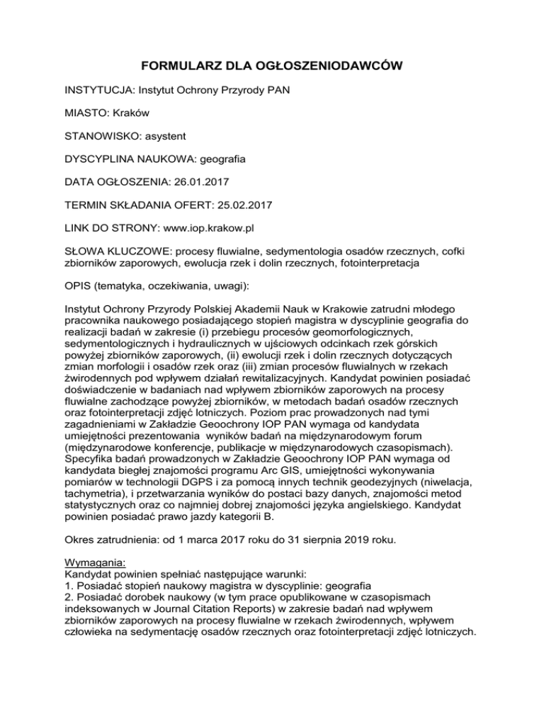 formularz dla ogłoszeniodawców - Instytut Ochrony Przyrody PAN