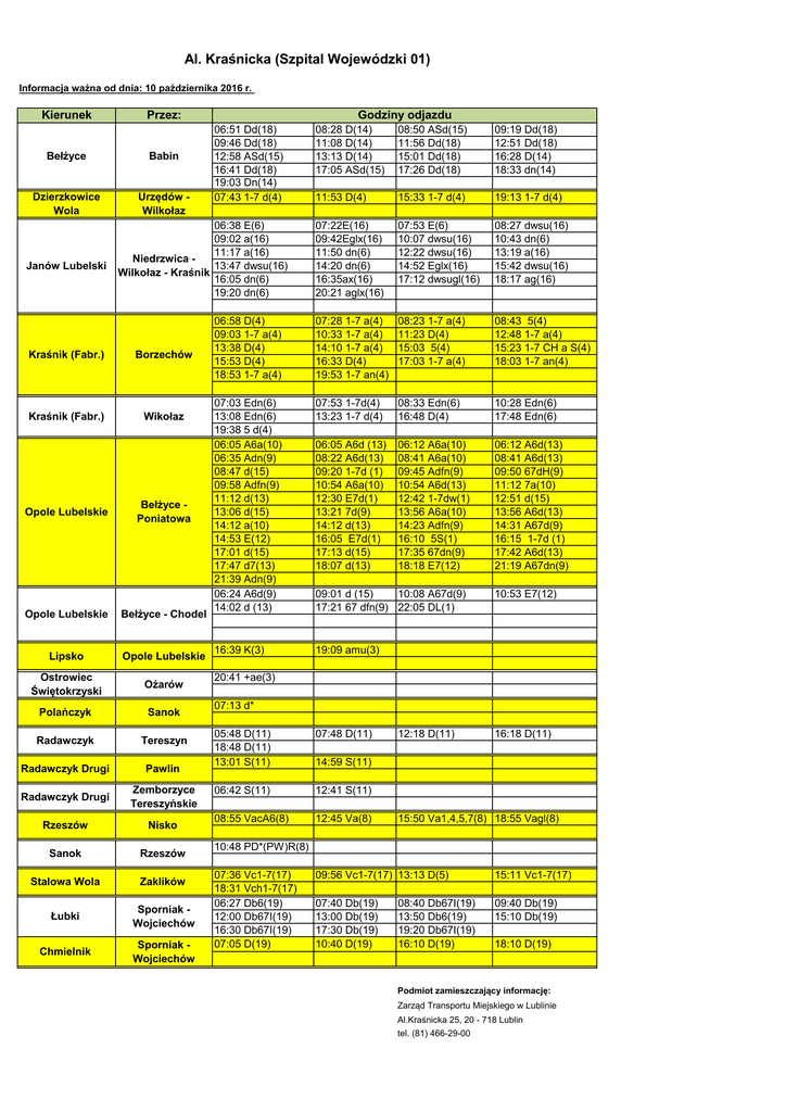 Al. Kraśnicka (Szpital Wojewódzki 01) Informacja ważna od dnia: 10 października 2016 r. Kierunek Przez: Bełżyce Babin Dzierzkowice Wola Urzędów Wilkołaz Janów Lubelski Kraśnik (Fabr.) Kraśnik (Fabr.) Opole Lubelskie Godziny odjazdu 06:51 Dd(18) 09:46 Dd(18) 12:58 ASd(15) 16:41 Dd(18) 19:03 Dn(14) 07:43 1-7 d(4) 08:28 D(14) 11:08 D(14) 13:13 D(14) 17:05 ASd(15) 08:50 ASd(15) 11:56 Dd(18) 15:01 Dd(18) 17:26 Dd(18) 09:19 Dd(18) 12:51 Dd(18) 16:28 D(14) 18:33 dn(14) 11:53 D(4) 15:33 1-7 d(4) 19:13 1-7 d(4) 07:22E(16) 09:42Eglx(16) 11:50 dn(6) 14:20 dn(6) 16:35ax(16) 20:21 aglx(16) 07:53 E(6) 10:07 dwsu(16) 12:22 dwsu(16) 14:52 Eglx(16) 17:12 dwsugl(16) 08:27 dwsu(16) 10:43 dn(6) 13:19 a(16) 15:42 dwsu(16) 18:17 ag(16) 06:58 D(4) 09:03 1-7 a(4) 13:38 D(4) 15:53 D(4) 18:53 1-7 a(4) 07:28 1-7 a(4) 10:33 1-7 a(4) 14:10 1-7 a(4) 16:33 D(4) 19:53 1-7 an(4) 08:23 1-7 a(4) 11:23 D(4) 15:03 5(4) 17:03 1-7 a(4) 08:43 5(4) 12:48 1-7 a(4) 15:23 1-7 CH a S(4) 18:03 1-7 an(4) 07:03 Edn(6) 13:08 Edn(6) 19:38 5 d(4) 06:05 A6a(10) 06:35 Adn(9) 08:47 d(15) 09:58 Adfn(9) 11:12 d(13) 13:06 d(15) 14:12 a(10) 14:53 E(12) 17:01 d(15) 17:47 d7(13) 21:39 Adn(9) 06:24 A6d(9) 14:02 d (13) 07:53 1-7d(4) 13:23 1-7 d(4) 08:33 Edn(6) 16:48 D(4) 10:28 Edn(6) 17:48 Edn(6) 06:05 A6d (13) 08:22 A6d(13) 09:20 1-7d (1) 10:54 A6a(10) 12:30 E7d(1) 13:21 7d(9) 14:12 d(13) 16:05 E7d(1) 17:13 d(15) 18:07 d(13) 06:12 A6a(10) 08:41 A6a(10) 09:45 Adfn(9) 10:54 A6d(13) 12:42 1-7dw(1) 13:56 A6a(10) 14:23 Adfn(9) 16:10 5S(1) 17:35 67dn(9) 18:18 E7(12) 06:12 A6d(13) 08:41 A6d(13) 09:50 67dH(9) 11:12 7a(10) 12:51 d(15) 13:56 A6d(13) 14:31 A67d(9) 16:15 1-7d (1) 17:42 A6d(13) 21:19 A67dn(9) 16:39 K(3) 19:09 amu(3) 06:38 E(6) 09:02 a(16) 11:17 a(16) Niedrzwica 13:47 dwsu(16) Wilkołaz - Kraśnik 16:05 dn(6) 19:20 dn(6) Borzechów Wikołaz Bełżyce Poniatowa Opole Lubelskie Bełżyce - Chodel Lipsko Opole Lubelskie Ostrowiec Świętokrzyski Ożarów Polańczyk Sanok Radawczyk Tereszyn Radawczyk Drugi Pawlin Radawczyk Drugi Zemborzyce Tereszyńskie Rzeszów Nisko Sanok Rzeszów 10:48 PD*(PW)R(8) Stalowa Wola Zaklików Łubki Sporniak Wojciechów Chmielnik Sporniak Wojciechów 07:36 Vc1-7(17) 18:31 Vch1-7(17) 06:27 Db6(19) 12:00 Db67I(19) 16:30 Db67I(19) 07:05 D(19) 09:01 d (15) 10:08 A67d(9) 17:21 67 dfn(9) 22:05 DL(1) 10:53 E7(12) 20:41 +ae(3) 07:13 d* 05:48 D(11) 18:48 D(11) 13:01 S(11) 07:48 D(11) 06:42 S(11) 12:41 S(11) 08:55 VacA6(8) 12:45 Va(8) 12:18 D(11) 16:18 D(11) 14:59 S(11) 15:50 Va1,4,5,7(8) 18:55 Vagl(8) 09:56 Vc1-7(17) 13:13 D(5) 15:11 Vc1-7(17) 07:40 Db(19) 13:00 Db(19) 17:30 Db(19) 10:40 D(19) 09:40 Db(19) 15:10 Db(19) 08:40 Db67I(19) 13:50 Db6(19) 19:20 Db67I(19) 16:10 D(19) 18:10 D(19) Podmiot zamieszczający informację: Zarząd Transportu Miejskiego w Lublinie Al.Kraśnicka 25, 20 - 718 Lublin tel. (81) 466-29-00 LEGENDA: (PW) – przystanek warunkowy (nażyczenie) + – kursuje w dni wolne od pracy (niedziele i święta) 1 - 7 – kursuje od poniedziałku do niedzieli 1 – kursuje w poniedziałki 4 – kursuje w czwartki 5 – kursuje w piątki 5* – kursuje w piątki w dni nauki szkolnej 6 – kursuje w soboty 7 – kursuje w niedziele A – kursuje od poniedziałku do piątku A* – kursuje w dni robocze od poniedziałku do piątku a – Nie kursuje w pierwszy dzień Świąt Wielkanocnych oraz w dniu 25.XII. b – nie kursuje w dniu 1.I, w pierwszy dzień Świąt Wielkanocnych i w dniu 25.XII C – kursuje w soboty, niedziele i święta c – nie kursuje w dniu 1I, pierwszy dzień świąt Wielkanocnych oraz w dniach 25,26 Grudnia D – kursuje od poniedziałku do piątku oprócz świąt d – nie kursuje w dniu 1.I, w pierwszy i drugi dzień Świąt Wielkanocnych oraz w dniach 25 i 26. XII d* – nie kursuje w dniu 1.I w pierwszy dzień Świąt Wielkanocnych i w dniu 25.XII E – kursuje od poniedziałku do soboty oprócz świąt e – nie kursuje w okresie ferii letnich. F – kursuje w dni robocze od poniedziałku do piątku f – nie kursuje w okresie ferii letnich i zimowych oraz szkolnych przerw świątecznych g – nie kursuje w dniu 24 XII H – kursuje codziennie w okresie ferii letnich i zimowych oraz szkolnych przerw świątecznych h – nie kursuje w Wielką Sobotę oraz w dniu 24.XII K - kursuje w piątki w dni robocze, czwartki przedświąteczne, środę przed Bożym Ciałem L – kursuje w okresie ferii letnich l – nie kursuje w dniu 31 XII m – nie kursuje w dniach 24 i 31.XII, n – nie kursuje w Wielką Sobotę oraz w dniach 24 XII i 31 XII P – kurs pośpieszny R – obowiązkowa rezerwacja telefoniczna S – kursuje w dni nauki szkolnej s – nie kursuje w dniach 1 i 3.V, 15.VIII , u – nie kursuje 1 i 11.XI oraz święto Trzech Króli u* - nie kursuje 1 maja V – kurs przyśpiezony w – nie kursuje w dzień Bożego Ciała x – nie kursuje w Wielką Sobotę (..) - cyfra w nawiasie oznacza przewoźnika realizującego dany kurs Przewoźnik/oznaczenie rodzaju przewozów: 1. Przewóz osób Tarkowski Henryk, ul. M. Buczka 19, 24-300 Opole Lubelskie, 696092876, ( komunikacja przyśpieszona). 2. Galicja Express, 24-300 Opole lubelskie, ul. Sikorskiego 8, tel: 17-78-50-500, 603-212-617 (komunikacja przyśpieszona). 3. PKS w Ostrowcu Świętokrzyskim SA, Żabia 40, 27-400 Ostrowiec Świętokrzyski. 4. Przewóz Osób "Joker" M. PYZIK, S. PYZIK S.C. 23-200 Kraśnik, ul. Lubelska 115, TEL. 81 884 56 94, komunikacja przyspieszona. 5. PKS w Stalowej Woli, ul. Ofiar Katynia 30, 37-450 Stalowa Wola, tel:(15) 8435811. 6. Adam Liponoga, Przewóz Osób ""AGA-2"", ul. Ks. Jerzego Popiełuszki 1a/44, 23-210 Kraśnik. 7. Maciej Pietroń, ul. Henin 11, 24-320 Poniatowa, 505929526, przyspieszony. 8. Tadeusz Jędrej, ul. Sikorskiego 8, 24-300 Opole Lubelskie , tel. 663212163. 9. Mariusz Bigos - Usługi Przewozowe, ul. Kwiatowa 13, 24-300 Opole Lubelskie. 10. GTS EUROBUS omasz Pcia, ul. Kolorowa 6/35, 20-583 Lubli, tel. 693023939 11. Lubelskie Linie Autobusowe Sp. z o.o., ul. Hutnicza 1, 20-218 Lublin, te