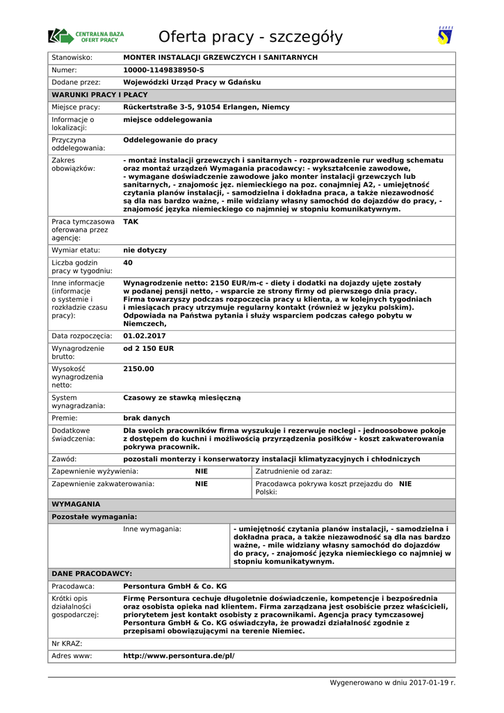 Oferta pracy - szczegóły Stanowisko: MONTER INSTALACJI GRZEWCZYCH I SANITARNYCH Numer: 10000-1149838950-S Dodane przez: Wojewódzki Urząd Pracy w Gdańsku WARUNKI PRACY I PŁACY Miejsce pracy: Rückertstraße 3-5, 91054 Erlangen, Niemcy Informacje o lokalizacji: miejsce oddelegowania Przyczyna oddelegowania: Oddelegowanie do pracy Zakres obowiązków: - montaż instalacji grzewczych i sanitarnych - rozprowadzenie rur według schematu oraz montaż urządzeń Wymagania pracodawcy: - wykształcenie zawodowe, - wymagane doświadczenie zawodowe jako monter instalacji grzewczych lub sanitarnych, - znajomośc jęz. niemieckiego na poz. conajmniej A2, - umiejętność czytania planów instalacji, - samodzielna i dokładna praca, a także niezawodność są dla nas bardzo ważne, - mile widziany własny samochód do dojazdów do pracy, znajomość języka niemieckiego co najmniej w stopniu komunikatywnym. Praca tymczasowa oferowana przez agencję: TAK Wymiar etatu: nie dotyczy Liczba godzin pracy w tygodniu: 40 Inne informacje (informacje o systemie i rozkładzie czasu pracy): Wynagrodzenie netto: 2150 EUR/m-c - diety i dodatki na dojazdy ujęte zostały w podanej pensji netto, - wsparcie ze strony firmy od pierwszego dnia pracy. Firma towarzyszy podczas rozpoczęcia pracy u klienta, a w kolejnych tygodniach i miesiącach pracy utrzymuje regularny kontakt (również w języku polskim). Odpowiada na Państwa pytania i służy wsparciem podczas całego pobytu w Niemczech, Data rozpoczęcia: 01.02.2017 Wynagrodzenie brutto: od 2 150 EUR Wysokość wynagrodzenia netto: 2150.00 System wynagradzania: Czasowy ze stawką miesięczną Premie: brak danych Dodatkowe świadczenia: Dla swoich pracowników firma wyszukuje i rezerwuje noclegi - jednoosobowe pokoje z dostępem do kuchni i możliwością przyrządzenia posiłków - koszt zakwaterowania pokrywa pracownik. Zawód: pozostali monterzy i konserwatorzy instalacji klimatyzacyjnych i chłodniczych Zapewnienie wyżywienia: NIE Zatrudnienie od zaraz: Zapewnienie zakwaterowania: NIE Pracodawca pokrywa koszt przejazdu do NIE Polski: WYMAGANIA Pozostałe wymagania: Inne wymagania: - umiejętność czytania planów instalacji, - samodzielna i dokładna praca, a także niezawodność są dla nas bardzo ważne, - mile widziany własny samochód do dojazdów do pracy, - znajomość języka niemieckiego co najmniej w stopniu komunikatywnym. DANE PRACODAWCY: Pracodawca: Persontura GmbH & Co. KG Krótki opis działalności gospodarczej: Firmę Persontura cechuje długoletnie doświadczenie, kompetencje i bezpośrednia oraz osobista opieka nad klientem. Firma zarządzana jest osobiście przez właścicieli, priorytetem jest kontakt osobisty z pracownikami. Agencja pracy tymczasowej Persontura GmbH & Co. KG oświadczyła, że prowadzi działalność zgodnie z przepisami obowiązującymi na terenie Niemiec. Nr KRAZ: Adres www: http://www.persontura.de/pl/ Wygenerowano w dniu 2017-01-19 r. Sposób aplikowania: bezpośrednio do pracodawcy Adres: [email protected] oraz do widomości do WUP Gdańsk: [email protected] W tytule maila proszę wpisać „MONTER INSTALACJI GRZEWCZYCH I SANITARNYCH” Pracodawca przewiduje organizację spotkania rekrutacyjnego w Katowicach na początku lutego br. Wybrani przez pracodawcę kandydaci zostaną poinformowani o dokładnym miejscu i terminie spotkania. W przypadku zebrania niewielkiej liczby kandydatów, pracodawca zastrzega możliwość odwołania spotkania. Osoba do kontaktu: Numer telefonu: E-mail: Język aplikacji: niemiecki Wymagane dokumenty: CV w jęz. niemieckim Sposób kontaktu / przekazania dokum.: e-mail Dodatkowe informacje dotyczące aplikowania: Więcej informacji udziela p. Zygmunt Potocki, tel.: 00 49 9131 / 68 777-19, e-mail: [email protected] POZOSTAŁE DANE: Liczba miejsc pracy: 2 Przeznaczone wyłącznie dla osób zarejestrowanych w urzędzie pracy: NIE w tym dla niepełnosprawnych: 0 Przeznaczone dla osób niepełnosprawnych (finansowanie z PFRON): NIE Data dodania: 05.01.2017 Możliwe przekazanie do realizacji przez inny PUP: NIE Data aktualizacji: 11.01.2017 Data udostępnienia na portalu Europejskich Służb Zatrudnienia: Data ważności: W przypadku zagranicznych ofert pracy umowa z zagranicznym pracodawcą jest, co do zasady, zawierana zgodnie z prawem obowiązującym w kraju zatrudnienia. Wszystkie roszczenia odnośnie warunków wynikających z umowy można kierować do odpowiedniego sądu w kraju zatrudnienia. Ministerstwo Pracy i Polityki Społecznej, wojewódzkie i powiatowe urzędy pracy, Ochotnicze Hufce Pracy oraz podmioty akredytowane do prowadzenia pośrednictwa pracy w ramach sieci EURES w Polsce, nie mogą pośredniczyć ani reprezentować poszkodowanego w sądzie kraju zatrudnienia, w przypadku zaistnienia sporu z pracodawcą zagranicznym. Wygenerowano w dniu 2017-01-19 r.