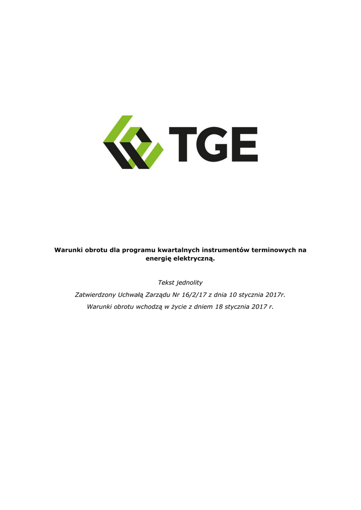 Warunki obrotu dla programu kwartalnych instrumentów terminowych na energię elektryczną. Tekst jednolity Zatwierdzony Uchwałą Zarządu Nr 16/2/17 z dnia 10 stycznia 2017r. Warunki obrotu wchodzą w życie z dniem 18 stycznia 2017 r. Warunki obrotu dla instrumentów terminowych na energię elektryczną Rozdział 1 Wykaz terminów i skrótów użytych w tekście. Członek Giełdy – podmiot posiadający status Członka Giełdy, zgodnie z Regulaminem Giełdy, Dzień Dostawy – dzień, w którym energia zakontraktowana na giełdzie w Dniu Obrotu, zostanie dostarczona lub odebrana, Dzień Obrotu – dzień, kiedy odbywa się sesja RTT w zakresie instrumentów terminowych na energię elektryczną, Dzień wygaśnięcia – ostatni dzień obrotu, giełda – Rynek Towarów Giełdowych, prowadzony przez Towarową Giełdę Energii S.A. zgodnie z Regulaminem Giełdy, Giełda, TGE – Towarowa Giełda Energii S.A., Grafik Pracy – program dostaw lub odbioru energii elektrycznej dla pojedynczej Jednostki Grafikowej, w każdej godzinie terminu wykonania kontraktu terminowego, obejmujący energię zakontraktowaną na RDN oraz RTT, Instrument bazowy – energia elektryczna, której kurs jest określony na RDN zgodnie z zasadami obowiązującymi w Regulaminie Giełdy, Instrument terminowy – instrument terminowy towarowy w rozumieniu Regulaminu Giełdy, Izba Rozliczeniowa – Izba Rozliczeniowa Giełd Towarowych S.A. z siedzibą w Warszawie prowadząca izbę rozliczeniową i rozrachunkową, która pełni funkcję giełdowej izby rozrachunkowej, zgodnie z ustawą o obrocie instrumentami finansowymi, Jednostka Grafikowa – zbiór miejsc dostarczania energii rynku bilansującego prowadzonego przez Polskie Sieci Elektroenergetyczne S.A., Jednostka Grafikowa Udostępniona – Jednostka Grafikowa udostępniana Członkowi Giełdy na zasadach określonych w Regulaminie Giełdy, Kontrakt, kontrakt terminowy – umowa zawarta na RTT, w wyniku której powstają prawa lub obowiązki związane z posiadaniem instrumentów terminowych, Kontrakt tygodniowy – kontrakt terminowy o tygodniowym terminie wykonania, Kurs instrumentu terminowego – określona w momencie zawarcia kontraktu terminowego cena energii elektrycznej w terminie wykonania, MIFID 2 - Dyrektywa Parlamentu Europejskiego i Rady 2014/65/UE z dnia 15 maja 2014 w sprawie rynków instrumentów finansowych oraz zmieniająca dyrektywę 2002/92/WE i dyrektywę 2011/61/UE r. (Dz. Urz. UE L 173 z 12.6.2014) oraz Rozporządzenie Parlamentu Europejskiego i Rady Europy (UE) nr 600/2014 z dnia 15 maja 2014 r. w sprawie rynków instrumentów finansowych oraz zmieniające rozporządzenie (EU) nr 648/2012 (Dz. Urz. UE L 173 z 12.6.2014), Otwarcie pozycji długiej (pozycja długa) – kupno (nabycie) instrumentu terminowego, Otwarcie pozycji terminowego, Portfel – konto Członka Giełdy, do którego przyporządkowana jest co najmniej jedna Jednostka Grafikowa, krótkiej (pozycja krótka) – sprzedaż (zbycie) instrumentu strona 2 Warunki obrotu dla instrumentów terminowych na energię elektryczną Pozycja długa w terminie wykonania kontraktu terminowego – pozycja długa w momencie wygaśnięcia kontraktu terminowego, Pozycja krótka w terminie wykonania kontraktu terminowego – pozycja krótka w momencie wygaśnięcia kontraktu terminowego, Pozycja przeciwstawna - pozycją przeciwstawną do pozycji krótkiej jest pozycja długa dotycząca instrumentów terminowych tej samej serii; pozycją przeciwstawną do pozycji długiej jest pozycja krótka dotycząca instrumentów terminowych tej samej serii, Regulamin Giełdy – Regulamin obrotu Rynku Towarów Giełdowych Towarowej Giełdy Energii S.A., Rozporządzenie – Rozporządzenie Rady Ministrów z dnia 22 grudnia 2009 r. w sprawie szczególnego trybu i warunków wprowadzania do obrotu giełdowego praw majątkowych (Dz. U. z 2010 r., Nr 6, poz. 30), Rynek bazowy – rynek instrumentu bazowego, Rynek Dnia Następnego energii elektrycznej prowadzony przez Giełdę, RDN – wyodrębniony w ramach RDNiB Rynek Dnia Następnego, prowadzony przez Giełdę, RDNiB – Rynek Dnia Następnego i Bieżącego, prowadzony przez Giełdę, RTT– Rynek Terminowy Towarowy prowadzony przez Giełdę, Seria instrumentu terminowego – instrumenty terminowe odpowiadające określonemu przez Giełdę standardowi, charakteryzujące się w szczególności tym samym instrumentem bazowym i tą samą datą wygaśnięcia, system informatyczny giełdy – zespół urządzeń i oprogramowania, w szczególności wyspecjalizowany program komputerowy, za pośrednictwem, którego odbywa się obrót na RTT, Tabela zleceń – uporządkowane zestawienie zleceń kupna i sprzedaży, Transakcja pozasesyjna – umowa sprzedaży instrumentów terminowych zawarta między Członkami Giełdy na giełdzie poza sesją RTT zgodnie z warunkami określonymi w Warunkach obrotu, Ustawa – ustawa z dnia 26 października 2000 r. o giełdach towarowych (Dz. U. z 2014 r., poz. 197, z późn. zm.), ustawa o obrocie instrumentami finansowymi – ustawa z dnia 29 lipca 2005 r. o obrocie instrumentami finansowymi (Dz. U. z 2014 r., poz. 94, z późn. zm.), Wartość kontraktu – kurs instrumentu terminowego lub cena rozliczeniowa pomnożona przez liczbę godzin w terminie wykonania kontraktu, Warunki obrotu – niniejsze Warunki obrotu dla programu tygodniowych instrumentów terminowych na energię elektryczną, Zamknięcie pozycji – zajęcie pozycji odwrotnej w stosunku do pozycji zamykanej, Zamknięcie Portfela – jednoczesne zamknięcie wszystkich pozycji długich i pozycji krótkich w odniesieniu do danego Portfela Członka Giełdy oraz otwarcie tych pozycji w odniesieniu do Portfela innego Członka Giełdy. strona 3 Warunki obrotu dla instrumentów terminowych na energię elektryczną Spis treści Rozdział 1 Wykaz terminów i skrótów użytych w tekście. ......................................... 2 Rozdział 2 Wstęp. .................................