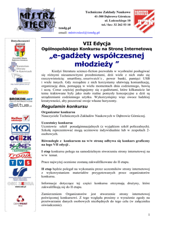 Techniczne Zakłady Naukowe 41-300 Dąbrowa Górnicza ul. Łańcuckiego 10 tel./ fax: 32 262 53 10 tzndg.pl email: [email protected] Dotychczasowi patroni VII Edycja Ogólnopolskiego Konkursu na Stronę Internetową „e-gadżety współczesnej młodzieży ” Kiedyś literatura science-fiction pozwalała w wyobraźni posługiwać się różnymi niesamowitymi przedmiotami, dziś wiele z nich stało się rzeczywistością: smartfony, smartwatch’e , power banki, pamięci USB i wiele innych. Gdy rozsądnie z nich korzystamy ułatwiają komunikację, organizację dnia, pomagają w wielu momentach dnia codziennego, bawią i uczą. Coraz częściej posługujemy się e-gadżetami, które kilkanaście lat temu traktowane były jako mało realne pomysły koncepcyjne a dziś są urządzeniami codziennego użytku. Wykorzystujmy więc owoce ludzkiej kreatywności, aby poszerzać swoje własne horyzonty. Regulamin konkursu Organizator konkursu Nauczyciele Technicznych Zakładów Naukowych w Dąbrowie Górniczej. Uczestnicy konkursu Uczniowie szkół ponadgimnazjalnych (z wyjątkiem szkół policealnych). Szkołę reprezentować mogą uczniowie indywidualnie lub w zespołach 2osobowych. Równolegle z konkursem na w/w stronę odbywa się konkurs graficzny na logo VII edycji . I etap konkursu polega na samodzielnym stworzeniu strony internetowej na w/w temat. Prace najwyżej ocenione zostaną zakwalifikowane do II etapu. II etap będzie polegał na wykonaniu przez uczestników strony internetowej z wykorzystaniem materiałów przygotowanych przez organizatorów konkursu. Informacje dotyczące tej części konkursu otrzymają drużyny, które zakwalifikują się do II etapu. Zamierzeniem Organizatorów jest stworzenie strony internetowej poświęconej konkursowi. Z tego względu prosimy o wyrażenie zgody na przetwarzanie danych osobowych niezbędnych do tego celu (w załączniku oświadczenie). 1 Wymagania dotyczące oddanych prac. Strona powinna być wykonana w języku HTML z wykorzystaniem kaskadowych arkuszy stylu lub PHP. Zastosowane mogą być elementy FLASHa. Strona nie może zawierać apletów JAVY. Wymagane jest napisanie strony uniwersalnie dla przeglądarki INTERNET EXPLORER, MOZILLA FIREFOX, GOOGLE CHROME. Wymagane jest, by strona była wykonana z użyciem oprogramowania licencjonowanego. Zakazane jest używanie gotowych szablonów. Prace wykonane na gotowych szablonach będą zdyskwalifikowane. ZGŁOSZENIA należy przesłać na adres e-mail: : [email protected] - w temacie- zgłoszenie VII edycja Mistrz Sieci -w treści : imiona i nazwiska uczestników, imię i nazwisko opiekuna, nazwę i adres szkoły np. Anna Nowak, Adam Nowy opiekun – Sławomir Kowalski Techniczne Zakłady Naukowe w Dąbrowie Górniczej ul. Łańcuckiego 10 PRACE KONKURSOWE należy przesyłać: - na adres e- mail: [email protected] - w formie spakowanego pliku nazwisko.zip (w nazwie pliku ZIP należy podać nazwiska autorów strony) oraz link do strony opublikowanej na wybranym przez uczestnika serwerze - w temacie: VII edycja Mistrz Sieci - w treści: imiona i nazwiska uczestników, adres email uczestnika imię i nazwisko opiekuna, nazwę i szkoły np. Anna Nowak, Adam Nowy opiekun – Sławomir Kowalski III LO w Katowicach ul. Mikołowska12 Zgłoszenie pracy konkursowej jest równoznaczne ze zgodą na przetwarzanie danych osobowych uczestników konkursu do celów związanych z postępowaniem konkursowym (w tym ogłoszeniem listy uczestników II etapu konkursu). OŚWIADCZENIA dotyczące przetwarzania danych w formie papierowej według załączonego wzoru dostarczają uczestnicy, którzy zakwalifikowali się do II etapu w dniu finału VI edycji konkursu. W przypadku uczestników niepełnoletnich oświadczenie to musi zostać podpisane przez prawnego opiekuna uczestnika. Nie Bądź sztywny stwórz stronę, z której sam chciałbyś korzystać. Zabawa także może być NAUKĄ. 2 Prace konkursowe oceniać będzie komisja w składzie: - mgr Anna Łukasik - doradca metodyczny - mgr Monika Porębska – nauczyciel TZN - mgr inż. Sebastian Bogdal - nauczyciel TZN - mgr inż. Krzysztof Sulej- nauczyciel TZN - mgr Martyna Nowak- nauczyciel TZN - mgr Dariusz Jopek – nauczyciel ZST w Dąbrowie Górniczej - mgr Mariusz Paszkowski- nauczyciel ILO w Dąbrowie Górniczej - mgr Izabela Macuga- nauczyciel IIILO w Dąbrowie Górniczej - mgr Krzysztoł Wołkowski- nauczyciel Gimnazjum nr1 w Dąbrowie Górniczej Uwaga! Sprawdzane będą prace, których treść będzie zgodna z tematem konkursu. - zasady oceniania I ETAPU konkursu Oceniane będzie: Punktacja Poziom merytoryczno - estetyczny Poprawność merytoryczna treści 0-10 Poziom realizacji tematu - aktualność zawartych wiadomości - zrozumiały język przedstawianych treści - własna inicjatywa w realizacji tematu 0-10 0-10 0-10 Szata graficzna (współgrająca z prezentowanym tematem serwisu) 0-10 Przejrzystość (intuicyjny dostęp do prezentowanych treści) 0-10 Poziom techniczny Prawidłowość użytego kodu 0-10 Zaawansowanie zastosowanych języków (ocenie podlega nie tylko rodzaj wykorzystywanego języka lecz poziom jego zaawansowania) 0-10 Właściwa nawigacja 0-5 Poprawność i zaawansowanie wykorzystywanych narzędzi graficznych 0-15 3 Razem Max.100pkt. Prace najwyżej punktowane przechodzą do kolejnego etapu. - Szczegółowe zasady oceniania zadania w II ETAPIE każdy uczestnik otrzyma wraz z treścią zadania konkursowego. - Punkty uzyskane w dwóch etapach przeliczane są na tzw. punkty konkursowe. W V edycji uczestnik może uzyskać maksymalnie 100 punktów (70 punktów w I etapie, 30 punktów II etapie). Laur Mistrza Sieci Opiekunowie uczestników będą mogli , spośród prac zakwalifikowanych do II etapu, wybrać najlepszą , której zostanie przyznany LAUR MISTRZA SIECI Uczestnikom konkursu przysługuje prawo wniesienia pisemnego odwołania w terminie 5 dni od wydania werdyktu przez Komisję Konkursu. Odwołanie należy przesłać na adres: Techniczne Zakł