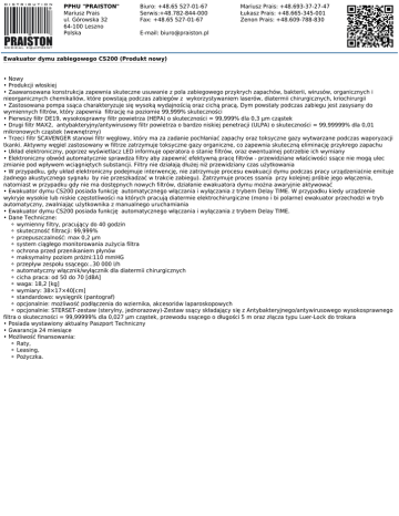 PPHU "PRAISTON" Mariusz Prais ul. Górowska 32 64-100 Leszno Polska Biuro: +48.65 527-01-67 Serwis:+48.782-844-000 Fax: +48.65 527-01-67 Mariusz Prais: +48.693-37-27-47 Łukasz Prais: +48.665-345-001 Zenon Prais: +48.609-788-830 E-mail: [email protected] Ewakuator dymu zabiegowego CS200 (Produkt nowy) • Nowy • Produkcji włoskiej • Zaawansowana konstrukcja zapewnia skuteczne usuwanie z pola zabiegowego przykrych zapachów, bakterii, wirusów, organicznych i nieorganicznych chemikaliów, które powstają podczas zabiegów z wykorzystywaniem laserów, diatermii chirurgicznych, kriochirurgii • Zastosowana pompa ssąca charakteryzuje się wysoką wydajnością oraz cichą pracą. Dym powstały podczas zabiegu jest zasysany do wymiennych filtrów, który zapewnia filtrację na poziomie 99,999% skuteczności • Pierwszy filtr DE19, wysokosprawny filtr powietrza (HEPA) o skuteczności = 99,999% dla 0,3 μm cząstek • Drugi filtr MAX2, antybakteryjny/antywirusowy filtr powietrza o bardzo niskiej penetracji (ULPA) o skuteczności = 99,99999% dla 0,01 mikronowych cząstek (wewnętrzny) • Trzeci filtr SCAVENGER stanowi filtr węglowy, który ma za zadanie pochłaniać zapachy oraz toksyczne gazy wytwarzane podczas waporyzacji tkanki. Aktywny węgiel zastosowany w filtrze zatrzymuje toksyczne gazy organiczne, co zapewnia skuteczną eliminację przykrego zapachu • Układ elektroniczny, poprzez wyświetlacz LED informuje operatora o stanie filtrów, oraz ewentualnej potrzebie ich wymiany • Elektroniczny obwód automatycznie sprawdza filtry aby zapewnić efektywną pracę filtrów - przewidziane właściwości ssące nie mogą ulec zmianie pod wpływem wciągniętych substancji. Filtry nie działają dłużej niż przewidziany czas użytkowania • W przypadku, gdy układ elektroniczny podejmuje interwencję, nie zatrzymuje procesu ewakuacji dymu podczas pracy urządzenia(nie emituje żadnego akustycznego sygnału by nie przeszkadzać w trakcie zabiegu). Zatrzymuje proces ssania przy kolejnej próbie jego włączenia, natomiast w przypadku gdy nie ma dostępnych nowych filtrów, działanie ewakuatora dymu można awaryjnie aktywować • Ewakuator dymu CS200 posiada funkcję automatycznego włączania i wyłączania z trybem Delay TIME. W przypadku kiedy urządzenie wykryje wysokie lub niskie częstotliwości na których pracują diatermie elektrochirurgiczne (mono i bi polarne) ewakuator przechodzi w tryb automatyczny, zwalniając użytkownika z manualnego uruchamiania • Ewakuator dymu CS200 posiada funkcję automatycznego włączania i wyłączania z trybem Delay TIME. • Dane Techniczne: ⚬ wymienny filtry, pracujący do 40 godzin ⚬ skuteczność filtracji: 99,999% ⚬ przepuszczalność: max 0,2 µm ⚬ system ciągłego monitorowania zużycia filtra ⚬ ochrona przed przenikaniem płynów ⚬ maksymalny poziom próżni:110 mmHG ⚬ przepływ zespołu ssącego:..30 000 l/h ⚬ automatyczny włącznik/wyłącznik dla diatermii chirurgicznych ⚬ cicha praca: od 50 do 70 [dBA] ⚬ waga: 18,2 [kg] ⚬ wymiary: 38×17×40[cm] ⚬ standardowo: wysięgnik (pantograf) ⚬ opcjonalnie: możliwość podłączenia do wziernika, akcesoriów laparoskopowych ⚬ opcjonalnie: STERSET-zestaw (sterylny, jednorazowy)-Zestaw ssący składający się z Antybakteryjnego/antywirusowego wysokosprawnego filtra o skuteczności = 99,99999% dla 0,027 μm cząstek, przewodu ssącego o długości 5 m oraz złącza typu Luer-Lock do trokara • Posiada wystawiony aktualny Paszport Techniczny • Gwarancja 24 miesiące • Możliwość finansowania: ⚬ Raty, ⚬ Leasing, ⚬ Pożyczka. www.praiston.pl 06-09-2013, 9:47:13