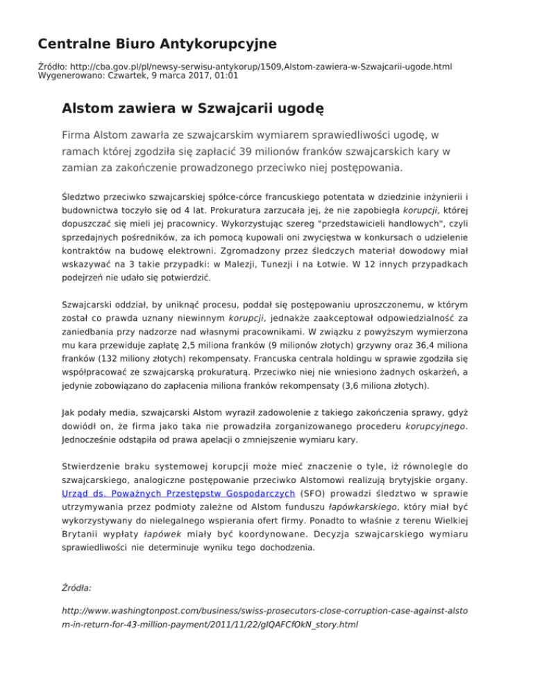 Centralne Biuro Antykorupcyjne Źródło: http://cba.gov.pl/pl/newsy-serwisu-antykorup/1509,Alstom-zawiera-w-Szwajcarii-ugode.html Wygenerowano: Czwartek, 9 marca 2017, 01:01 Alstom zawiera w Szwajcarii ugodę Firma Alstom zawarła ze szwajcarskim wymiarem sprawiedliwości ugodę, w ramach której zgodziła się zapłacić 39 milionów franków szwajcarskich kary w zamian za zakończenie prowadzonego przeciwko niej postępowania. Śledztwo przeciwko szwajcarskiej spółce-córce francuskiego potentata w dziedzinie inżynierii i budownictwa toczyło się od 4 lat. Prokuratura zarzucała jej, że nie zapobiegła korupcji, której dopuszczać się mieli jej pracownicy. Wykorzystując szereg "przedstawicieli handlowych", czyli sprzedajnych pośredników, za ich pomocą kupowali oni zwycięstwa w konkursach o udzielenie kontraktów na budowę elektrowni. Zgromadzony przez śledczych materiał dowodowy miał wskazywać na 3 takie przypadki: w Malezji, Tunezji i na Łotwie. W 12 innych przypadkach podejrzeń nie udało się potwierdzić. Szwajcarski oddział, by uniknąć procesu, poddał się postępowaniu uproszczonemu, w którym został co prawda uznany niewinnym korupcji, jednakże zaakceptował odpowiedzialność za zaniedbania przy nadzorze nad własnymi pracownikami. W związku z powyższym wymierzona mu kara przewiduje zapłatę 2,5 miliona franków (9 milionów złotych) grzywny oraz 36,4 miliona franków (132 miliony złotych) rekompensaty. Francuska centrala holdingu w sprawie zgodziła się współpracować ze szwajcarską prokuraturą. Przeciwko niej nie wniesiono żadnych oskarżeń, a jedynie zobowiązano do zapłacenia miliona franków rekompensaty (3,6 miliona złotych). Jak podały media, szwajcarski Alstom wyraził zadowolenie z takiego zakończenia sprawy, gdyż dowiódł on, że firma jako taka nie prowadziła zorganizowanego procederu korupcyjnego. Jednocześnie odstąpiła od prawa apelacji o zmniejszenie wymiaru kary. Stwierdzenie braku systemowej korupcji może mieć znaczenie o tyle, iż równolegle do szwajcarskiego, analogiczne postępowanie przeciwko Alstomowi realizują brytyjskie organy. Urząd ds. Poważnych Przestępstw Gospodarczych (SFO) prowadzi śledztwo w sprawie utrzymywania przez podmioty zależne od Alstom funduszu łapówkarskiego, który miał być wykorzystywany do nielegalnego wspierania ofert firmy. Ponadto to właśnie z terenu Wielkiej Brytanii wypłaty łapówek miały być koordynowane. Decyzja szwajcarskiego wymiaru sprawiedliwości nie determinuje wyniku tego dochodzenia. Źródła: http://www.washingtonpost.com/business/swiss-prosecutors-close-corruption-case-against-alsto m-in-return-for-43-million-payment/2011/11/22/gIQAFCfOkN_story.html http://www.telegraph.co.uk/finance/financial-crime/8907800/Alstom-in-27m-bribery-settlement.ht ml http://www.ft.com/intl/cms/s/0/1cd17286-1508-11e1-b9b8-00144feabdc0.html Opublikowano 29.11.2011 na www.antykorupcja.du.pl oprac. Wydział Komunikacji Społecznej GSz CBA