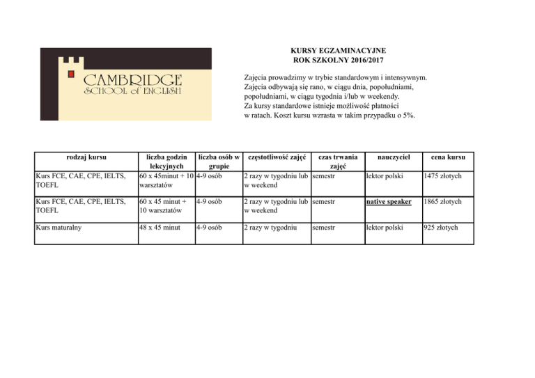 KURSY EGZAMINACYJNE ROK SZKOLNY 2016/2017 Zajęcia prowadzimy w trybie standardowym i intensywnym. Zajęcia odbywają się rano, w ciągu dnia, popołudniami, popołudniami, w ciągu tygodnia i/lub w weekendy. Za kursy standardowe istnieje możliwość płatności w ratach. Koszt kursu wzrasta w takim przypadku o 5%. Kurs FCE, CAE, CPE, IELTS, TOEFL liczba godzin liczba osób w częstotliwość zajęć czas trwania lekcyjnych grupie zajęć 60 x 45minut + 10 4-9 osób 2 razy w tygodniu lub semestr warsztatów w weekend Kurs FCE, CAE, CPE, IELTS, TOEFL 60 x 45 minut + 10 warsztatów 4-9 osób Kurs maturalny 48 x 45 minut 4-9 osób rodzaj kursu nauczyciel cena kursu lektor polski 1475 złotych 2 razy w tygodniu lub semestr w weekend native speaker 1865 złotych 2 razy w tygodniu lektor polski 925 złotych semestr