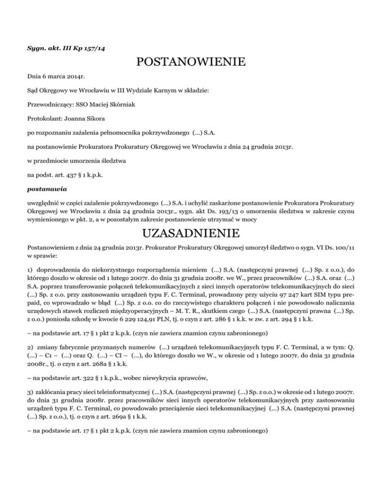 Sygn. akt. III Kp 157/14 POSTANOWIENIE Dnia 6 marca 2014r. Sąd Okręgowy we Wrocławiu w III Wydziale Karnym w składzie: Przewodniczący: SSO Maciej Skórniak Protokolant: Joanna Sikora po rozpoznaniu zażalenia pełnomocnika pokrzywdzonego (...) S.A. na postanowienie Prokuratora Prokuratury Okręgowej we Wrocławiu z dnia 24 grudnia 2013r. w przedmiocie umorzenia śledztwa na podst. art. 437 § 1 k.p.k. postanawia uwzględnić w części zażalenie pokrzywdzonego (...) S.A. i uchylić zaskarżone postanowienie Prokuratora Prokuratury Okręgowej we Wrocławiu z dnia 24 grudnia 2013r., sygn. akt Ds. 193/13 o umorzeniu śledztwa w zakresie czynu wymienionego w pkt. 2, a w pozostałym zakresie postanowienie utrzymać w mocy UZASADNIENIE Postanowieniem z dnia 24 grudnia 2013r. Prokurator Prokuratury Okręgowej umorzył śledztwo o sygn. VI Ds. 100/11 w sprawie: 1) doprowadzenia do niekorzystnego rozporządzenia mieniem (...) S.A. (następczyni prawnej (...) Sp. z o.o.), do którego doszło w okresie od 1 lutego 2007r. do dnia 31 grudnia 2008r. we W., przez pracowników (...) S.A. oraz (...) S.A. poprzez transferowanie połączeń telekomunikacyjnych z sieci innych operatorów telekomunikacyjnych do sieci (...) Sp. z o.o. przy zastosowaniu urządzeń typu F. C. Terminal, prowadzony przy użyciu 97 247 kart SIM typu prepaid, co wprowadzało w błąd (...) Sp. z o.o. co do rzeczywistego charakteru połączeń i nie powodowało naliczania urzędowych stawek rozliczeń międzyoperacyjnych – M. T. R., skutkiem czego (...) S.A. (następczyni prawna (...) Sp. z o.o.) poniosła szkodę w kwocie 6 229 124,91 PLN, tj. o czyn z art. 286 § 1 k.k. w zw. z art. 294 § 1 k.k. – na podstawie art. 17 § 1 pkt 2 k.p.k. (czyn nie zawiera znamion czynu zabronionego) 2) zmiany fabrycznie przyznanych numerów (...) urządzeń telekomunikacyjnych typu F. C. Terminal, a w tym: Q. (...) – C1 – (...) oraz Q. (...) – CI – (...), do którego doszło we W., w okresie od 1 lutego 2007r. do dnia 31 grudnia 2008r., tj. o czyn z art. 268a § 1 k.k. – na podstawie art. 322 § 1 k.p.k., wobec niewykrycia sprawców, 3) zakłócania pracy sieci teleinformatycznej (...) S.A. (następczyni prawnej (...) Sp. z o.o.) w okresie od 1 lutego 2007r. do dnia 31 grudnia 2008r. przez pracowników sieci innych operatorów telekomunikacyjnych przy zastosowaniu urządzeń typu F. C. Terminal, co powodowało przeciążenie sieci telekomunikacyjnej (...) S.A. (następczyni prawnej (...) Sp. z o.o.), tj. o czyn z art. 269a § 1 k.k. – na podstawie art. 17 § 1 pkt 2 k.p.k. (czyn nie zawiera znamion czynu zabronionego) 4) bezprawnego uzyskania dostępu do treści rozmów telefonicznych, przez pracowników spółki (...) S.A. i (...) S.A., którzy obsługiwali transferowanie połączeń telekomunikacyjnych z sieci innych operatorów telekomunikacyjnych do sieci (...) S.A. (następczyni prawnej (...) Sp. z o.o.) przy zastosowaniu urządzeń typu F. C. Terminal, do którego doszło w okresie od dnia 1 lutego 2007r. do dnia 31 grudnia 2008r. we W., tj. o czyn z art. 267 § 1 k.k. – na podstawie art. 17 § 1 pkt 2 k.p.k. (czyn nie zawiera znamion czynu zabronionego) W uzasadnieniu Prokurator wskazał, że zachowanie pracowników (...) S.A. oraz (...) S.A. polegające na transferowaniu połączeń telekomunikacyjnych z sieci innych operatorów telekomunikacyjnych do sieci (...) Sp. z o.o. przy zastosowaniu urządzeń typu F. C. Terminal nie wyczerpało ustawowych znamion przestępstwa z art. 286 § 1 k.k., ani przestępstwa z art. 269a § 1 k.k. Zdaniem organu wywołany błąd systemu pokrzywdzonego nie doprowadził nie niekorzystnego rozporządzenia mieniem, albowiem ewentualna, wynikła z tego zachowania, szkoda pokrzywdzonego ma charakter potencjalnych utraconych korzyści. Odnośnie umorzenia postępowania w sprawie czynu, będącego przedmiotem oceny wypełnienia znamion przestępstwa stypizowanego w art. 269a § 1 k.k., oparł swoją decyzję na uznaniu, że sieć teleinformatyczna nie jest tożsama z pojęciem ujętym w znamionach tego czynu zabronionego – siecią teleinformatyczną, a także uznał, że zakłócenie pracy sieci telekomunikacyjnej nie nastąpiło w istotnym stopniu. Materiał dowodowy zebrany w sprawie nie pozwolił, w ocenie organu śledztwa, na ustalenie, że zachowanie to pozwoliło na dostęp do treści rozmów telefonicznych i wobec tego organ śledztwa uznał, że czynu z art. 267 § 1 k.k. nie został popełniony. Co do czynu stypizowanego w art. 268a § 1 k.k. natomiast wskazał, że wyczerpano możliwości ujawnienia jego sprawcy, w szczególności nie wykryto oprogramowania umożliwiającego zmianę numerów (...). Na powyższe postanowienie w dniu 13 czerwca 2013r. zażalenie złożyła spółka akcyjna (...), zaskarżając je w całości. Zarzuciła obrazę przepisów postępowania, błąd w ustaleniach faktycznych przyjętych za podstawę rozstrzygnięcia oraz naruszenie przepisów prawa materialnego, a w szczególności: a). naruszenie art. 2 § 2, art. 9 §1, art. 167 i art. 197 § 1 kodeksu postępowania karnego, poprzez zaniechanie przeprowadzenia wyczerpującego postępowania przygotowawczego; b). naruszenie art. 92 oraz art. 94 § 1 pkt 5 k.p.k., poprzez sporządzenie uzasadnienia nieodpowiadającego wymaganiom formalnym zakreślonym przez k.p.k.; c). naruszenie art. 7 k.p.k. poprzez niepełną ocenę zgromadzonego w postępowaniu przygotowawczym materiału dowodowego; d). błędną interpretację art. 286 § 1 k.k. polegającą w szczególności na nieprawidłowym zawężeniu zakresu znaczeniowego pojęcia „mienie” zastosowanego w przedmiotowym przepisie, uznaniu, iż po stronie pokrzywdzonego nie powstała – na skutek działania sprawców – szkoda, a także prostym i bezpośrednim powiązaniu pojęcia „niekorzystnego rozporządzenia mieniem” z pojęciem „szkody”; e). błędną interpretację art. 296a § 1 k.k. polegającą w szczególności na uznaniu, iż sieć teleko