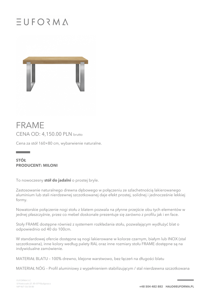 FRAME CENA OD: 4,150.00 PLN brutto Cena za stół 160×80 cm, wybarwienie naturalne. STÓŁ PRODUCENT: MILONI To nowoczesny stół do jadalni o prostej bryle. Zastosowanie naturalnego drewna dębowego w połączeniu ze szlachetnością lakierowanego aluminium lub stali nierdzewnej szczotkowanej daje efekt prostej, solidnej i jednocześnie lekkiej formy. Nowatorskie połączenie nogi stołu z blatem pozwala na płynne przejście obu tych elementów w jednej płaszczyźnie, przez co mebel doskonale prezentuje się zarówno z profilu jak i en face. Stoły FRAME dostępne również z systemem rozkładania stołu, pozwalającym wydłużyć blat o odpowiednio od 40 do 100cm. W standardowej ofercie dostępne są nogi lakierowane w kolorze czarnym, białym lub INOX (stal szczotkowana), inne kolory według palety RAL oraz inne rozmiary stołu FRAME dostępne są na indywidualne zamówienie. MATERIAŁ BLATU – 100% drewno, klejone warstwowo, bez łączeń na długości blatu MATERIAŁ NÓG – Profil aluminiowy z wypełnieniem stabilizującym / stal nierdzewna szczotkowana WYKOŃCZENIE BLATU – Oleje i woski posiadające atest dopuszczający powierzchnie nimi wykończone do kontaktu z żywnością (wg EN1186 – 11/14)lub do stosowania przy produkcji zabawek dziecięcych (wg EN 71-3) WYKOŃCZENIE NÓG – Farba poliestrowa / poliuretanowa Powered by TCPDF (www.tcpdf.org)