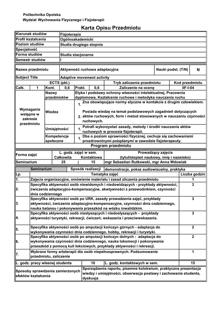 Politechnika Opolska Wydział Wychowania Fizycznego i Fizjoterapii Karta Opisu Przedmiotu Kierunek studiów Profil kształcenia Poziom studiów Specjalność Forma studiów Semestr studiów Fizjoterapia Ogólnoakademicki Studia drugiego stopnia Nazwa przedmiotu Aktywność ruchowa adaptacyjna Subject Title Całk. 1 Wymagania wstępne w zakresie przedmiotu Studia stacjonarne I Nauki podst. (T/N) N Adaptive movement activity ECTS (pkt.) Tryb zaliczenia przedmiotu Kod przedmiotu Kont. 0,6 Prakt. 0,6 Zaliczenie na ocenę IIF-I-04 Nazwy Etyka i podstawy ochrony własności intelektualnej, Pracownia przedmiotów dyplomowa, Kształcenie ruchowe i metodyka nauczania ruchu Zna obowiązujące normy etyczne w kontakcie z drugim człowiekiem. 1. Wiedza Posiada wiedzę na temat podstawowych zagadnień dotyczących 2. aktów ruchowych, form i metod stosowanych w nauczaniu czynności ruchowych. Umiejętności 1. Kompetencje społeczne Potrafi wykorzystać zasady, metody i środki nauczania aktów ruchowych w procesie fizjoterapii. Dba o poziom sprawności fizycznej, cechuje się zachowaniami 1. prozdrowotnymi pożądanymi w zawodzie fizjoterapeuty. Program przedmiotu Forma zajęć Seminarium L. godz. zajęć w sem. Prowadzący zajęcia Całkowita Kontaktowa (tytuł/stopień naukowy, imię i nazwisko) mgr Sebastian Rutkowski, mgr Anna Wdowiak 25 15 | Sposób realizacji demonstracje, pokaz audiowizualny, praktyka Tematyka zajęć Liczba godzin Zajęcia organizacyjne, omówienie materiału i zasad zliczenia przedmiotu 1 Specyfika aktywności osób niewidomych i niedowidzących - przykłady aktywności, 3 ćwiczenia adaptacyjno-kompensacyjne, akwtywności z przewodnikiem, czynności dnia codziennego Specyfika aktywności osób po URK, zasady prowadzenia zajęć, przykłady 3 aktywności, ćwiczenia adaptacyjno-kompensacyjne, czynności dnia codziennego, nauka balansu i pokonywania przeszkód na wózku inwalidzkim. Specyfika aktywności osób niesłyszących i niedosłyszących - przykłady 3 aktywności turystyki, rekreacji, ćwiczeń; wskazania i przeciwwskazania. Seminarium Lp. 1. 2. 3. 4. 5. 6. Specyfika aktywności osób po amputacji kończyn górnych - adaptacja do wykonywania czynności dnia codziennego, hobby, rekreacji i turystyki. Specyfika aktywności osób po amputacji kończyn dolnych - adaptacja do wykonywania czynności dnia codziennego, nauka lokomocji i pokonywania przeszkód z pomocą kuli łokciowych, przykłady aktywności i rekreacji. Wybrane formy arteterapii dla osób niepełnosprawnych. Podsumowanie przedmiotu, zaliczenie 7. 8. L. godz. pracy własnej studenta 2 2 1 10 L. godz. kontaktowych w sem. 15 Sporządzenia raportu, pisemne kolokwium, praktyczna prezentacja Sposoby sprawdzenia zamierzonych wiedzy i umiejętności, obserwacja postawy i zachowania studenta, efektów kształcenia dyskusja KF_W11: posiada wiedzę z zakresu nauczania i pracy z 1. osobami niepełnosprawnymi KF_W15: rozumie i diagnozuje styl życia pod kątem zachowań sportowych i rekreacyjnych KF_W16: posiada wiedzę w zakresie doboru różnych form 3. aktywności ruchowej adaptacyjnej 2. Wiedza KF_W18: posiada poszerzoną wiedzę na temat doboru 4. zaopatrzenia ortopedycznego stosownie do rodzaju dysfunkcji i potrzeb pacjenta Efekty kształcenia dla przedmiotu - po zakończonym cyklu kształcenia KF_U20: promując zdrowie poprzez aktywizację ruchową 1. osób niepełnosprawnych, przeciwdziała patologiom i wykluczeniu społecznemu Umiejętności KF_U21: potrafi przeprowadzić zajęcia obejmujące różne 2. formy aktywności ruchowej KF_U23: samodzielnie modyfikuje i tworzy różne formy 3. aktywności ruchowej w zależności od typu dysfunkcji Kompetencje społeczne KF_K13: swoją postawą motywuje do podejmowania aktywności fizycznej i zdrowego stylu życia 1. Metody dydaktyczne: Pokaz, zajęcia praktyczne, dyskusja, instruktarz, konsultacje Forma i warunki zaliczenia przedmiotu: Zaliczenie na podstawie obecności na zajęciach, sporządzenia raportu, ocen cząstkowych, końcowego kolokwium, praktyczna prezentacja wiedzy i umiejętności, obserwacja postawy i zachowania studenta Literatura podstawowa: [1] Ślężyński J.: Sport w rehabilitacji niepełnosprawnych. Studio wydawnicze AGAT, Kraków 1999 A. Jegier, K. Nazar, A. Dziak (red. ): Medycyna Sportowa. Towarzystwo Medycyny Sportowej ; [2] Warszawa 2005 Migasiewicz J., Bolach E.: Aktywność ruchowa osób niepełnosprawnych. Akademia Wychowania [3] Fizycznego we Wrocławiu, Wrocław 2004 Literatura uzupełniająca: ADAPT Curriculum Europejskie Adaptowana Aktywność Ruchowa [1] http://www.kuleuven.ac.be/thenapa/pdfs/adapt1/poland.pdf ______________ * niewłaściwe przekreślić ………………………………………………….. ………………………………………………………. (kierownik jednostki organizacyjnej/bezpośredni przełożony: pieczęć/podpis (Dziekan Wydziału pieczęć/podpis)