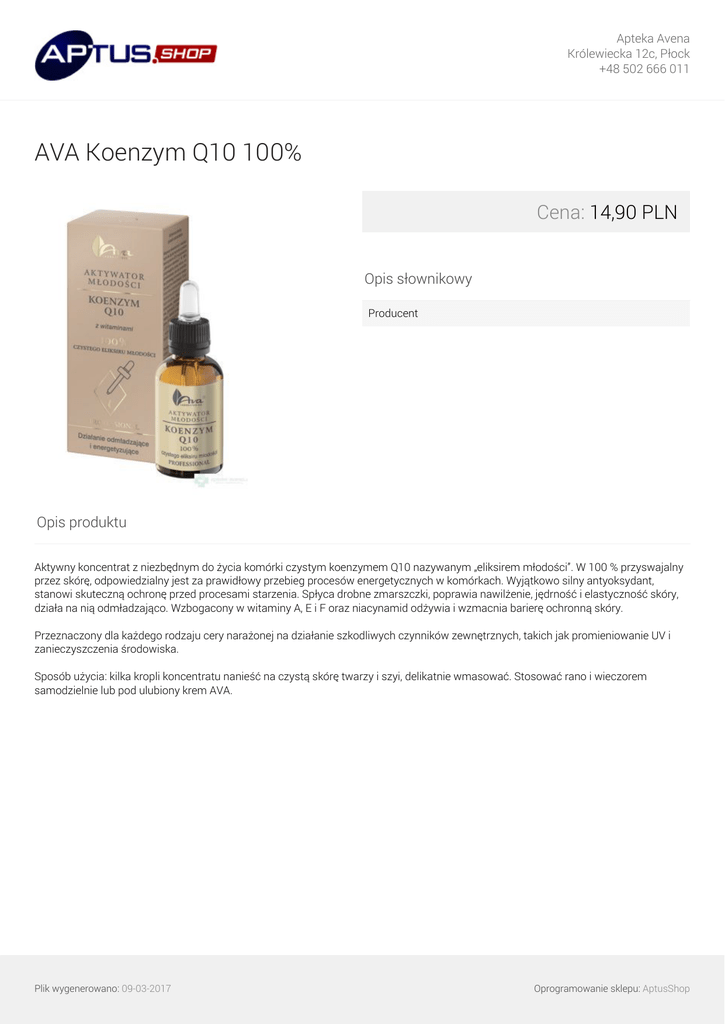 Apteka Avena Królewiecka 12c, Płock +48 502 666 011 AVA Koenzym Q10 100% Cena: 14,90 PLN Opis słownikowy Producent Opis produktu Aktywny koncentrat z niezbędnym do życia komórki czystym koenzymem Q10 nazywanym „eliksirem młodości”. W 100 % przyswajalny przez skórę, odpowiedzialny jest za prawidłowy przebieg procesów energetycznych w komórkach. Wyjątkowo silny antyoksydant, stanowi skuteczną ochronę przed procesami starzenia. Spłyca drobne zmarszczki, poprawia nawilżenie, jędrność i elastyczność skóry, działa na nią odmładzająco. Wzbogacony w witaminy A, E i F oraz niacynamid odżywia i wzmacnia barierę ochronną skóry. Przeznaczony dla każdego rodzaju cery narażonej na działanie szkodliwych czynników zewnętrznych, takich jak promieniowanie UV i zanieczyszczenia środowiska. Sposób użycia: kilka kropli koncentratu nanieść na czystą skórę twarzy i szyi, delikatnie wmasować. Stosować rano i wieczorem samodzielnie lub pod ulubiony krem AVA. Plik wygenerowano: 09-03-2017 Powered by TCPDF (www.tcpdf.org) Oprogramowanie sklepu: AptusShop