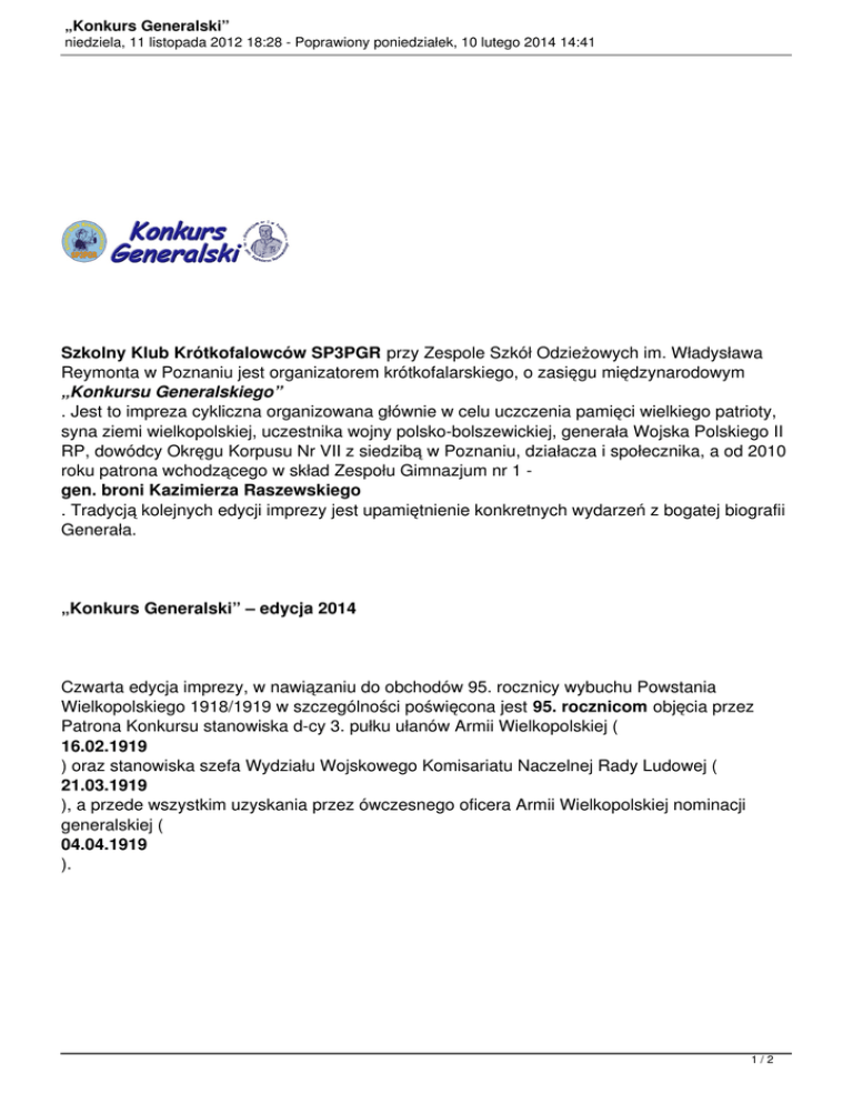 „Konkurs Generalski” niedziela, 11 listopada 2012 18:28 - Poprawiony poniedziałek, 10 lutego 2014 14:41 Szkolny Klub Krótkofalowców SP3PGR przy Zespole Szkół Odzieżowych im. Władysława Reymonta w Poznaniu jest organizatorem krótkofalarskiego, o zasięgu międzynarodowym „Konkursu Generalskiego” . Jest to impreza cykliczna organizowana głównie w celu uczczenia pamięci wielkiego patrioty, syna ziemi wielkopolskiej, uczestnika wojny polsko-bolszewickiej, generała Wojska Polskiego II RP, dowódcy Okręgu Korpusu Nr VII z siedzibą w Poznaniu, działacza i społecznika, a od 2010 roku patrona wchodzącego w skład Zespołu Gimnazjum nr 1 gen. broni Kazimierza Raszewskiego . Tradycją kolejnych edycji imprezy jest upamiętnienie konkretnych wydarzeń z bogatej biografii Generała. „Konkurs Generalski” – edycja 2014 Czwarta edycja imprezy, w nawiązaniu do obchodów 95. rocznicy wybuchu Powstania Wielkopolskiego 1918/1919 w szczególności poświęcona jest 95. rocznicom objęcia przez Patrona Konkursu stanowiska d-cy 3. pułku ułanów Armii Wielkopolskiej ( 16.02.1919 ) oraz stanowiska szefa Wydziału Wojskowego Komisariatu Naczelnej Rady Ludowej ( 21.03.1919 ), a przede wszystkim uzyskania przez ówczesnego oficera Armii Wielkopolskiej nominacji generalskiej ( 04.04.1919 ). 1/2 „Konkurs Generalski” niedziela, 11 listopada 2012 18:28 - Poprawiony poniedziałek, 10 lutego 2014 14:41 Pan minister Stanisław Koziej, przedstawicielem bezpieczeństwem realizowane w okresie i punktów: obronnością od Rzeczypospolitej szef państwa, Biura na Bezpieczeństwa Polskiej Jacka w4.). sprawach Narodowego Behrendta związanych objął będący to przedsięwzięcie zroku do 12 stycznia 2014 kolejny patronatem honorowym, o Jacek czym informuje dokument. już po raz Regulamin Konkursu jest do pobrania tutaj ( wniosek ang .,powyższy niem Konkursu udziela Award Manager Behrendt SQ3OPM Wszelkich [email protected]. informacji dotyczących Wykaz poprawne stacji QSO radiowych 10Prezydenta Organizatora, przyznających Uczestnikom Konkursu za każde SP3FTA, SP3KYY, SP3OL, SP3PL, SP3POZ, SP3ZAC, SP9KJU, SP9PRR, SQ3PON ,. szczegółowe Q3SHHpodsumowania Stutaj O3ALG (ostatnia stacja tylko pasma 80m i 15m). Podsumowanie konkursu, ogłoszenie wyników i wręczenie laureatom nagród miało stycznia podczas wyniki są dotegorocznych pobrania obchodów Święta Patrona Gimnazjum nrSQ3OPM, 1, amiejsce 27 Wspólna fotografia laureatów konkursu. Inf. Jacek Behrendt roku „Konkurs Tegoroczna pierwsze Wojska, i22 do 25 był Pan przedstawicielem bezpieczeństwem Konkursu radiowych a po podsumowanie kwietnia chwili sierpnia współzałożycielem drugie minister podczas które obecnej ponownego Generalskiego, fal Generalski” utworzenia 1923 edycja 1923 krótkich Stanisław obchodzonego miało iAutomobilklubu Prezydenta roku roku iwręczenie obronnością związana miejsce otwarcia wWielkopolskiego i pierwszym –dniach Koziej, konkursu edycja ww nagród jest Rzeczypospolitej Poznaniu przez szkole państwa szef 2013 z prezesem. Wielkopolski, przypadającymi który Generała Laureatom Biura Dnia Klubu zostanie objął Bezpieczeństwa Patrona. Automobilistów nowej honorowym Polskiej którego nastąpi przeprowadzony wsiedziby roku Generał wposprawach 2013 patronatem feriach Narodowego iWielkopolskiego Motocyklistów oddwoma 5zimowych, na związanych dowybranych tegoroczną 13 90. będący stycznia rocznicami, późniejszego, wMuzeum lutym z zakresach edycję 2013 2013 po roku, aż Regulamin Konkursu Wykaz poprawne SP3BVA, Osoby SN0GKR angielskiego Podsumowanie podczas marca ,Święta .Inf.p. tutaj a szczegółowe prof zainteresowane stacji Patronów szkolnych proszone udziela J. SP3FTA, QSO Konkursu Behrendt radiowych lubkonkursu, 5wyniki niemieckiego jego punktów: Szkół obchodów są SP3KYY, jest o Manager są pracą Organizatora, kontakt do do ogłoszenie pobrania pobrania w SP3OL, ale charakterze Jacek z nie p. Behrendtem. jest wyników przyznających tutaj Behrendt SP3PL, to (operatora wymóg ang iSP3POZ, wręczenie SQ3OPM .,Mile niem konieczny Uczestnikom konkursowej widziana SQ3OPM, .).laureatom [email protected]. Wszelkich -:).będzie Konkursu stacji SQ3PON, nagród informacji znajomość okolicznościowej za miało SQ3SHH. każde dotyczących miejsce języka 8 2/2