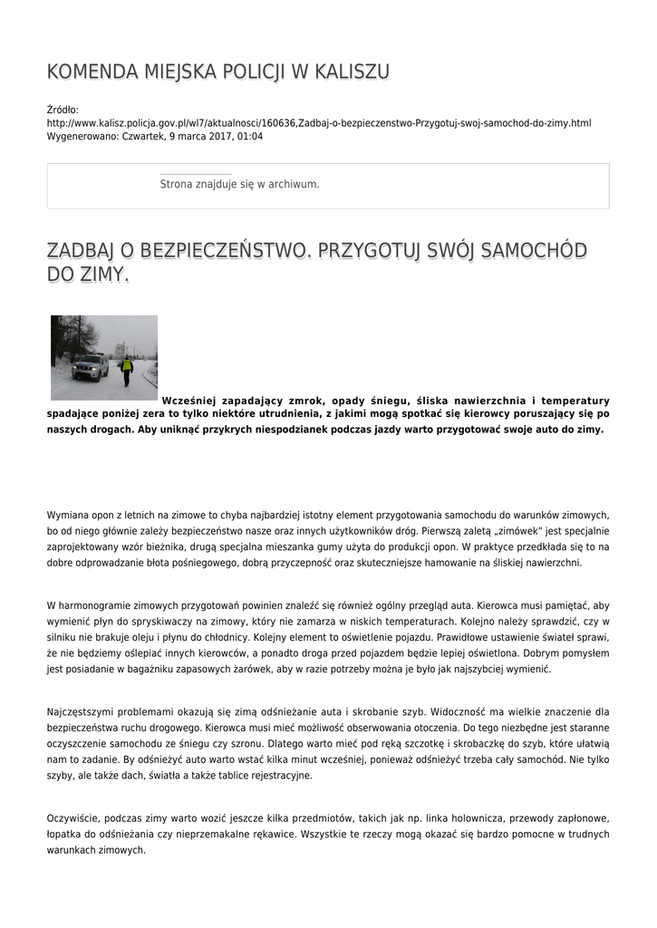 KOMENDA MIEJSKA POLICJI W KALISZU Źródło: http://www.kalisz.policja.gov.pl/wl7/aktualnosci/160636,Zadbaj-o-bezpieczenstwo-Przygotuj-swoj-samochod-do-zimy.html Wygenerowano: Czwartek, 9 marca 2017, 01:04 Strona znajduje się w archiwum. ZADBAJ O BEZPIECZEŃSTWO. PRZYGOTUJ SWÓJ SAMOCHÓD DO ZIMY. Wcześniej zapadający zmrok, opady śniegu, śliska nawierzchnia i temperatury spadające poniżej zera to tylko niektóre utrudnienia, z jakimi mogą spotkać się kierowcy poruszający się po naszych drogach. Aby uniknąć przykrych niespodzianek podczas jazdy warto przygotować swoje auto do zimy. Wymiana opon z letnich na zimowe to chyba najbardziej istotny element przygotowania samochodu do warunków zimowych, bo od niego głównie zależy bezpieczeństwo nasze oraz innych użytkowników dróg. Pierwszą zaletą „zimówek” jest specjalnie zaprojektowany wzór bieżnika, drugą specjalna mieszanka gumy użyta do produkcji opon. W praktyce przedkłada się to na dobre odprowadzanie błota pośniegowego, dobrą przyczepność oraz skuteczniejsze hamowanie na śliskiej nawierzchni. W harmonogramie zimowych przygotowań powinien znaleźć się również ogólny przegląd auta. Kierowca musi pamiętać, aby wymienić płyn do spryskiwaczy na zimowy, który nie zamarza w niskich temperaturach. Kolejno należy sprawdzić, czy w silniku nie brakuje oleju i płynu do chłodnicy. Kolejny element to oświetlenie pojazdu. Prawidłowe ustawienie świateł sprawi, że nie będziemy oślepiać innych kierowców, a ponadto droga przed pojazdem będzie lepiej oświetlona. Dobrym pomysłem jest posiadanie w bagażniku zapasowych żarówek, aby w razie potrzeby można je było jak najszybciej wymienić. Najczęstszymi problemami okazują się zimą odśnieżanie auta i skrobanie szyb. Widoczność ma wielkie znaczenie dla bezpieczeństwa ruchu drogowego. Kierowca musi mieć możliwość obserwowania otoczenia. Do tego niezbędne jest staranne oczyszczenie samochodu ze śniegu czy szronu. Dlatego warto mieć pod ręką szczotkę i skrobaczkę do szyb, które ułatwią nam to zadanie. By odśnieżyć auto warto wstać kilka minut wcześniej, ponieważ odśnieżyć trzeba cały samochód. Nie tylko szyby, ale także dach, światła a także tablice rejestracyjne. Oczywiście, podczas zimy warto wozić jeszcze kilka przedmiotów, takich jak np. linka holownicza, przewody zapłonowe, łopatka do odśnieżania czy nieprzemakalne rękawice. Wszystkie te rzeczy mogą okazać się bardzo pomocne w trudnych warunkach zimowych. Ocena: 0/5 (0) Tweetnij