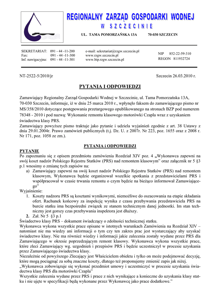 UL. TAMA POMORZAŃSKA 13A SEKRETARIAT: 091 - 44 -11-200 Fax: 091 - 44 -11-300 Inf. nawigacyjna: 091 - 44 -11-301 e-mail: [email protected] www.rzgw.szczecin.pl www.bip.rzgw.szczecin.pl NT-2522-5/2010/jr 70-030 SZCZECIN NIP 852-22-59-310 REGON 811932724 Szczecin 26.03.2010 r. PYTANIA I ODPOWIEDZI Zamawiający Regionalny Zarząd Gospodarki Wodnej w Szczecinie, ul. Tama Pomorzańska 13A, 70-030 Szczecin, informuje, iż w dniu 25 marca 2010 r., wpłynęło faksem do zamawiającego pismo nr MS/358/2010 dotyczące postępowania przetargowego opublikowanego na stronach BZP pod numerem 78348 - 2010 i pod nazwą: Wykonanie remontu klasowego motorówki Czapla wraz z uzyskaniem świadectwa klasy PRS. Zamawiający powyższe pismo traktuje jako pytanie i udziela wyjaśnień zgodnie z art. 38 Ustawy z dnia 29.01.2004r. Prawo zamówień publicznych (t.j. Dz. U. z 2007r. Nr 223, poz. 1655 oraz z 2008 r. Nr 171, poz. 1058 ze zm.). PYTANIA i ODPOWIEDZI PYTANIE Po zapoznaniu się z opisem przedmiotu zamówienia Rozdział XIV poz. 4 „Wykonawca zapewni na swój koszt nadzór Polskiego Rejestru Statków (PRS) nad remontem klasowym” oraz załącznik nr 5 §3 p.1 wnosimy o zmianę tych zapisów na: a) Zamawiający zapewni na swój koszt nadzór Polskiego Rejestru Statków (PRS) nad remontem klasowym, Wykonawca będzie organizował wszelkie spotkania z przedstawicielami PRS i współpracował w czasie trwania remontu o czym będzie na bieżąco informował Zamawiającego” Wyjaśnienie: 1. Koszty nadzoru PRS są kosztami wynikowymi, niemożliwe do oszacowania na etapie składania ofert. Rachunek końcowy za inspekcję wynika z czasu przebywania przedstawiciela PRS na burcie statku ima bezpośredni związek ze stanem technicznym danej jednostki. Im stan techniczny jest gorszy czas przebywania inspektora jest dłuższy. 2. Zał. Nr 5 §3 p.1 Świadectwo klasy PRS – dokument świadczący o zdolności technicznej statku. Wykonawca wykona wszystkie prace opisane w istotnych warunkach Zamówienia na Rozdział XIV – natomiast nie ma wiedzy ani informacji o tym czy ten zakres prac jest wystarczający aby uzyskać świadectwo klasy. Nie ma również wiedzy i informacji jakie zalecenia zostały wydane przez PRS dla Zamawiającego w okresie poprzedzającym remont klasowy. Wykonawca wykona wszystkie prace, które zleci Zamawiający wg. uzgodnień i przepisów PRS i będzie uczestniczył w procesie uzyskania przez Zamawiającego świadectwa klasy. Niezależnie od powyższego Zlecający jest Właścicielem obiektu i tylko on może podejmować decyzję, które mogą pociągnąć za sobą znaczne koszty, dlatego też proponujemy zmienić zapis jak niżej. „Wykonawca zobowiązuje się wykonać przedmiot umowy i uczestniczyć w procesie uzyskania świadectwa klasy PRS dla motorówki Czapla” Wszystkie zalecenia wydane przez PRS i prace z nich wynikające a konieczne do uzyskania klasy statku i nie ujęte w specyfikacji będą wykonane przez Wykonawcę jako prace dodatkowe.” ODPOWIEDŹ NA PYTANIE Zamawiający nie uwzględnia wniosku Wykonawcy i nie wprowadza proponowanych zmian zapisów w Rozdziale XIV „Opis przedmiotu zamówienia” i Załączniku nr 5 w §3 ust.1 „Projekt Umowy”. Zamawiający informuje że jest ustawowo zobowiązany do „opisu przedmiotu zamówienia w sposób jednoznaczny i wyczerpujący, za pomocą dostatecznie dokładnych i zrozumiałych określeń, uwzględniając wszystkie wymagania i okoliczności mogące mieć wpływ na sporządzenie oferty” – art. 29 ust. 1 Ustawy Pzp. Zamawiający szykując ofertę przetargową spełnił wszystkie zapisy art. 29 ust. 1 Ustawy Pzp, i dokonując zapisu w Rozdziale XIV „Wykonawca zapewni na swój koszt nadzór Polskiego Rejestru Statków (PRS) nad remontem klasowym” oraz załączniku nr 5 Projekt Umowy w §3 ust.1 - „Wykonawca zobowiązuje się wykonać przedmiot umowy i dostarczyć Zamawiającemu uzyskane świadectwo klasy PRS dla motorówki „Czapla” w terminie 45 dni od dnia zawarcia umowy.” – uwzględnił wszystkie wymagania i okoliczności mogące mieć wpływ na sporządzenie oferty. Jednocześnie Zamawiający wyjaśnia że na etapie szacowania wartości przedmiotu zamówienia nie miał żadnych trudności z pozyskaniem informacji o ewentualnych kosztach za pełnienia nadzoru oraz kosztach uzyskania świadectwa klasy PRS dla jednostki typu „motorówka Czapla”. Powyższe informacje Wykonawca może uzyskać w siedzibie PRS, na podstawia zgromadzonej tam dokumentacji dotyczącej jednostek pływających Zamawiającego, oraz Taryfy Opłat PRS, Tom – 3 (opłaty za nadzór nad jednostkami śródlądowymi, …. ), otrzymana informacja powinna pozwolić Wykonawcy na poprawne skalkulowanie kosztu nadzoru i otrzymania świadectwa klasy PRS które musi ująć w swojej ofercie przetargowej. Zamieszczono na stronie Zamawiającego w dniu 26.03.2010 r.