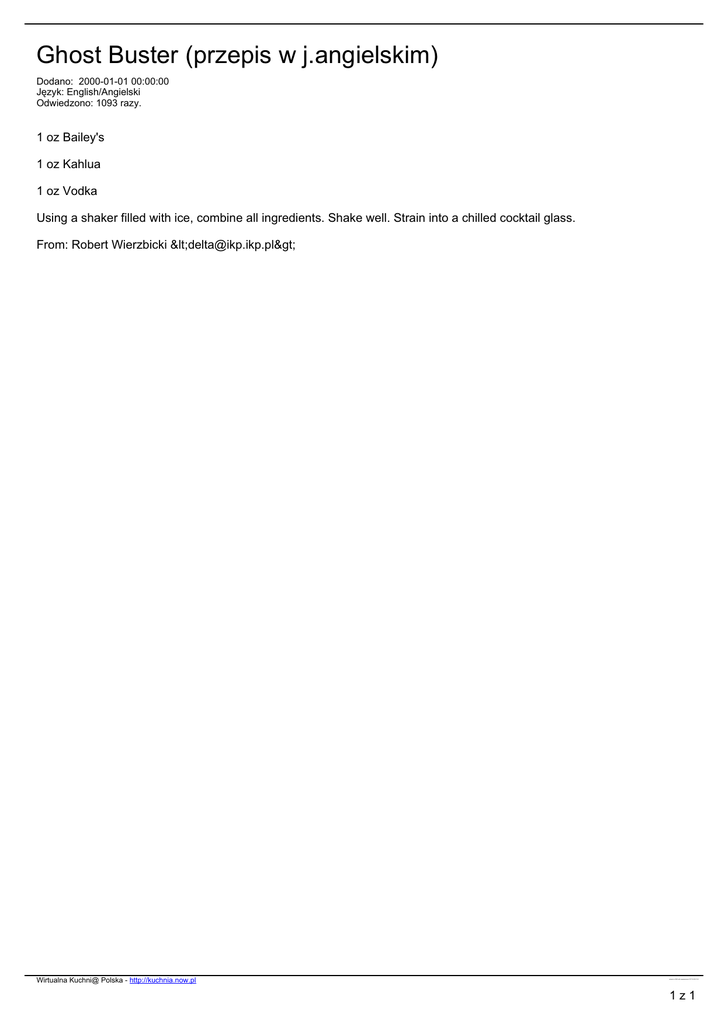 Ghost Buster (przepis w j.angielskim) Dodano: 2000-01-01 00:00:00 Język: English/Angielski Odwiedzono: 1093 razy. 1 oz Bailey's 1 oz Kahlua 1 oz Vodka Using a shaker filled with ice, combine all ingredients. Shake well. Strain into a chilled cocktail glass. From: Robert Wierzbicki <[email protected]> Wirtualna Kuchni@ Polska - http://kuchnia.now.pl przepis nr 3843, plik wygenerowano 2017.03.09 01:04 1z1