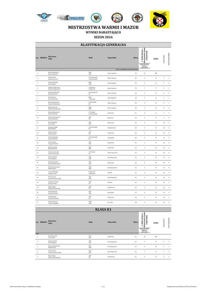 MISTRZOSTWA WARMII I MAZUR WYNIKI NARASTAJĄCO SEZON 2016 strata do lidera strata do poprzedniego 1. Rally Sprint o Mistrzostwo Ziemi Lubawskiej KLASYFIKACJA GENERALNA 1 Łukasz Markiewicz Marcin Majewski OKR OKR Subaru Impreza K4 10 10 2 Kamil Piaścik Sebastian Piaścik A. Nowomiejski A. Nowomiejski Subaru Impreza K4 9 9 1 1 3 Paweł Cichowski Artur Chudek MSM MSM Audi A4 Quattro K4 8 8 2 1 4 Andrzej Pauperowicz Ewelina Pauperowicz A. Mazurski A. Mazurski Subaru Impreza K4 7 7 3 1 5 Marek Kwiatkowski Paweł Ankiewicz A. Nowomiejski NZ Subaru Impreza K4 6 6 4 1 6 Paweł Samsel Marcin Borowski MSM A. Mazurski Audi A4 Quattro K4 5 5 5 1 7 Marek Aszkiełowicz Krzysztof Pawłowski A. Warmiński NZ Subaru Impreza K4 4 4 6 1 8 Bartosz Piasecki Andrzej Tomaszewski OKR OKR Subaru Impreza K4 3 2 8 2 9 Mateusz Bojanowski Oskar Olszewski A. Toruński A. Nowomiejski Ford Fiesta K3 2 3 7 -1 10 Krzysztof Samulewicz Marcin Budziński OKR NZ Opel Corsa K3 1 1 9 2 11 Karol Kaczyński Artur Haska LKR LKR Honda Civic K1 0 0 10 1 12 Radosław Hoppe Michał Meller A. Nowomiejski NZ Mitsubishi Colt K2 0 0 10 0 13 Mateusz Zapora Łukasz Zapora LKR NZ Honda Civic K3 0 0 10 0 14 Daniel Godlewski Anna Godlewska A. Nowomiejski NZ Peugeot206 K3 0 0 10 0 15 Piotr Burdach Grzegorz Burdach LKR LKR Honda Civic K2 0 0 10 0 16 Marcin Turulski Rafał Ankiewicz LKR LKR Honda Civic K2 0 0 10 0 17 Tomasz Laskowski Dariusz Piotrowski A. Toruński NZ Nissan Sunny GTI K3 0 0 10 0 18 Krystian Wyżlic Paweł Długosz LKR LKR Fiat Cinquecento K1 0 0 10 0 19 Marek Korpowski Karolina Maliszewska LKR LKR Honda Civic K2 0 0 10 0 20 Słwomir Kurpiewski Rałfał Raczko OKR OKR Fiat Cinquecento K1 0 0 10 0 21 Tomasz Śliwiński Jarosław Fusek A. Mazurski A. Mazurski VW Golf K3 0 0 10 0 22 Piotr Fraczek Jarosław Przyborowski LKR LKR Fiat Cinquecento K1 0 0 10 0 23 Arkadiusz Prusiak Cezary Prusiak OKR NZ VW Golf K4 0 0 10 0 24 Hubert Sągal Sebastian Grabarczyk LKR NZ Fiat Seicento K1 0 0 10 0 25 Adam Radomski Sebastian Piaścik LKR OKR Opel Kadett K3 0 0 10 0 26 Kamil Jedynak Antoni Parchowski LKR NZ Honda Civic K2 0 0 10 0 27 Zdzisław Raczko Tomasz Mendelski OKM OKM Fiat 125p HR 0 0 10 0 SUMA Lp. MIEJSCE Kierowca Pilot Klub Samochód Klasa SUMA Lubawski Klub Rajdowy 13.03.2016 ilość uczestników na liście startowej : strata do lidera Kierowca Pilot strata do poprzedn. Lp. MIEJSCE 1. Rally Sprint o Mistrzostwo Ziemi Lubawskiej KLASA K1 K1 10 10 Fiat Cinquecento K1 9 9 1 1 OKR OKR Fiat Cinquecento K1 8 8 2 1 LKR LKR Fiat Cinquecento K1 7 7 3 1 LKR NZ Fiat Seicento K1 6 6 4 1 Klub Samochód Klasa Lubawski Klub Rajdowy 13.03.2016 ilość 1 Karol Kaczyński Artur Haska LKR LKR 2 Krystian Wyżlic Paweł Długosz LKR LKR 3 Słwomir Kurpiewski Rałfał Raczko 4 Piotr Fraczek Jarosław Przyborowski 5 Hubert Sągal Sebastian Grabarczyk Mistrzostwa Warmii i Mazur - klasyfikacja narastająco Honda Civic 1z2 Przygotowane przez OKSS przy ZO PZm w OLsztynie Klub strata do lidera Kierowca Pilot strata do poprzedn. Lp. MIEJSCE 1. Rally Sprint o Mistrzostwo Ziemi Lubawskiej KLASA K2 K2 10 10 Honda Civic K2 9 9 1 1 Honda Civic K2 8 8 2 1 Honda Civic K2 7 7 3 -7 Honda Civic K2 6 6 4 1 SUMA Samochód Klasa SUMA Lubawski Klub Rajdowy 13.03.2016 ilość 1 Radosław Hoppe Michał Meller A. Nowomiejski NZ 2 Piotr Burdach Grzegorz Burdach LKR LKR 3 Marcin Turulski Rafał Ankiewicz LKR LKR 4 Marek Korpowski Karolina Maliszewska LKR LKR 5 Kamil Jedynak Antoni Parchowski LKR NZ Mitsubishi Colt strata do lidera strata do poprzedn. 1. Rally Sprint o Mistrzostwo Ziemi Lubawskiej KLASA K3 1 Mateusz Bojanowski Oskar Olszewski A. Toruński A. Nowomiejski Ford Fiesta K3 10 10 2 Krzysztof Samulewicz Marcin Budziński OKR NZ Opel Corsa K3 9 9 1 1 3 Mateusz Zapora Łukasz Zapora LKR NZ Honda Civic K3 8 8 2 1 4 Daniel Godlewski Anna Godlewska A. Nowomiejski NZ Peugeot206 K3 7 6 4 2 5 Tomasz Laskowski Dariusz Piotrowski A. Toruński NZ Nissan Sunny GTI K3 6 7 3 -1 6 Tomasz Śliwiński Jarosław Fusek A. Mazurski A. Mazurski VW Golf K3 5 5 5 2 7 Adam Radomski Sebastian Piaścik LKR OKR Opel Kadett K3 4 4 6 1 SUMA Lp. MIEJSCE Kierowca Pilot Klub Samochód Klasa Lubawski Klub Rajdowy 13.03.2016 ilość strata do lidera strata do poprzedn. 1. Rally Sprint o Mistrzostwo Ziemi Lubawskiej KLASA K4 1 Łukasz Markiewicz Marcin Majewski OKR OKR Subaru Impreza K4 10 10 2 Kamil Piaścik Sebastian Piaścik A. Nowomiejski A. Nowomiejski Subaru Impreza K4 9 9 1 1 3 Paweł Cichowski Artur Chudek MSM MSM Audi A4 Quattro K4 8 8 2 1 4 Andrzej Pauperowicz Ewelina Pauperowicz A. Mazurski A. Mazurski Subaru Impreza K4 7 7 3 1 5 Marek Kwiatkowski Paweł Ankiewicz A. Nowomiejski NZ Subaru Impreza K4 6 6 4 1 6 Paweł Samsel Marcin Borowski MSM A. Mazurski Audi A4 Quattro K4 5 5 5 1 7 Marek Aszkiełowicz Krzysztof Pawłowski A. Warmiński NZ Subaru Impreza K4 4 4 6 1 8 Bartosz Piasecki Andrzej Tomaszewski OKR OKR Subaru Impreza K4 3 3 7 -3 9 Arkadiusz Prusiak Cezary Prusiak OKR NZ VW Golf K4 2 2 8 1 Lp. MIEJSCE Kierowca Pilot Klub Samochód Klasa Lubawski Klub Rajdowy 13.03.2016 ilość strata do lidera strata do poprzedn. strata do lidera strata do poprzedn. 1. Rally Sprint o Mistrzostwo Ziemi Lubawskiej KLASA HR 1 Marcin Kurp Karol Cichowicz A. Warmiński A. Warmiński Honda Civic Gość 10 10 2 Wojciech Jacyszyn Michał Macuk OKR NZ Ford Puma Gość 9 9 1 1 3 Emil Konopiński Patryk Cząstka A. Warmiński A. Warmiński Honda Civic Gość 8 8 2 1 Lp. MIEJSCE Kierowca Pilot Klub Samochód Klasa SUMA Lubawski Klub Rajdowy 13.03.2016 ilość 1 Zdzisław Raczko Tomasz Mendelski OKM OKM Fiat 125p HR 10 10 Lp. MIEJSCE Kierowca Pilot Klub Samochód Klasa 1. Rally Sprint o Mistrzostwo Ziemi Lubawskiej KLASA GOŚĆ SUMA Lubawski Klub Rajdowy 13.03.2016 ilość Mistrzostwa Warmii i Mazur - klasyfikacja narastająco 2z2 Przygotowane przez OKSS przy ZO PZm w OLsztynie