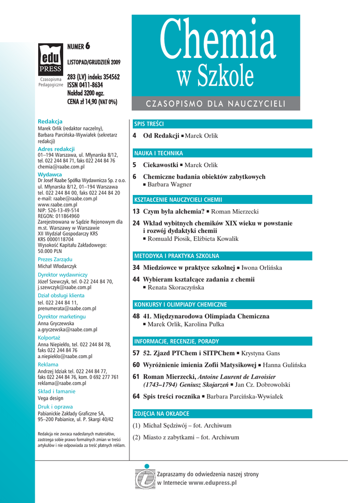 Chemia NUMER 6 LISTOPAD/GRUDZIEŃ 2009 Czasopisma Pedagogiczne w Szkole 283 (LV) indeks 354562 ISSN 0411-8634 Nakład 3200 egz. CENA zł 14,90 (VAT 0%) Redakcja Marek Orlik (redaktor naczelny), Barbara Parcińska-Wywiałek (sekretarz redakcji) Adres redakcji 01–194 Warszawa, ul. Młynarska 8/12, tel. 022 244 84 71, faks 022 244 84 76 [email protected] Wydawca Dr Josef Raabe Spółka Wydawnicza Sp. z o.o. ul. Młynarska 8/12, 01–194 Warszawa tel. 022 244 84 00, faks 022 244 84 20 e-mail: [email protected] www.raabe.com.pl NIP: 526-13-49-514 REGON: 011864960 Zarejestrowana w Sądzie Rejonowym dla m.st. Warszawy w Warszawie XII Wydział Gospodarczy KRS KRS 0000118704 Wysokość Kapitału Zakładowego: 50.000 PLN Prezes Zarządu Michał Włodarczyk Dyrektor wydawniczy Józef Szewczyk, tel. 0-22 244 84 70, [email protected] Dział obsługi klienta tel. 022 244 84 11, [email protected] Dyrektor marketingu Anna Gryczewska [email protected] Kolportaż Anna Niepiekło, tel. 022 244 84 78, faks 022 244 84 76 [email protected] Reklama Andrzej Idziak tel. 022 244 84 77, faks 022 244 84 76, kom. 0 692 277 761 [email protected] Skład i łamanie Vega design Druk i oprawa Pabianickie Zakłady Graficzne SA, 95–200 Pabianice, ul. P. Skargi 40/42 CZASOPISMO DLA NAUCZYCIELI SPIS TREŚCI 4 Od Redakcji n Marek Orlik NAUKA I TECHNIKA 5 Ciekawostki 6 Chemiczne badania obiektów zabytkowych n Barbara Wagner n Marek Orlik KSZTAŁCENIE NAUCZYCIELI CHEMII 13 Czym była alchemia? n Roman Mierzecki 24 Wkład wybitnych chemików XIX wieku w powstanie i rozwój dydaktyki chemii n Romuald Piosik, Elżbieta Kowalik METODYKA I PRAKTYKA SZKOLNA 34 Miedziowce w praktyce szkolnej n Iwona Orlińska 44 Wybieram kształcące zadania z chemii n Renata Skoraczyńska KONKURSY I OLIMPIADY CHEMICZNE 48 41. Międzynarodowa Olimpiada Chemiczna n Marek Orlik, Karolina Pułka INFORMACJE, RECENZJE, PORADY 57 52. Zjazd PTChem i SITPChem n Krystyna Gans 60 Wyróżnienie imienia Zofii Matysikowej n Hanna Gulińska 61 Roman Mierzecki, Antoine Laurent de Lavoisier (1743–1794) Geniusz Skojarzeń n Jan Cz. Dobrowolski 64 Spis treści rocznika n Barbara Parcińska-Wywiałek ZDJĘCIA NA OKŁADCE (1) Michał Sędziwój – fot. Archiwum Redakcja nie zwraca nadesłanych materiałów, zastrzega sobie prawo formalnych zmian w treści artykułów i nie odpowiada za treść płatnych reklam. (2) Miasto z zabytkami – fot. Archiwum Zapraszamy do odwiedzenia naszej strony w Internecie www.edupress.pl