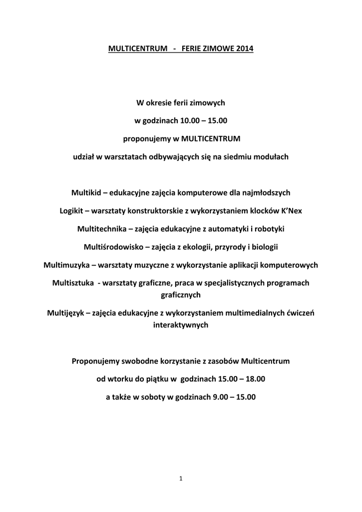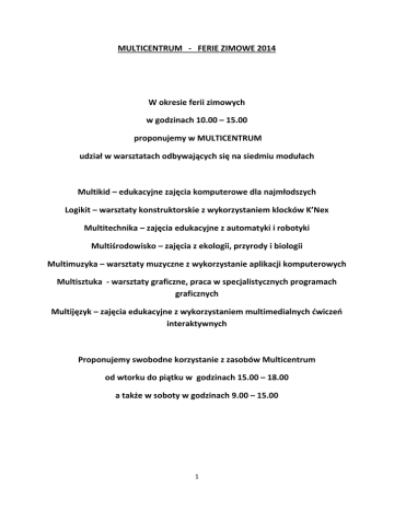 MULTICENTRUM - FERIE ZIMOWE 2014 W okresie ferii zimowych w godzinach 10.00 – 15.00 proponujemy w MULTICENTRUM udział w warsztatach odbywających się na siedmiu modułach Multikid – edukacyjne zajęcia komputerowe dla najmłodszych Logikit – warsztaty konstruktorskie z wykorzystaniem klocków K’Nex Multitechnika – zajęcia edukacyjne z automatyki i robotyki Multiśrodowisko – zajęcia z ekologii, przyrody i biologii Multimuzyka – warsztaty muzyczne z wykorzystanie aplikacji komputerowych Multisztuka - warsztaty graficzne, praca w specjalistycznych programach graficznych Multijęzyk – zajęcia edukacyjne z wykorzystaniem multimedialnych ćwiczeń interaktywnych Proponujemy swobodne korzystanie z zasobów Multicentrum od wtorku do piątku w godzinach 15.00 – 18.00 a także w soboty w godzinach 9.00 – 15.00 1 PONIEDZIAŁEK 20.01 i 27.01 MultiCentrum przyjmuje grupy zorganizowane: 9.00 – 10.00 – dzieci i młodzież z BCK 10.30 – 11.30 – dzieci i młodzież z „ Eureki” i Filii Biblioteki nr 6 12.00 – 13.00 – dzieci i młodzież ze „Sceny” 13.00 – 14.00 – dzieci, młodzież i Kluby Seniora z „Piasta” Pozostałe osoby, które w tym dniu odwiedzą MultiCentrum, zostaną dołączone do zajęć grupowych. WTOREK – 21.01 10.00 – 11.00 Technika ( od 9 lat ) „Ploter – kwiatek dla babci i dziadka” 10.00 – 11.00 Multiśrodowisko ( 7 – 9 lat ) „Zwierzęta mórz i oceanów” 11.00 – 12.00 Logikit ( od 7 lat ) „Konstrukcje z klocków K’nex” 12.00 – 13.00 Multimuzyka ( od 7 lat ) „Śpiewać każdy może” 2 13.00 – 14.00 Multidzieciak ( 4 – 6 lat ) „Cztery pory roku” 13.00 – 14.00 Multisztuka ( od 7 lat ) „Laurka dla Babci” 13.00 – 15.00 Warsztaty robotyczne ( od 10 lat ) ŚRODA – 22.01 10.00 – 11.00 Multitechnika ( od 9 lat ) „Czy robot widzi i czuje?” 10.00 – 11.00 Multisztuka ( od 7 lat ) „Karnawałowe maski” 11.00 – 12.00 Logikit ( od 7 lat ) „Konstrukcje z klocków K’nex” 12.00 – 13.00 Multijęzyk ( 6 - 8 lat ) „My house – czyli jak mieszkam” 3 13.00 – 14.00 MultiDzieciak ( od 4 – 6 lat ) „Dlaczego warto segregować śmieci” 14.00 – 15.00 Multimuzyka ( od 7 lat ) „Karnawałowe rytmy na bum bum rurkach” 13.00 – 15.00 Warsztaty robotyczne ( od 10 lat ) CZWARTEK 23.01 10.00 – 11.00 Multitechnika ( od 9 lat ) „Recykling i sortowanie” 10.00 – 11.00 Multiśrodowisko ( 7 - 9 lat ) „Co kryje moje wnętrze” 11.00 – 12.00 Logikit ( od 7 lat ) „Konstrukcje z klocków K’nex” 12.00 – 13.00 Multisztuka ( od 7 lat ) „Kaligrafia” 4 13.00 – 14.00 MultiDzieciak ( od 4 – 6 lat ) „Rytmika dla smyka” 14.00 – 15.00 Multijęzyk ( od 10 lat ) „Winter fun” 13.00 – 15.00 Warsztaty robotyczne ( od 10 lat ) PIĄTEK – 24.01 10.00 – 11.00 Multitechnika ( od 9 lat ) „Robot w magazynie - czy może pomóc?” 11.00 – 12.00 Logikit ( od 7 lat ) „Konstrukcje z klocków K’nex” 12.00 – 13.00 Multimuzyka ( 4 – 6 lat ) „Rytmika dla smyka” 13.00 – 14.00 Multijęzyk ( 7 - 9 lat ) „At the restaurant” 5 13.00 – 14.00 Multidzieciak ( 4 - 6 lat ) „Mój przyjaciel” 14.00 – 15.00 Multiśrodowisko ( od 8 lat ) „W świecie mikroskopii optycznej” 13.00 – 15.00 Warsztaty robotyczne ( od 10 lat ) WTOREK – 28.01 10.00 – 11.00 Multitechnika ( od 9 lat ) „Lotnisko - transportujemy bagaże” 10.00 – 11.00 Multiśrodowisko ( 7 - 9 lat ) „Zielona energia” 11.00 – 12.00 Logikit ( od 7 lat ) „Konstrukcje z klocków K’nex” 12.00 – 13.00 Multimuzyka ( od 7 lat ) „Dzwonek na komórkę” 13.00 – 14.00 Multidzieciak ( od 4 – 6 lat ) „Świat kolorów” 6 13.00 – 14.00 Multisztuka ( od 7 lat ) „Kolaż komputerowy jest OK” 13.00 – 15.00 Warsztaty robotyczne ( od 10 lat ) ŚRODA – 29.01 10.00 – 11.00 Multitechnika ( od 9 lat ) „Produkujemy oranżadę” 10.00 – 11.00 Multisztuka ( od 7 lat ) „Wędrowanie po ekranie” 11.00 – 12.00 Logikit ( od 7 lat ) „Konstrukcje z klocków K’nex” 12.00 – 13.00 Multijęzyk (7 - 9 lat ) „Tongue twisters” 13.00 – 14.00 Multidzieciak ( 4 – 6 lat ) „Zdrowie na talerzu” 7 14.00 – 15.00 Multimuzyka ( od 7 lat ) „Przybij rurkę” 13.00 – 15.00 Warsztaty robotyczne ( od 10 lat ) CZWARTEK – 30.01 10.00 – 11.00 Multitechnika ( od 9 lat ) „W fabryce samochodów” 10.00 – 11.00 Multiśrodowisko ( 7 - 9 lat ) „Liść – fabryka pokarmu” 11.00 – 12.00 Logikit ( od 7 lat ) „Konstrukcje z klocków K’nex” 12.00 – 13.00 Multisztuka ( od 7 lat ) „Zadziwiające portrety” 13.00 – 14.00 Multidzieciak ( 4 – 6 lat ) „Rytmika dla smyka” 8 14.00 – 15.00 Multijęzyk ( od 10 lat ) „Fun and games in english” 13.00 – 15.00 Warsztaty robotyczne ( od 10 lat ) PIĄTEK – 31.01 10.00 – 11.00 Multitechnika ( od 9 lat ) „Ploter - własny projekt graficzny” 11.00 – 12.00 Logikit ( od 7 lat ) „Konstrukcje z klocków K’nex” 12.00 – 13.00 Multimuzyka ( 4 -6 lat ) „Rytmika dla smyka” 13.00 – 14.00 Multijęzyk ( 7 -9 lat ) „At the restaurant” 9 13.00 – 14.00 Multidzieciak ( 4 – 6 lat ) „W krainie lodu” 14.00 – 15.00 Multiśrodowisko ( od 8 lat ) „Dlaczego widzę i słyszę” 13.00 – 15.00 Warsztaty robotyczne ( od 10 lat ) 10