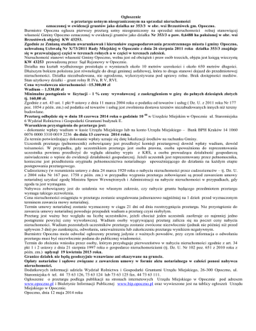 Ogłoszenie o przetargu ustnym nieograniczonym na sprzedaż nieruchomości oznaczonej w ewidencji gruntów jako działka nr 353/3 w obr. wsi Brzustówek gm. Opoczno. Burmistrz Opoczna ogłasza pierwszy przetarg ustny nieograniczony na sprzedaż nieruchomości rolnej stanowiącej własność Gminy Opoczno oznaczonej w ewidencji gruntów jako działka Nr 353/3 o pow. 0,6488 ha położonej w obr. wsi Brzustówek objętej KW 43253. Zgodnie ze Zmianą studium uwarunkowań i kierunków zagospodarowania przestrzennego miasta i gminy Opoczno, uchwaloną Uchwałą Nr X/73/2011 Rady Miejskiej w Opocznie z dnia 26 sierpnia 2011 roku działka 353/3 znajduje się w przeważającej części w terenach rolnych a w części w terenach zalesień. Nieruchomość stanowi własność Gminy Opoczno, wolna jest od obciążeń i praw osób trzecich, objęta jest księgą wieczystą KW 43253 prowadzoną przez Sąd Rejonowy w Opocznie. Działka ma kształt wydłużonego prostokąta o wymiarach około 10 metrów szerokości i około 650 metrów długości. Dłuższym bokiem położona jest równolegle do drogi gminnej asfaltowej, która to droga stanowi dojazd do przedmiotowej nieruchomości. Działka niezabudowana, nie ogrodzona, wykorzystywana pod uprawy rolne. Brak dostępności mediów. Stan użytkowy działki – grunt rolny R IVa, R V, RVI. Cena wywoławcza nieruchomości –15.300,00 zł Wadium – 1.530,00 zł Minimalne postąpienie w licytacji – 1 % ceny wywoławczej z zaokrągleniem w górę do pełnych dziesiątek złotych tj. 160,00 zł. Zgodnie z art. 43 ust. 1 pkt 9 ustawy z dnia 11 marca 2004 roku o podatku od towarów i usług ( Dz. U. z 2011 roku Nr 177 poz. 1054 z późn. zm.) od podatku od towarów i usług jest zwolniona dostawa terenów niezabudowanych innych niż tereny budowlane. Przetarg odbędzie się w dniu 18 czerwca 2014 roku o godzinie 10 00 w Urzędzie Miejskim w Opocznie ul. Staromiejska 6 Wydział Rolnictwa i Gospodarki Gruntami budynek E. Warunkiem przystąpienia do przetargu jest: - dokonanie wpłaty wadium w kasie Urzędu Miejskiego lub na konto Urzędu Miejskiego – Bank BPH Kraków 14 1060 0076 0000 3310 0019 2236 do dnia 13 czerwca 2014 roku. Za termin potwierdzający dokonanie wpłaty uznaje się datę lokalizacji środków na rachunku Gminy. Uczestnik przetargu (pełnomocnik) zobowiązany jest przedłożyć komisji przetargowej dowód wpłaty wadium, dowód tożsamości. W przypadku, gdy uczestnikiem przetargu jest osoba prawna, osoba upoważniona do reprezentowania uczestnika powinna przedłożyć do wglądu aktualny wypis z KRS, a osoba prowadząca działalność gospodarczą zaświadczenie o wpisie do ewidencji działalności gospodarczej. Jeżeli uczestnik jest reprezentowany przez pełnomocnika, konieczne jest przedłożenia oryginału pełnomocnictwa notarialnego upoważniającego do działania na każdym etapie postępowania przetargowego. Cudzoziemcy (w rozumieniu ustawy z dnia 24 marca 1920 roku o nabyciu nieruchomości przez cudzoziemców – tj. Dz. U. z 2004 roku Nr 167 poz. 1758 z późn. zm.) w przypadku wygrania przetargu zobowiązani są przed zawarciem umowy notarialnej uzyskać zgodę Ministra Spraw Wewnętrznych i Administracji na nabycie nieruchomości w przypadkach, gdy zgoda ta jest wymagana. Nabywca zobowiązany jest do ustalenia we własnym zakresie, czy nabycie gruntu będącego przedmiotem przetargu wymaga takiego zezwolenia. Cena nieruchomości osiągnięta w przetargu zostanie uregulowana jednorazowo najpóźniej na 1 dzień przed wyznaczonym terminem zawarcia mowy notarialnej. Termin umowy notarialnej zostanie wyznaczony w ciągu 21 dni od dnia rozstrzygnięcia przetargu. Nie przystąpienie do zawarcia umowy notarialnej powoduje przepadek wadium a przetarg czyni niebyłym. Przetarg jest ważny bez względu na liczbę uczestników, jeżeli chociaż jeden uczestnik zaoferuje co najmniej jedno postąpienie powyżej ceny wywoławczej. Wadium osoby wygrywającej przetarg zalicza się na poczet ceny nabycia nieruchomości. Wadium pozostałych uczestników przetargu zostanie zwrócone niezwłocznie (jednak nie później niż przed upływem 3 dni) po zamknięciu, odwołaniu, unieważnieniu lub zakończeniu przetargu wynikiem negatywnym. Burmistrz Opoczna może odwołać ogłoszony przetarg jedynie z ważnych powodów, przy czym informacja o odwołaniu przetargu musi być niezwłocznie podana do publicznej wiadomości. Termin do złożenia wniosku przez osoby, którym przysługuje pierwszeństwo w nabyciu nieruchomości zgodnie z art. 34 pkt 1 i 2 ustawy z dnia 21 sierpnia 1997 roku o gospodarce nieruchomościami (tj. Dz. U. Nr 102 poz. 651 z 2010 roku z późn. zm.) upłynął 19 kwietnia 2013 roku. Granice działek nie będą geodezyjnie wznawiane ani okazywane na gruncie. Opłaty notarialne i sądowe związane z zawarciem umowy w formie aktu notarialnego w całości ponosi nabywca nieruchomości. Dodatkowych informacji udziela Wydział Rolnictwa i Gospodarki Gruntami Urzędu Miejskiego, 26-300 Opoczno, ul. Staromiejska 6 tel. 44 73 63 126, 73 63 124 lub 73 63 125 fax. 44 73 63 111. Ogłoszenie o przetargu podlega publikacji na stronach internetowych Urzędu Miejskiego w Opocznie pod adresem www.opoczno.pl i Biuletynie Informacji Publicznej www.bip.opoczno.pl oraz wywieszone jest na tablicy ogłoszeń Urzędu Miejskiego w Opocznie. Opoczno, dnia 12 maja 2014 roku