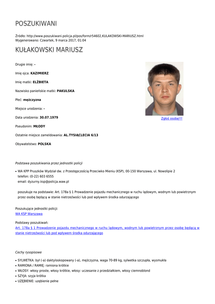 POSZUKIWANI Źródło: http://www.poszukiwani.policja.pl/pos/form/r54602,KULAKOWSKI-MARIUSZ.html Wygenerowano: Czwartek, 9 marca 2017, 01:04 KUŁAKOWSKI MARIUSZ Drugie imię: Imię ojca: KAZIMIERZ Imię matki: ELŻBIETA Nazwisko panieńskie matki: PAKULSKA Płeć: mężczyzna Miejsce urodzenia: Data urodzenia: 30.07.1979 Zgłoś osobę!!! Pseudonim: MŁODY Ostatnie miejsce zameldowania: AL.TYSIĄCLECIA 6/13 Obywatelstwo: POLSKA Podstawa poszukiwania przez jednostki policji ● WA KPP Pruszków Wydział dw. z Przestępczością Przeciwko Mieniu (KSP), 00-150 Warszawa, ul. Nowolipie 2 telefon: (0-22) 603 6555 email: [email protected] poszukuje na podstawie: Art. 178a § 1 Prowadzenie pojazdu mechanicznego w ruchu lądowym, wodnym lub powietrznym przez osobę będącą w stanie nietrzeźwości lub pod wpływem środka odurzającego Poszukujące jednostki policji: WA KSP Warszawa Podstawy poszukiwań: Art. 178a § 1 Prowadzenie pojazdu mechanicznego w ruchu lądowym, wodnym lub powietrznym przez osobę będącą w stanie nietrzeźwości lub pod wpływem środka odurzającego Cechy rysopisowe ● SYLWETKA: był (-a) daktyloskopowany (-a), mężczyzna, waga 70-89 kg, sylwetka szczupła, wysmukła ● RAMIONA / RAMIĘ: ramiona krótkie ● WŁOSY: włosy proste, włosy krótkie, włosy: uczesanie z przedziałkiem, włosy ciemnoblond ● SZYJA: szyja krótka ● UZĘBIENIE: uzębienie pełne ● WARGI (USTA): wargi grube ● USZY / UCHO: uszy normalne, uszy małe ● NOS: kolor nosa naturalny, nos średni, koniuszek nosa zadarty, nos prostolinijny ● ŁUK BRWIOWY: brwi zrośnięte ● PALCE STÓP: palce nóg krótkie ● STOPY / STOPA: stopy zauważalnie małe ● NOGI / NOGA: nogi krótkie ● OCZY / OKO: oczy szeroko rozstawione ● CZOŁO: czoło średnie ● PALCE / PALEC: palce rąk szczupłe, palce rąk długie ● DŁONIE / DŁOŃ: dłonie duże ● TWARZ: cera śniada, twarz owalna Wzrost: 196-200 CM Kolor oczu: JASNE Tweetnij