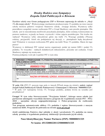 Drodzy Rodzice oraz Sympatycy Zespołu Szkół Publicznych w Równem Dyrektor szkoły oraz Grono pedagogiczne ZSP w Równem zapraszają do udziału w „Akcji 1% dla mojej szkoły”. Wykorzystując mechanizm przekazywania 1% podatku na rzecz naszej szkoły możecie państwo wesprzeć finansowo szkołę swojego dziecka. Wystarczy tylko prawidłowo uzupełnić roczne rozliczenie PIT a Urząd Skarbowy sam prześle pieniądze. Dla szkoły jest to niecodzienna możliwość pozyskania pieniędzy, które zostaną wykorzystane na pomoce naukowe, wyjazdy na basen, wycieczki i różne zajęcia pozalekcyjne. Nie trzeba nic wpłacać! Wystarczy tylko zdecydować gdzie ma trafić 1% Waszego podatku (Waszej rodziny, przyjaciół). Jeżeli nie podejmiecie tej decyzji, o pieniądzach będą decydować inni! Wskażcie w rocznym rozliczeniu PIT gdzie ma trafić Wasz 1% podatku. Macie do tego prawo! Wystarczy w deklaracji PIT wpisać nazwę organizacji, podać jej numer KRS i podać 1% podatku. To wszystko - żadnych dodatkowych dokumentów, procedur ani czekania. Urząd Skarbowy zajmuje się resztą sam. Poniżej podajemy wzór jak wypełnić PIT w tym roku W polu 126 (PIT-37, pozycje tego pola w innych PITach mogą się różnić), należy wpisać Zespół Szkół Publicznych Szkoła Podstawowa i Gimnazjum w Równem 500000031325 . * W polu 125 wpisujemy kwotę 1% Twojego podatku, podana kwota na rysunku jest przykładowa! Uwaga! W tym roku Stowarzyszenie "Przyjazna Szkoła", którego nasza szkoła jest partnerem udostępnia wszystkim darmowy program do wypełnienia zeznań PIT - PITy 2010 - specjalna edycja najpopularniejszego w Polsce programu do rozliczania podatków. Ten program automatycznie obliczy 1% podatku i wpisze Stowarzyszenie z naszym numerem KRS. Program do pobrania na stronie www.ps.org.pl Jeżeli zadeklarują Państwo chęć udziału w akcji i przekażecie 1% podatku na naszą szkołę prosimy o wypełnienie poniższej deklaracji i przekazanie jej do szkoły. Nasz Identyfikacyjny Numer Partnera (INP): 500000031325 Nr konta: 45132000220112500000031325 Nasz Identyfikacyjny Numer Partnera (INP): 500000031325 Nr konta: 45132000220112500000031325