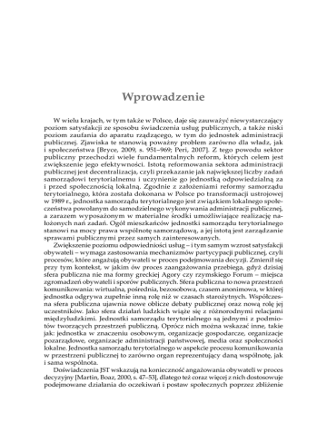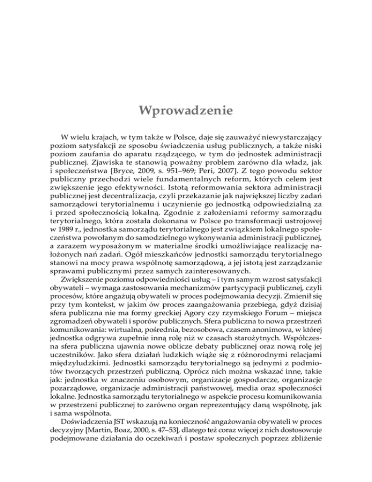 Wprowadzenie 9 Wprowadzenie W wielu krajach, w tym także w Polsce, daje się zauważyć niewystarczający poziom satysfakcji ze sposobu świadczenia usług publicznych, a także niski poziom zaufania do aparatu rządzącego, w tym do jednostek administracji publicznej. Zjawiska te stanowią poważny problem zarówno dla władz, jak i społeczeństwa [Bryce, 2009, s. 951–969; Peri, 2007]. Z tego powodu sektor publiczny przechodzi wiele fundamentalnych reform, których celem jest zwiększenie jego efektywności. Istotą reformowania sektora administracji publicznej jest decentralizacja, czyli przekazanie jak największej liczby zadań samorządowi terytorialnemu i uczynienie go jednostką odpowiedzialną za i przed społecznością lokalną. Zgodnie z założeniami reformy samorządu terytorialnego, która została dokonana w Polsce po transformacji ustrojowej w 1989 r., jednostka samorządu terytorialnego jest związkiem lokalnego społeczeństwa powołanym do samodzielnego wykonywania administracji publicznej, a zarazem wyposażonym w materialne środki umożliwiające realizację nałożonych nań zadań. Ogół mieszkańców jednostki samorządu terytorialnego stanowi na mocy prawa wspólnotę samorządową, a jej istotą jest zarządzanie sprawami publicznymi przez samych zainteresowanych. Zwiększenie poziomu odpowiedniości usług – i tym samym wzrost satysfakcji obywateli – wymaga zastosowania mechanizmów partycypacji publicznej, czyli procesów, które angażują obywateli w proces podejmowania decyzji. Zmienił się przy tym kontekst, w jakim ów proces zaangażowania przebiega, gdyż dzisiaj sfera publiczna nie ma formy greckiej Agory czy rzymskiego Forum – miejsca zgromadzeń obywateli i sporów publicznych. Sfera publiczna to nowa przestrzeń komunikowania: wirtualna, pośrednia, bezosobowa, czasem anonimowa, w której jednostka odgrywa zupełnie inną rolę niż w czasach starożytnych. Współczesna sfera publiczna ujawnia nowe oblicze debaty publicznej oraz nową rolę jej uczestników. Jako sfera działań ludzkich wiąże się z różnorodnymi relacjami międzyludzkimi. Jednostki samorządu terytorialnego są jednymi z podmiotów tworzących przestrzeń publiczną. Oprócz nich można wskazać inne, takie jak: jednostka w znaczeniu osobowym, organizacje gospodarcze, organizacje pozarządowe, organizacje administracji państwowej, media oraz społeczności lokalne. Jednostka samorządu terytorialnego w aspekcie procesu komunikowania w przestrzeni publicznej to zarówno organ reprezentujący daną wspólnotę, jak i sama wspólnota. Doświadczenia JST wskazują na konieczność angażowania obywateli w proces decyzyjny [Martin, Boaz, 2000, s. 47–53], dlatego też coraz więcej z nich dostosowuje podejmowane działania do oczekiwań i postaw społecznych poprzez zbliżenie 10 Wprowadzenie organizacji do ludzi, którym służy, i zwiększenie dbałości o jakość komunikowania się w przestrzeni publicznej [Schiavo-Campo, McFerson, 2008, s. 357–382]. Partycypacja obywateli w procesie rządzenia i dostęp do informacji są kluczowymi elementami utrzymywania wiarygodności działań jednostek samorządu terytorialnego. Innymi słowy, zaangażowanie obywateli jest warunkiem koniecznym demokracji i podstawą istnienia społeczeństwa obywatelskiego [Frost, 2003, s. 87–104]. Zgodnie z nurtem New Public Management jednostki samorządu terytorialnego powinny się konsultować z interesariuszami, zwiększając stopień reagowania na potrzeby i na oczekiwania odbiorców usług, co powinno się przełożyć na wzrost poziomu zaufania [Denhart, Denhart, 2000, s. 549–559], ponieważ w tych obszarach działania, gdzie zaangażowanie publiczności jest większe, jednostki te odnoszą większe sukcesy niż tam, gdzie poziom zaangażowania jest niższy [Putnam, 1995a, s. 65–78]. Realizacja idei partycypacji publicznej wymaga przede wszystkim komunikowania się jednostek samorządu terytorialnego z otoczeniem, a szerzej – budowania właściwych relacji. Przedkładana publikacja stanowi wynik prac podjętych w ramach badań statutowych Katedry Zarządzania Publicznego i Nauk Społecznych Uniwersytetu Ekonomicznego w Katowicach. Podjęto w niej próbę analizy relacji jednostek samorządu terytorialnego z interesariuszami w przestrzeni publicznej, wskazania pożądanych standardów komunikowania oraz roli mediów w tak rozumianej sferze publicznej. W tym celu sformułowano przedstawione niżej pytania badawcze. 1. Jakie jest znaczenie współczesnej przestrzeni publicznej i jakie są jej podmioty? 2. W jaki sposób public relations wpływa na tworzenie warunków partycypacji publicznej? 3. W jaki sposób jednostka samorządu terytorialnego buduje relacje z interesariuszami? 4. Jakie narzędzia są wykorzystywane w procesie komunikowania się jednostki samorządu terytorialnego z interesariuszami w przestrzeni publicznej? 5. W jaki sposób standardy etyczne wpływają na praktykę działania JST? W celu uzyskania odpowiedzi na postawione pytania badawcze przeprowadzono kwerendę literatury przedmiotu, a także badania terenowe z wykorzystaniem kwestionariusza ankiety, doręczanego przez ankieterów, zawierającego zarówno pytania otwarte, jak i pytania zamknięte, w których zamieszczono kafeterię bądź też proszono o określenie siły danego zjawiska1. Dobór próby był doborem celowym, którego podstawą było uwzględnienie wszystkich trzech poziomów samorządu terytorialnego w Polsce. Terytorialnie badania objęły swoim zasięgiem wszystkie urzędy marszałkowskie (16), a dla potrzeb zbadania poziomu powiatu i gmin wybrano województwo śląskie, w którym poddano analizie wszystkie jednostki powiatowe (urzędy powiatowe oraz urzędy miast na prawach powiatu –36), a także urzędy gmin (ze 167 gmin województwa śląskiego przyjęto do analizy 143 ankiety). Dane empiryczne zgromadzono w latach 2009–2010. Biorąc pod uwagę regulacje prawne oraz funkcje publi