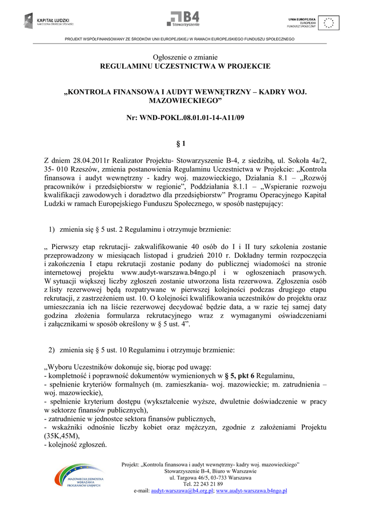 PROJEKT WSPÓŁFINANSOWANY ZE ŚRODKÓW UNII EUROPEJSKIEJ W RAMACH EUROPEJSKIEGO FUNDUSZU SPOŁECZNEGO Ogłoszenie o zmianie REGULAMINU UCZESTNICTWA W PROJEKCIE „KONTROLA FINANSOWA I AUDYT WEWNĘTRZNY – KADRY WOJ. MAZOWIECKIEGO” Nr: WND-POKL.08.01.01-14-A11/09 §1 Z dniem 28.04.2011r Realizator Projektu- Stowarzyszenie B-4, z siedzibą, ul. Sokoła 4a/2, 35- 010 Rzeszów, zmienia postanowienia Regulaminu Uczestnictwa w Projekcie: „Kontrola finansowa i audyt wewnętrzny - kadry woj. mazowieckiego, Działania 8.1 – „Rozwój pracowników i przedsiębiorstw w regionie”, Poddziałania 8.1.1 – „Wspieranie rozwoju kwalifikacji zawodowych i doradztwo dla przedsiębiorstw” Programu Operacyjnego Kapitał Ludzki w ramach Europejskiego Funduszu Społecznego, w sposób następujący: 1) zmienia się § 5 ust. 2 Regulaminu i otrzymuje brzmienie: „ Pierwszy etap rekrutacji- zakwalifikowanie 40 osób do I i II tury szkolenia zostanie przeprowadzony w miesiącach listopad i grudzień 2010 r. Dokładny termin rozpoczęcia i zakończenia I etapu rekrutacji zostanie podany do publicznej wiadomości na stronie internetowej projektu www.audyt-warszawa.b4ngo.pl i w ogłoszeniach prasowych. W sytuacji większej liczby zgłoszeń zostanie utworzona lista rezerwowa. Zgłoszenia osób z listy rezerwowej będą rozpatrywane w pierwszej kolejności podczas drugiego etapu rekrutacji, z zastrzeżeniem ust. 10. O kolejności kwalifikowania uczestników do projektu oraz umieszczania ich na liście rezerwowej decydować będzie data, a w razie tej samej daty godzina złożenia formularza rekrutacyjnego wraz z wymaganymi oświadczeniami i załącznikami w sposób określony w § 5 ust. 4”. 2) zmienia się § 5 ust. 10 Regulaminu i otrzymuje brzmienie: „Wyboru Uczestników dokonuje się, biorąc pod uwagę: - kompletność i poprawność dokumentów wymienionych w § 5, pkt 6 Regulaminu, - spełnienie kryteriów formalnych (m. zamieszkania- woj. mazowieckie; m. zatrudnienia – woj. mazowieckie), - spełnienie kryterium dostępu (wykształcenie wyższe, dwuletnie doświadczenie w pracy w sektorze finansów publicznych), - zatrudnienie w jednostce sektora finansów publicznych, - wskaźniki odnośnie liczby kobiet oraz mężczyzn, zgodnie z założeniami Projektu (35K,45M), - kolejność zgłoszeń. Projekt: „Kontrola finansowa i audyt wewnętrzny- kadry woj. mazowieckiego” Stowarzyszenie B-4, Biuro w Warszawie ul. Targowa 46/5, 03-733 Warszawa Tel. 22 243 21 89 e-mail: [email protected]; www.audyt-warszawa.b4ngo.pl PROJEKT WSPÓŁFINANSOWANY ZE ŚRODKÓW UNII EUROPEJSKIEJ W RAMACH EUROPEJSKIEGO FUNDUSZU SPOŁECZNEGO W celu osiągnięcia zakładanych przez Realizatora Projektu wskaźników dotyczących liczby kobiet i mężczyzn, ( 35 K, 45 M), podczas drugiego etapu rekrutacji - zakwalifikowanych zostanie 40 osób tj, - 34 mężczyzn - 6 kobiet. Podczas drugiego etapu rekrutacji o wyborze uczestników decydować będą: - kompletność i poprawność dokumentów wymienionych w § 5, pkt 6 Regulaminu, - spełnienie kryteriów formalnych (m. zamieszkania- woj. mazowieckie; m. zatrudnienia woj. mazowieckie), - spełnienie kryterium dostępu (wykształcenie wyższe, dwuletnie doświadczenie w pracy w sektorze finansów publicznych), - zatrudnienie w jednostce sektora finansów publicznych, - wskaźniki odnośnie liczby kobiet oraz mężczyzn, zgodnie z założeniami Projektu (35K,45M), - kolejność zgłoszeń, z zastrzeżeniem, że: - pierwszeństwo w całej procedurze rekrutacji podczas drugiego etapu rekrutacji uzyskują mężczyźni spełniający pozostałe kryteria udziału w projekcie ( prawo pierwszeństwa rekrutacji mężczyzn dotyczy zarówno listy rezerwowej jak i zgłoszeń złożonych podczas drugiego etapu rekrutacji). - rekrutacja kobiet w tym z listy rezerwowej będzie prowadzona po spełnieniu wskaźników dotyczących liczby mężczyzn w projekcie ( 34 M). - rekrutacja uczestnika będzie zależna od miejsca zatrudnienia uczestnika, ze względu na zasadę dopuszczalnej liczby pracowników z danej jednostki administracyjnej biorących udział w projekcie ( pracownicy zatrudnieni u danego pracodawcy nie mogą stanowić więcej niż 20 % uczestników danego szkolenia)”. §2 Pozostałe postanowienia Regulaminu Uczestnictwa w Projekcie „ Kontrola finansowa i audyt wewnętrzny- kadry woj. mazowieckiego” Nr: WND-POKL.08.01.01-14-A11/09 pozostają bez zmian. Sporządził: Asystent projektu Zatwierdził: Koordynator projektu Projekt: „Kontrola finansowa i audyt wewnętrzny- kadry woj. mazowieckiego” Stowarzyszenie B-4, Biuro w Warszawie ul. Targowa 46/5, 03-733 Warszawa Tel. 22 243 21 89 e-mail: [email protected]; www.audyt-warszawa.b4ngo.pl