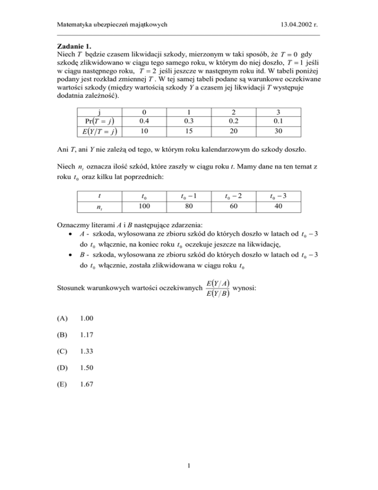 13.04.2002 r. ___________________________________________________________________________ Zadanie 1. Niech T T 0 gdy T 1 T 2 T Y a czasem jej likwidacji T !" j Pr T j E Y T j 0 0.4 10 1 0.3 15 2 0.2 20 3 0.1 30 Ani T, ani Y Niech nt ! t. Mamy dane na ten temat z roku t 0 oraz kilku lat poprzednich: t nt t0 100 t0 1 80 t0 2 60 t0 3 40 Oznaczmy literami A i B # A - szko $ $ t 0 3 do t 0 t 0 B - $ ach od t 0 3 do t 0 t 0 % $$ (A) 1.00 (B) 1.17 (C) 1.33 (D) 1.50 (E) 1.67 1 E Y A wynosi: E Y B 13.04.2002 r. ___________________________________________________________________________ Zadanie 2. &$X i YZ ma $ # COV ( X , Y / Z ) 2 Z , E ( X / Z ) 3Z , E (Y / Z ) Z ; Z w populacji ryzyk daj ! logarytmiczno- ln Z $ 1 , 2 0, . 10 COV ( X , Y ) '"# (A) 2.00 (B) 2.15 (C) 2.30 (D) 2.45 (E) 2.50 2 13.04.2002 r. ___________________________________________________________________________ Zadanie 3. Zmienna losowa: (przyjmujemy S 0 N 0 ) S Y1 ... YN , # k 1 1 Pr N k , k 0,1,2,... 2 ( Y k 0,1,...,5 ( Pr S k . k Pr Y k Pr S k 0 0 0.50000 1 0.2 0.05000 2 0.3 0.08000 3 0.1 0.04050 4 0.2 0.06855 5 0.1 0.04693 6 0.1 ? Pr S 6 '"# (A) 0.0425 (B) 0.0450 (C) 0.0475 (D) 0.0500 (E) 0.0525 3 13.04.2002 r. ___________________________________________________________________________ Zadanie 4. ) !* # u x const exp( x) + w 1 X: 1 Pr X 1 1 Pr X 0 5 &* X d 0, 1 za c# 5 Pd E X d 4 ! d * parametru kontraktu d! maksimum, wynosi: (A) d* 0 (B) d * ln 3 2 (C) d * ln 4 3 (D) d * ln 5 4 (E) d * 1 (brak ubezpieczenia) 4 13.04.2002 r. ___________________________________________________________________________ Zadanie 5. W momencie t 0 procesem Poissona t , a o parametrze zmiennej losowej o , , # f 1 exp , z parametrami: 2 , 10 . & t 0 t1 ! pod t1 t 0 2 , wynosi: (A) 6 24 (B) 6 25 (C) 5 24 (D) 5 25 (E) 4 24 5 13.04.2002 r. ___________________________________________________________________________ Zadanie 6. - ! X z pewnego ryzyka - , FY / ! oczekiwana pojedynczej szkody Y dana jest wzorem: E Y 10 1 2 . Parametr ryzyka , , # 1 exp , z parametrami: 4 , 20 . E X wynosi: f (A) 2.80 (B) 2.85 (C) 2.90 (D) 2.95 (E) 3.00 6 13.04.2002 r. ___________________________________________________________________________ Zadanie 7. .! ( $ komponentów: X 0 - ($ X 1 - ($ $ - # $ ryzyka : E X 0 m1 p VAR X 0 m2 p E X 1 m1 q , VAR X 1 m2 q , COV X 0 , X 1 0 oraz o bezwarunkowym ro : E , VAR L2 1 q p 0,1 oraz (dodatnich) parametrów m1 , m2 , oraz L2 . - X 0 X 1 # 1 BLP X 1 X 0 q z X 0 1 z m1 . p z liniowych, jest postaci: L2 p m12 L2 p m12 m2 (A) z (B) L2 p m2 z 2 L p m2 m12 (C) z (D) L2 m2 z 2 L m2 2 p m12 (E) z L2 m12 L2 m12 p m2 L2 p m2 L2 p m2 2 m12 7 13.04.2002 r. ___________________________________________________________________________ Zadanie 8. & skretnym postaci: U n u c n S n , n 0,1,2,... gdzie S n W1 W2 ... Wn $$ # W). c za portfel ryzyk gener! W ( ! exp( Ru ) , gdzie R to adjustment coefficientu -W posiada funkc $ " W , natomiast wyrazy $* pomijalne. -e: $ zmiennej W: u 2 W , ( # exp(3) * # c E W W a 0 a1 W parametr a1 * # (A) a1 3 2 (B) a1 3 8 (C) a1 9 8 (D) a1 3 4 (E) a1 9 16 8 13.04.2002 r. ___________________________________________________________________________ Zadanie 9. ! Y- # 3 10 dla y 0 , FY y 1 10 y FY y 0 dla y 0 . oraz & U t w czasie / - ! " # 5 c E Y . 4 - . Niech T inf t : t 0, U t 0 oznacza moment czasu, w którym dochodzi do ruiny (przyjmujemy T t 0 " Niech funkcja: G h Pr T U T h , h 0 ( * !h. ! G 2 wynosi: (A) 23 (B) 35 (C) 59 (D) 12 (E) 49 9 13.04.2002 r. ___________________________________________________________________________ Zadanie 10. & # U n u c n S n , n 0,1,2,... gdzie S n W1 W2 ... Wn $$ # W"$ Pr W 0 1 . 0 c E W . Wobec tego ruina jest pewna. Niech T u oznacza czas ruiny: T u inf n : n 0,1,2,..., U n 0, E T u oczekiwany czas ruiny (traktowany explicite jako funkcja zmiennej u). 1$u zachodzi E T u 0 . )$u funkcja E T u !# (A) E T u u c E T u c x dF x W 0 (B) E T u 1 u c E T u c x dF x W 0 (C) E T u 1 FW u c uc E T u c x dF x W 0 (D) E T u 1 FW u c FW u c uc E T u c x dF x W 0 (E) E T u 1 FW u c FW u c uc 1 E T u c x dF x W 0 Wskazówka#&# U 1 0 oraz U 1 0 10 13.04.2002 r. ___________________________________________________________________________ XXV Egzamin dla Aktuariuszy z 13 kwietnia 2002 r. Matematyka Arkusz odpowiedzi* 2 ...................... K L U C Z O D P O W I E D Z I ............................... Pesel ........................................... Zadanie nr 1 2 3 4 5 6 7 8 9 10 * 1' D D E C A E A B C B Punktacja Arkuszu odpowiedzi. 11