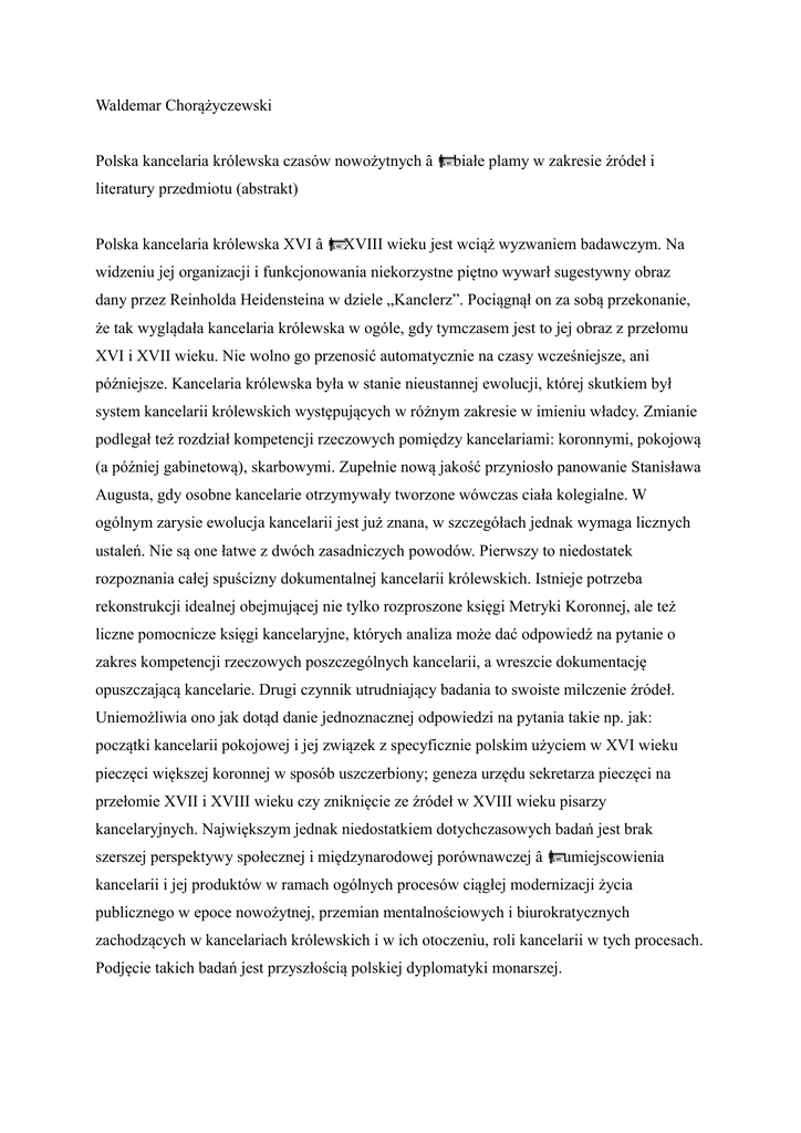 Waldemar Chorążyczewski Polska kancelaria królewska czasów nowożytnych âbiałe plamy w zakresie źródeł i literatury przedmiotu (abstrakt) Polska kancelaria królewska XVI âXVIII wieku jest wciąż wyzwaniem badawczym. Na widzeniu jej organizacji i funkcjonowania niekorzystne piętno wywarł sugestywny obraz dany przez Reinholda Heidensteina w dziele „Kanclerz”. Pociągnął on za sobą przekonanie, że tak wyglądała kancelaria królewska w ogóle, gdy tymczasem jest to jej obraz z przełomu XVI i XVII wieku. Nie wolno go przenosić automatycznie na czasy wcześniejsze, ani późniejsze. Kancelaria królewska była w stanie nieustannej ewolucji, której skutkiem był system kancelarii królewskich występujących w różnym zakresie w imieniu władcy. Zmianie podlegał też rozdział kompetencji rzeczowych pomiędzy kancelariami: koronnymi, pokojową (a później gabinetową), skarbowymi. Zupełnie nową jakość przyniosło panowanie Stanisława Augusta, gdy osobne kancelarie otrzymywały tworzone wówczas ciała kolegialne. W ogólnym zarysie ewolucja kancelarii jest już znana, w szczegółach jednak wymaga licznych ustaleń. Nie są one łatwe z dwóch zasadniczych powodów. Pierwszy to niedostatek rozpoznania całej spuścizny dokumentalnej kancelarii królewskich. Istnieje potrzeba rekonstrukcji idealnej obejmującej nie tylko rozproszone księgi Metryki Koronnej, ale też liczne pomocnicze księgi kancelaryjne, których analiza może dać odpowiedź na pytanie o zakres kompetencji rzeczowych poszczególnych kancelarii, a wreszcie dokumentację opuszczającą kancelarie. Drugi czynnik utrudniający badania to swoiste milczenie źródeł. Uniemożliwia ono jak dotąd danie jednoznacznej odpowiedzi na pytania takie np. jak: początki kancelarii pokojowej i jej związek z specyficznie polskim użyciem w XVI wieku pieczęci większej koronnej w sposób uszczerbiony; geneza urzędu sekretarza pieczęci na przełomie XVII i XVIII wieku czy zniknięcie ze źródeł w XVIII wieku pisarzy kancelaryjnych. Największym jednak niedostatkiem dotychczasowych badań jest brak szerszej perspektywy społecznej i międzynarodowej porównawczej âumiejscowienia kancelarii i jej produktów w ramach ogólnych procesów ciągłej modernizacji życia publicznego w epoce nowożytnej, przemian mentalnościowych i biurokratycznych zachodzących w kancelariach królewskich i w ich otoczeniu, roli kancelarii w tych procesach. Podjęcie takich badań jest przyszłością polskiej dyplomatyki monarszej.