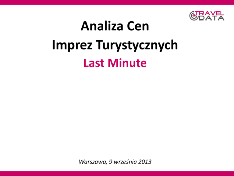 Analiza Cen Imprez Turystycznych Last Minute Warszawa, 9 września 2013 Założenia dotyczące Analizy Cen Imprez Turystycznych Data Analizy: 06.09.2013 • • • • data planowanego wyjazdu turystycznego LAST MINUTE: 16.09.2013 – 29.09.2013 impreza 7-dniowa, wylot z Warszawy, cena 1 osoby dorosłej w pokoju 2-osobowym Przeanalizowano: • • • 3 611 cen pokoi hotelowych z 1 999 hoteli 61 różnych destynacji 31 touroperatorów Średnia cena • • • średnia cena to średnia z cen osoby dorosłej w pokoju 2-osobowym w danej destynacji po odjęciu 1/3 cen najdroższych i najmniej popularnych wśród polskich klientów hoteli z danej kategorii do zestawień cen średnich wzięto pod uwagę touroperatorów mających w ofercie co najmniej 3 hotele z danej kategorii i z danej destynacji na destynacjach tureckich, gdzie część touroperatorów ma w ofercie bardzo dużo hoteli, w zdecydowanej większości nie kupowanych przez polskich klientów, średnią cenę wyliczano w oparciu o najtańsze 40 hoteli najczęsciej wybieranych przez klientów 2 Założenia dotyczące Analizy Cen Imprez Turystycznych Wersja Analizy • Propozycja wyjściowa, która jest stale uzupełniana i modyfikowana, w tym również w oparciu o uwagi i sugestie zgłaszane przez jej odbiorców. Odbiorcy • Agenci turystyczni, partnerzy portalu www.wczasopedia.pl, Główne cele analizy • Dostarczenie odbiorcom analizy dostatecznie szerokiej i aktualnej wiedzy o kształtowaniu się poziomów i trendów cenowych najważniejszych produktów w branży turystyki wyjazdowej. Przewidywane następne kroki • • • • zebranie uwag i sugestii użytkowników odnośnie zawartości i formy analizy rozszerzanie palety analizowanych produktów (nowe daty wyjazdu i destynacje) analizy kształtowania się cen produktów w czasie wprowadzenie porównań między-destynacyjnych. 3 RYNEK: LAST MINUTE All Inclusive Największe zmiany średnich cen imprez turystycznych w okresie 31.08.2013 – 06.09.2013 Największe wzrosty/spadki średniej ceny Last Minute vs Last Minute z poprzedniego tygodnia W okresie 31.08.2013 – 06.09.2013 średnia cena imprezy turystycznej w ofercie Last Minute spadła o 55 złotych -543 Best Reisen Grecos Holidays -467 Exim Tours -358 -136 W poprzednim tygodniu średnia cena spadła o 103 złote TUI Viva Club Sun & Fun Rainbow Tours Itaka 4 35 39 89 123 RYNEK: LAST MINUTE All Inclusive Największe zmiany średnich cen imprez turystycznych w okresie 31.08.2013 – 06.09.2013 Największe wzrosty/spadki średniej ceny Last Minute vs Last Minute z poprzedniego tygodnia W okresie 31.08.2013 – 06.09.2013 średnia cena imprezy turystycznej w ofercie Last Minute spadła o 55 złotych -184 Turcja: Riwiera Grecja: Kreta -149 -129 Hiszpania: Baleary -123 W poprzednim tygodniu średnia cena spadła o 103 złote Hiszpania: Wybrzeże 33 Turcja Płd.-Zach. Bułgaria 148 211 Maroko 384 5 Portugalia RYNEK: LAST MINUTE All Inclusive Ceny średnie hoteli 4 – 4,5 gwiazdkowych: 7 dni + All Inclusive + z Warszawy Zestawienie największych spadków/wzrostów średnich cen hoteli 4* LM w ostatnim tygodniu na najważniejszych kierunkach kierunekc Średnia cena (zmiana ceny) Największy spadek cen Największy wzrost/zmiana cen Egipt: Synaj 2109 zł (- 56 zł) Net Holiday - 286zł Viva Club Bułgaria 2135 zł (+152 zł) Best Reisen + 26 zł TUI + 451 zł Egipt: Wybrzeże 2180 zł (+ 20 zł) Net Holiday - 184 zł Rainbow Tours + 189 zł Tunezja 2320 zł (- 109 zł) Alfa Star -283 zł TUI + 221 zł Turcja: Riwiera 2522 zł (- 122 zł) Wezyr -302 zł Itaka + 1 zł Grecja: Kreta 2658 zł (-149 zł) TUI -715 zł Itaka + 78 zł Hiszpania: Wyspy Kanaryjskie 3367 zł (-35 zł) Neckermann - 61 zł Itaka + 48 zł RYNEK 4* 2662 zł (-55 zł) 6 0 zł RYNEK: LAST MINUTE All Inclusive Różnice cen średnich Last Minute wobec cen Last Minute z poprzedniego tygodnia kategoria hotelu Średnia różnica ceny Kierunek / najmniejsza różnica Kierunek / największa różnica 3 - 3,5 gwiazdki - 41 zł (- 1,8%) Turcja Płd. – Zach. + 144 zł (+ 7,4%) Portugalia -236 zł (- 7,6%) 4 - 4,5 gwiazdki + 7 zł (+ 0,3%) Portugalia + 766 zł (+24,0%) Hiszpania: Baleary -198 zł (- 5,6%) 5 gwiazdki -48 zł (-1,6%) Portugalia + 773 zł (+20,6%) Grecja: Kreta -322 zł (- 9,1%) RAZEM - 25 zł (- 0,9%) Największe przeceny Last Minute Najmniejsze przeceny Last Minute wykazywały następujące biura: wykazywały biura Itaka (6) oraz TUI TUI (5) i Net Holiday (2 przypadki) (3 przypadki) 7 Grecja, Kreta: LAST MINUTE All Inclusive Ceny średnie hoteli 3 – 3,5 gwiazdkowych: 7 dni + All Inclusive + z Warszawy Wzrost/spadek średniej ceny vs poprzedni tydzień HOTELE 3 – 3,5 gwiazdki: Średnia cena w zł za 1 os. w pokoju 2 os. oraz ilość hoteli do wyliczenia średniej ceny -1 500 zł -1 300 zł -1 100 zł -900 zł -700 zł -500 zł -300 zł 2 028,00 zł 7islands 2 077,06 zł 2 189,17 zł 0 zł ilość hoteli; 6 2 226,75 zł Neckermann -1 zł ilość hoteli; 8 2 352,67 zł TUI 0 zł ilość hoteli; 6 Itaka 3 - 3,5 Grecja: Kreta 2 472,33 zł 62 zł ilość hoteli; 6 0 1000 2000 3000 300 zł -47 zł ilość hoteli; 16 Sun & Fun 100 zł -35 zł ilość hoteli; 5 Wezyr Holidays -100 zł 4000 5000 8 6000 7000 8000 9000 10000 Grecja, Kreta: LAST MINUTE All Inclusive Ceny średnie hoteli 4 – 4,5 gwiazdkowych: 7 dni + All Inclusive + z Warszawy Wzrost/spadek średniej ceny vs poprzedni tydzień HOTELE 4 – 4,5 gwiazdki: Średnia cena w zł za 1 os. w pokoju 2 os. oraz ilość hoteli do wyliczenia średniej ceny -2 500 zł Sun & Fun -2 000 zł Itaka ilość hoteli; 3 Alfa Star ilość hoteli; 5 TUI 4 - 4,5 … ilość hoteli; 11 0 1000 0 zł -169 zł -104 zł 2 768,29 zł ilość hoteli; 14 Exim Tours -141 zł 2 680,00 zł ilość hoteli; 5 78 zł 2 802,33 zł 0 zł 2 823,60 zł 0 zł 2 846,82 zł 2000 500 zł 0 zł 2 584,10 zł ilość hoteli; 21 7islands 0 zł 2 576,60 zł ilość hoteli; 5 Neckermann -500 zł 2 527,40 zł ilość hoteli; 10 Ecco Holiday -1 000
