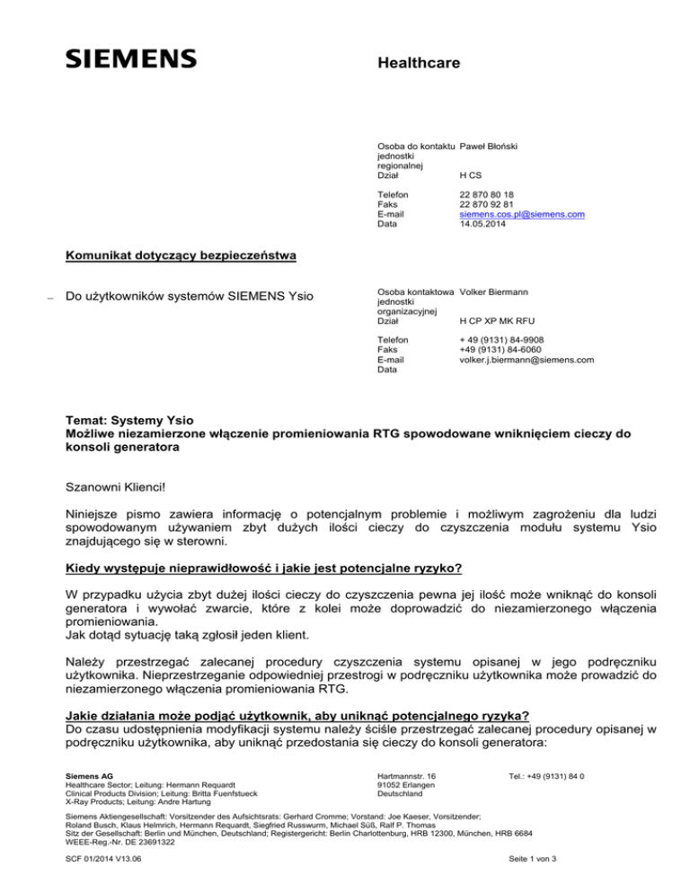 Healthcare Osoba do kontaktu Paweł Błoński jednostki regionalnej Dział H CS Telefon Faks E-mail Data 22 870 80 18 22 870 92 81 [email protected] 14.05.2014 Komunikat dotyczący bezpieczeństwa _ Do użytkowników systemów SIEMENS Ysio Osoba kontaktowa Volker Biermann jednostki organizacyjnej Dział H CP XP MK RFU Telefon Faks E-mail Data + 49 (9131) 84-9908 +49 (9131) 84-6060 [email protected] Temat: Systemy Ysio Możliwe niezamierzone włączenie promieniowania RTG spowodowane wniknięciem cieczy do konsoli generatora Szanowni Klienci! Niniejsze pismo zawiera informację o potencjalnym problemie i możliwym zagrożeniu dla ludzi spowodowanym używaniem zbyt dużych ilości cieczy do czyszczenia modułu systemu Ysio znajdującego się w sterowni. Kiedy występuje nieprawidłowość i jakie jest potencjalne ryzyko? W przypadku użycia zbyt dużej ilości cieczy do czyszczenia pewna jej ilość może wniknąć do konsoli generatora i wywołać zwarcie, które z kolei może doprowadzić do niezamierzonego włączenia promieniowania. Jak dotąd sytuację taką zgłosił jeden klient. Należy przestrzegać zalecanej procedury czyszczenia systemu opisanej w jego podręczniku użytkownika. Nieprzestrzeganie odpowiedniej przestrogi w podręczniku użytkownika może prowadzić do niezamierzonego włączenia promieniowania RTG. Jakie działania może podjąć użytkownik, aby uniknąć potencjalnego ryzyka? Do czasu udostępnienia modyfikacji systemu należy ściśle przestrzegać zalecanej procedury opisanej w podręczniku użytkownika, aby uniknąć przedostania się cieczy do konsoli generatora: Siemens AG Healthcare Sector; Leitung: Hermann Requardt Clinical Products Division; Leitung: Britta Fuenfstueck X-Ray Products; Leitung: Andre Hartung Hartmannstr. 16 91052 Erlangen Deutschland Tel.: +49 (9131) 84 0 Siemens Aktiengesellschaft: Vorsitzender des Aufsichtsrats: Gerhard Cromme; Vorstand: Joe Kaeser, Vorsitzender; Roland Busch, Klaus Helmrich, Hermann Requardt, Siegfried Russwurm, Michael Süß, Ralf P. Thomas Sitz der Gesellschaft: Berlin und München, Deutschland; Registergericht: Berlin Charlottenburg, HRB 12300, München, HRB 6684 WEEE-Reg.-Nr. DE 23691322 SCF 01/2014 V13.06 Seite 1 von 3 Healthcare - Nie dopuszczać do przedostawania się ciekłych środków czyszczących do otworów i szczelin systemu (np. otworów wentylacyjnych, szczelin między pokrywami). Wycierać elementy systemu wilgotną szmatką (wycisnąć mokrą szmatkę przed jej użyciem). Natychmiast usuwać wszelkie pozostałości wody. W jaki sposób problem zostanie rozwiązany? Firma Siemens opracowała modyfikację, która wyeliminuje ten potencjalny problem poprzez prewencyjne uszczelnienie konsol systemów Ysio przed wniknięciem cieczy. Modyfikacje przeznaczone do wdrażania w miejscach instalacji systemu będą dostępne w drugim kwartale 2014 roku i przewiduje się, że zostaną zrealizowane we wszystkich zainstalowanych systemach w czwartym kwartale 2014 r. _ Dziękujemy za zrozumienie i współpracę oraz prosimy o natychmiastowe przekazanie odpowiednich instrukcji dotyczących bezpieczeństwa personelowi. Niniejszy komunikat należy dołączyć do instrukcji użytkowania systemu. Państwa personel powinien zachować szczególną uwagę w okresie występowania zagrożenia. Jeśli urządzenie, którego dotyczy informacja, zostało sprzedane i nie znajduje się już w Państwa posiadaniu, prosimy o przekazanie niniejszego komunikatu ostrzegawczego nowemu właścicielowi urządzenia. Prosimy także przekazać nam dane nowego właściciela urządzenia. O niniejszym komunikacie został powiadomiony odpowiedni krajowy organ nadzoru. Z poważaniem, SCF 01/2014 V13.06 Seite 2 von 3 Healthcare Potwierdzenie otrzymania Adres klienta: _ Niniejszym, jako właściciel/operator odpowiedzialny za produkt ______________ o numerze seryjnym ________________________(nr opcjonalny), potwierdzam otrzymanie następującego dokumentu: Komunikat dotyczący bezpieczeństwa Systemy Ysio Możliwe niezamierzone włączenie promieniowania RTG spowodowane wniknięciem cieczy do konsoli generatora Miejscowość, data _______________________ Imię i nazwisko Podpis SCF 01/2014 V13.06 _______________________ _______________________ Seite 3 von 3
