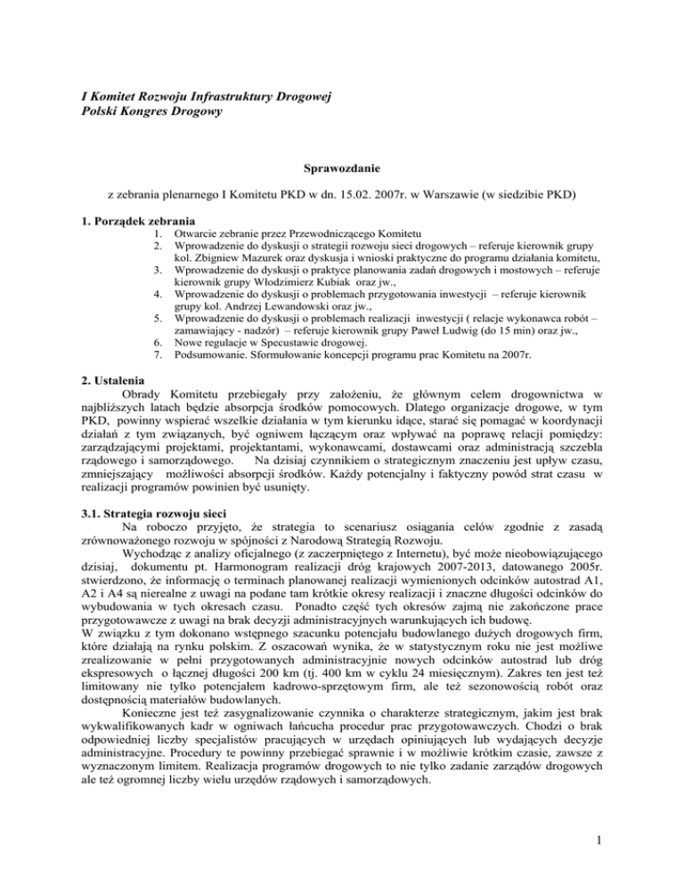 I Komitet Rozwoju Infrastruktury Drogowej Polski Kongres Drogowy Sprawozdanie z zebrania plenarnego I Komitetu PKD w dn. 15.02. 2007r. w Warszawie (w siedzibie PKD) 1. Porządek zebrania 1. 2. 3. 4. 5. 6. 7. Otwarcie zebranie przez Przewodniczącego Komitetu Wprowadzenie do dyskusji o strategii rozwoju sieci drogowych – referuje kierownik grupy kol. Zbigniew Mazurek oraz dyskusja i wnioski praktyczne do programu działania komitetu, Wprowadzenie do dyskusji o praktyce planowania zadań drogowych i mostowych – referuje kierownik grupy Włodzimierz Kubiak oraz jw., Wprowadzenie do dyskusji o problemach przygotowania inwestycji – referuje kierownik grupy kol. Andrzej Lewandowski oraz jw., Wprowadzenie do dyskusji o problemach realizacji inwestycji ( relacje wykonawca robót – zamawiający - nadzór) – referuje kierownik grupy Paweł Ludwig (do 15 min) oraz jw., Nowe regulacje w Specustawie drogowej. Podsumowanie. Sformułowanie koncepcji programu prac Komitetu na 2007r. 2. Ustalenia Obrady Komitetu przebiegały przy założeniu, że głównym celem drogownictwa w najbliższych latach będzie absorpcja środków pomocowych. Dlatego organizacje drogowe, w tym PKD, powinny wspierać wszelkie działania w tym kierunku idące, starać się pomagać w koordynacji działań z tym związanych, być ogniwem łączącym oraz wpływać na poprawę relacji pomiędzy: zarządzającymi projektami, projektantami, wykonawcami, dostawcami oraz administracją szczebla rządowego i samorządowego. Na dzisiaj czynnikiem o strategicznym znaczeniu jest upływ czasu, zmniejszający możliwości absorpcji środków. Każdy potencjalny i faktyczny powód strat czasu w realizacji programów powinien być usunięty. 3.1. Strategia rozwoju sieci Na roboczo przyjęto, że strategia to scenariusz osiągania celów zgodnie z zasadą zrównoważonego rozwoju w spójności z Narodową Strategią Rozwoju. Wychodząc z analizy oficjalnego (z zaczerpniętego z Internetu), być może nieobowiązującego dzisiaj, dokumentu pt. Harmonogram realizacji dróg krajowych 2007-2013, datowanego 2005r. stwierdzono, że informację o terminach planowanej realizacji wymienionych odcinków autostrad A1, A2 i A4 są nierealne z uwagi na podane tam krótkie okresy realizacji i znaczne długości odcinków do wybudowania w tych okresach czasu. Ponadto część tych okresów zajmą nie zakończone prace przygotowawcze z uwagi na brak decyzji administracyjnych warunkujących ich budowę. W związku z tym dokonano wstępnego szacunku potencjału budowlanego dużych drogowych firm, które działają na rynku polskim. Z oszacowań wynika, że w statystycznym roku nie jest możliwe zrealizowanie w pełni przygotowanych administracyjnie nowych odcinków autostrad lub dróg ekspresowych o łącznej długości 200 km (tj. 400 km w cyklu 24 miesięcznym). Zakres ten jest też limitowany nie tylko potencjałem kadrowo-sprzętowym firm, ale też sezonowością robót oraz dostępnością materiałów budowlanych. Konieczne jest też zasygnalizowanie czynnika o charakterze strategicznym, jakim jest brak wykwalifikowanych kadr w ogniwach łańcucha procedur prac przygotowawczych. Chodzi o brak odpowiedniej liczby specjalistów pracujących w urzędach opiniujących lub wydających decyzje administracyjne. Procedury te powinny przebiegać sprawnie i w możliwie krótkim czasie, zawsze z wyznaczonym limitem. Realizacja programów drogowych to nie tylko zadanie zarządów drogowych ale też ogromnej liczby wielu urzędów rządowych i samorządowych. 1 Jeśli ww. limit potencjałów budowlanych będzie urealniony w najbliższym czasie, to będzie celowa weryfikacja dotychczasowych harmonogramów programów drogowych. Reasumując: 1/ Powyższe uwagi prowadzą do wniosku o potrzebie wypracowania realistycznych zasad budowania strategii rozwoju sieci, odpornych na wszelkie naciski też polityczne. 2/ Grupa robocza Strategii widzi celowość szerszej wymiany poglądów w szerszym kręgu ekspertów niż tylko członkowie I Komitetu na temat zasad konstruowania skutecznych strategii rozwoju sieci. 3/ W tabl. zestawiono zidentyfikowane problemy ze wskazaniem ramowych działań usprawniających Zidentyfikowane problemy Brak w pełni racjonalnych przesłanek budowania strategii (m.in. nieuwzględnianie faktycznego potencjału firm realizujących program) Zmienność koncepcji finansowania programu (koncesje czy budżet) Brak zharmonizowanych wymagań technicznych dla wszystkich kategorii dróg Następstwa problemów Nietrwałość listy zadań w czasie, płynność zakładanych terminów realizacji Spadek tempa prac planistycznych i przygotowawczych, a w efekcie opóźnienia Negatywny wpływ na stabilność źródeł finansowania inwestycji Mogą powstawać rozwiązania bez pełnego uzasadnienia ekonomicznego w skali regionu jw. + wzrost kosztów robót Braki kwalifikowanej kadry na wszystkich szczeblach – administracja, wykonawcy, projektanci Działania usprawniające Postulowane działania: • wprowadzanie dróg do krajowej koncepcji zagospodarowania kraju, do wojewódzkich planów zagospodarowania przestrzennego, • jw. lecz miejscowych w warstwie zadaniowej schemat SMART: Zadania powinny cechować się specyfiką, mierzalnością, być uzgodnione (agreed), wykonalne (Real) i określonością w czasie (timed). Po zatwierdzeniu strategia musi być monitorowana i ew. korygowana. Opracowanie wymagań sharmonizowanych dla wszystkich dróg (zadanie do realizacji przez ministerstwo transportu) Jeśli program drogowym ma być narodowy to też narodowy program szkolenia kadry administracyjnej i technicznej -rozważyć utworzenie wyspecjalizowanych jednostek międzywojewódzkich. 2. Planowanie inwestycji drogowych i mostowych Z uwagi na nieobecność referenta zagadnienie to odłożono na kolejne spotkanie. 3. Prace przygotowawcze I. Przedmiotem analiz grupy roboczej były zagadnienia o istotnym znaczeniu dla fazy przygotowawczej, zwłaszcza dla czasu dochodze