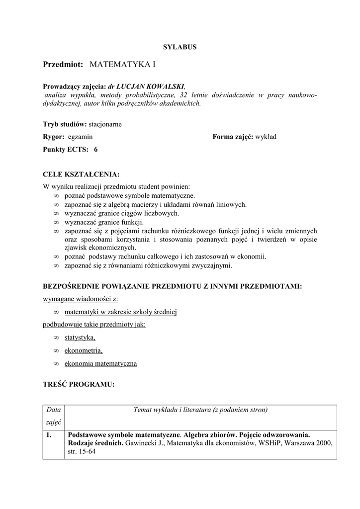 Przedmiot: MATEMATYKA I