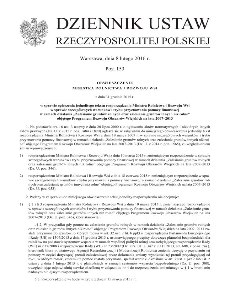 DZIENNIK USTAW RZECZYPOSPOLITEJ POLSKIEJ Warszawa, dnia 8 lutego 2016 r. Poz. 153 OBWIESZCZENIE MINISTRA ROLNICTWA I ROZWOJU WSI z dnia 31 grudnia 2015 r. w sprawie ogłoszenia jednolitego tekstu rozporządzenia Ministra Rolnictwa i Rozwoju Wsi w sprawie szczegółowych warunków i trybu przyznawania pomocy finansowej w ramach działania „Zalesianie gruntów rolnych oraz zalesianie gruntów innych niż rolne” objętego Programem Rozwoju Obszarów Wiejskich na lata 2007–2013 1. Na podstawie art. 16 ust. 3 ustawy z dnia 20 lipca 2000 r. o ogłaszaniu aktów normatywnych i niektórych innych aktów prawnych (Dz. U. z 2015 r. poz. 1484 i 1890) ogłasza się w załączniku do niniejszego obwieszczenia jednolity tekst rozporządzenia Ministra Rolnictwa i Rozwoju Wsi z dnia 19 marca 2009 r. w sprawie szczegółowych warunków i trybu przyznawania pomocy finansowej w ramach działania „Zalesianie gruntów rolnych oraz zalesianie gruntów innych niż rolne” objętego Programem Rozwoju Obszarów Wiejskich na lata 2007–2013 (Dz. U. z 2014 r. poz. 1565), z uwzględnieniem zmian wprowadzonych: 1) rozporządzeniem Ministra Rolnictwa i Rozwoju Wsi z dnia 10 marca 2015 r. zmieniającym rozporządzenie w sprawie szczegółowych warunków i trybu przyznawania pomocy finansowej w ramach działania „Zalesianie gruntów rolnych oraz zalesianie gruntów innych niż rolne” objętego Programem Rozwoju Obszarów Wiejskich na lata 2007–2013 (Dz. U. poz. 346); 2) rozporządzeniem Ministra Rolnictwa i Rozwoju Wsi z dnia 18 czerwca 2015 r. zmieniającym rozporządzenie w sprawie szczegółowych warunków i trybu przyznawania pomocy finansowej w ramach działania „Zalesianie gruntów rolnych oraz zalesianie gruntów innych niż rolne” objętego Programem Rozwoju Obszarów Wiejskich na lata 2007–2013 (Dz. U. poz. 953). 2. Podany w załączniku do niniejszego obwieszczenia tekst jednolity rozporządzenia nie obejmuje: 1) § 2 i § 3 rozporządzenia Ministra Rolnictwa i Rozwoju Wsi z dnia 10 marca 2015 r. zmieniającego rozporządzenie w sprawie szczegółowych warunków i trybu przyznawania pomocy finansowej w ramach działania „Zalesianie gruntów rolnych oraz zalesianie gruntów innych niż rolne” objętego Programem Rozwoju Obszarów Wiejskich na lata 2007–2013 (Dz. U. poz. 346), które stanowią: „§ 2. W przypadku gdy pomoc na zalesianie gruntów rolnych w ramach działania „Zalesianie gruntów rolnych oraz zalesianie gruntów innych niż rolne” objętego Programem Rozwoju Obszarów Wiejskich na lata 2007–2013 została przyznana do gruntów, o których mowa w art. 32 ust. 2 lit. b ppkt ii rozporządzenia Parlamentu Europejskiego i Rady (UE) nr 1307/2013 z dnia 17 grudnia 2013 r. ustanawiającego przepisy dotyczące płatności bezpośrednich dla rolników na podstawie systemów wsparcia w ramach wspólnej polityki rolnej oraz uchylającego rozporządzenie Rady (WE) nr 637/2008 i rozporządzenie Rady (WE) nr 73/2009 (Dz. Urz. UE L 347 z 20.12.2013, str. 608, z późn. zm.), kierownik biura powiatowego Agencji Restrukturyzacji i Modernizacji Rolnictwa zmienia decyzję o przyznaniu tej pomocy w części dotyczącej premii zalesieniowej przez dokonanie zmiany wysokości tej premii przysługującej od roku, w którym rolnik, któremu ta pomoc została przyznana, spełnił warunki określone w art. 7 ust. 1 pkt 2 lub ust. 2 ustawy z dnia 5 lutego 2015 r. o płatnościach w ramach systemów wsparcia bezpośredniego (Dz. U. poz. 308), uwzględniając odpowiednią stawkę określoną w załączniku nr 4 do rozporządzenia zmienianego w § 1 w brzmieniu nadanym niniejszym rozporządzeniem. § 3. Rozporządzenie wchodzi w życie z dniem 15 marca 2015 r.”; Dziennik Ustaw 2) –2– Poz. 153 § 2 i § 3 rozporządzenia Ministra Rolnictwa i Rozwoju Wsi z dnia 18 czerwca 2015 r. zmieniającego rozporządzenie w sprawie szczegółowych warunków i trybu przyznawania pomocy finansowej w ramach działania „Zalesianie gruntów rolnych oraz zalesianie gruntów innych niż rolne” objętego Programem Rozwoju Obszarów Wiejskich na lata 2007–2013 (Dz. U. poz. 953), które stanowią: „§ 2. 1. Do przyznawania pomocy finansowej w ramach działania „Zalesianie gruntów rolnych oraz zalesianie gruntów innych niż rolne” objętego Programem Rozwoju Obszarów Wiejskich na lata 2007–2013, w sprawach objętych postępowaniami: 1) wszczętymi i niezakończonymi ostateczną decyzją przed dniem wejścia w życie niniejszego rozporządzenia, 2)zakończonymi ostateczną decyzją wydaną na podstawie przepisów dotychczasowych, w przypadku gdy zostały wznowione od dnia wejścia w życie niniejszego rozporządzenia – stosuje się przepisy dotychczasowe. 2. Do wypłaty pomocy finansowej w ramach działania „Zalesianie gruntów rolnych oraz zalesianie gruntów innych niż rolne” objętego Programem Rozwoju Obszarów Wiejskich na lata 2007–2013, w sprawach objętych postępowaniami: 1) wszczętymi i niezakończonymi ostateczną decyzją przed dniem 15 marca 2015 r., 2)zakończonymi ostateczną decyzją wydaną na podstawie przepisów dotychczasowych, w przypadku gdy zostały wznowione od dnia 15 marca 2015 r. – stosuje się przepisy dotychczasowe. § 3. Rozporządzenie wchodzi w życie po upływie 14 dni od dnia ogłoszenia.”. Minister Rolnictwa i Rozwoju Wsi: K. Jurgiel Dziennik Ustaw –3– Poz. 153 Załącznik do obwieszczenia Ministra Rolnictwa i Rozwoju Wsi z dnia 31 grudnia 2015 r. (poz. 153) Rozporządzenie MINISTRA ROLNICTWA I ROZWOJU WSI 1) z dnia 19 marca 2009 r. w sprawie szczegółowych warunków i trybu przyznawania pomocy finansowej w ramach działania „Zalesianie gruntów rolnych oraz zalesianie gruntów innych niż rolne” objętego Programem Rozwoju Obszarów Wiejskich na lata 2007–2013 Na podstawie art. 29 ust. 1 pkt 1 i ust. 1a pkt 2 i 3 ustawy z dnia 7 marca 2007 r. o wspieraniu rozwoju obszarów wiejskich z udziałem środków Europejskiego Funduszu Rolnego na