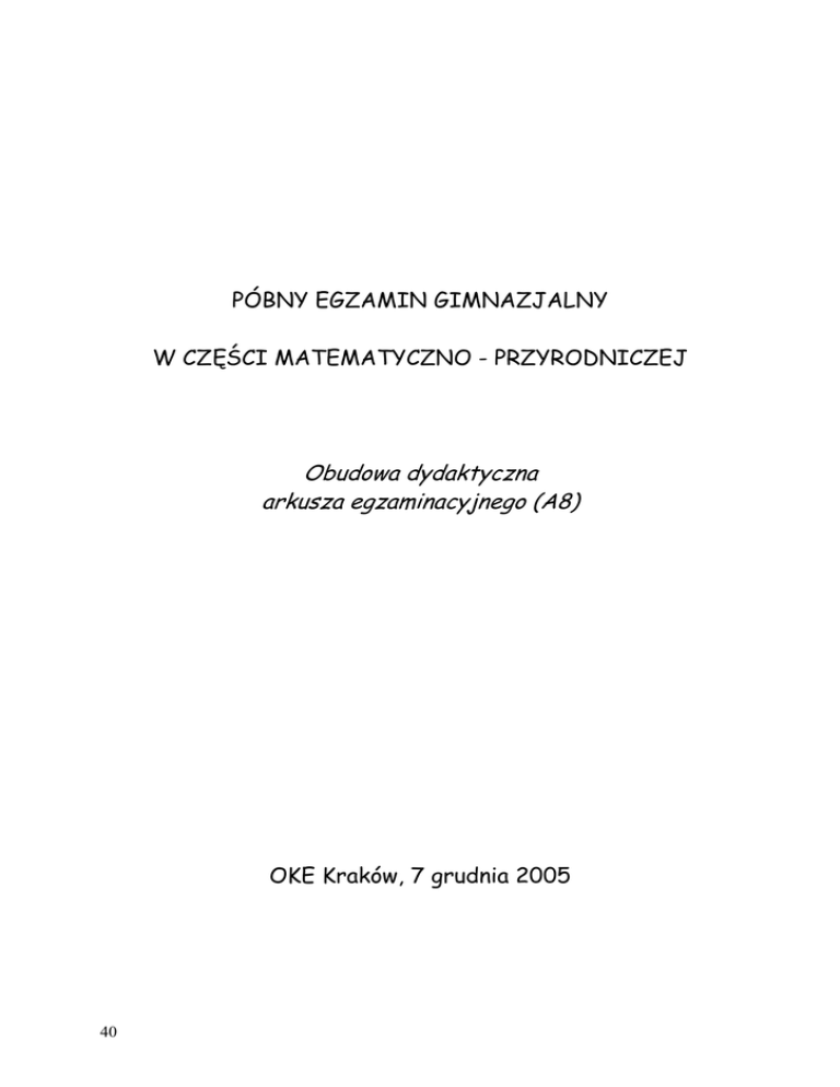 PÓBNY EGZAMIN GIMNAZJALNY W CZĘŚCI MATEMATYCZNO - PRZYRODNICZEJ Obudowa dydaktyczna arkusza egzaminacyjnego (A8) OKE Kraków, 7 grudnia 2005 40 OPIS ARKUSZA GM-A8-XI/05 Zestaw egzaminacyjny, z zakresu przedmiotów matematyczno- przyrodniczych nawiązuje do sytuacji i zagadnień, z którymi uczniowie mogą zetknąć się w szkole i w domu, w życiu codziennym i w toku nauki. Zestaw zawiera 29 zadań, w tym 12 zadań zamkniętych wielokrotnego wyboru oraz 17 zadań zaliczanych w terminologii egzaminacyjnej do zadań otwartych. Są to zadania z luką, wyboru, typu prawda - fałsz, krótkiej i rozszerzonej odpowiedzi. Na rozwiązanie wszystkich zadań przeznaczono maksymalnie 180 minut. Za poprawne rozwiązanie wszystkich zadań uczeń może otrzymać 50 punktów. Przyporządkowanie zadań i punktów do obszarów standardów wymagań egzaminacyjnych przedstawia poniższa tabela. Obszar standardów Numery zadań I - umiejętne stosowanie terminów, pojęć 4., 5., 6., 13., 19., i procedur z zakresu przedmiotów matematyczno-przyrodniczych 24.,25., 29. niezbędnych w praktyce życiowej i dalszym kształceniu (15 punktów) II - wyszukiwanie i stosowanie informacji (12 punktów) 1., 3., 7., 16., 23. III - wskazywanie i opisywanie faktów, związków i zależności, w 2., 8., 9., 10., 11., szczególności przyczynowo-skutkowych, funkcjonalnych, przestrzennych 12., 14., 15., 21., i czasowych (13 punktów) 26. IV - stosowanie zintegrowanej wiedzy 17., 18., 20., 22., i umiejętności do rozwiązywania problemów (10 punktów) 27., 28. Zadania sprawdzają umiejętności i wiadomości opisane w czterech obszarach standardów wymagań egzaminacyjnych. I - umiejętne stosowanie terminów, pojęć i procedur z zakresu przedmiotów matematyczno-przyrodniczych niezbędnych w praktyce życiowej i dalszym kształceniu, a w szczególności: - stosowanie terminów i pojęć matematyczno-przyrodniczych, - wykonywanie obliczeń w różnych sytuacjach praktycznych, posługiwanie się własnościami figur. II - wyszukiwanie i stosowanie informacji, a w szczególności: - odczytywanie informacji przedstawionych w formie wykresu, schematu, tabeli, mapy, rysunku, - operowanie informacjami (porównywanie, analizowanie, czytelne prezentowanie informacji). III - wskazywanie i opisywanie faktów, związków i zależności, w szczególności przyczynowoskutkowych, funkcjonalnych, przestrzennych i czasowych, a w szczególności: - wskazywanie prawidłowości w procesach, funkcjonowaniu układów, - posługiwanie się funkcjami, - stosowania zintegrowanej wiedzy do objaśniania zjawisk. IV - stosowanie zintegrowanej wiedzy i umiejętności do rozwiązywania problemów, a w szczególności: - stosowanie technik rozwiązywania problemów, - tworzenie modeli sytuacji problemowej. 41 KARTOTEKA ARKUSZA GM-A8-XII/05 Numer zadania 2 Uczeń: II/1 odczytuje informacje przedstawione w formie - tabeli II/2 operuje informacją 3 III/1 wskazuje prawidłowości w procesach 4 II/2 operuje informacją I/2 wykonuje obliczenia w różnych sytuacjach praktycznych – stosuje w praktyce własności działań I/2 wykonuje obliczenia w różnych sytuacjach praktycznych – stosuje w praktyce własności działań I/1 stosuje terminy i pojęcia matematyczno-przyrodnicze II/1 odczytuje przedstawione informacje III/1 wskazuje prawidłowości w procesach, w funkcjonowaniu układów i systemów I/1 stosuje terminy i pojęcia matematyczno-przyrodnicze III/1 wskazuje prawidłowości w procesach, w funkcjonowaniu układów i systemów III/4 stosuje zintegrowaną wiedzę do objaśniania zjawisk przyrodniczych III/4 stosuje zintegrowaną wiedzę do objaśniania zjawisk przyrodniczych I/3 posługuje się własnościami figur 1 5 6 7 8 9 10 11 12 13 14 42 Numer obszaru i standardu oraz nazwa sprawdzanej umiejętności Forma zadania Liczba punktów do uzyskania za zadanie porównuje liczby ujemne RO 0-1 porównuje informacje określa uwarunkowania klimatyczne roślin porównuje informacje zawarte w tabeli WW 0-1 WW 0-1 RO 0-3 wykonuje porównywanie różnicowe liczb WW 0-1 wykonuje obliczenia procentowe RO 0-3 rozróżnia nazwy planet WW 0-1 odczytuje informacje z rysunku KO 0-3 określa rolę dżdżownicy w przyrodzie WW 0-1 zna cechy organizmów cudzożywnych WW 0-1 wie, że rośliny są samożywne WW 0-1 wie, że pasożyty są przyczyną chorób WW 0-1 KO 0-2 RO 0-3 Nazwa sprawdzanej czynności Uczeń: zna wpływ wiatru na ciała w ruchu oblicza obwód prostokąta 15 16 II/2 operuje informacją I/2 wykonuje obliczenia w różnych sytuacjach praktycznych 17 IV/2 analizuje sytuację problemową 18 IV/2 analizuje sytuację problemową 19 20 21 I/2 wykonuje obliczenia w różnych sytuacjach praktycznych III/4 stosuje zintegrowaną wiedzę do objaśniania zjawisk przyrodniczych IV/3 tworzy modele sytuacji problemowej 28 I/1 stosuje terminy i pojęcia matematyczno-przyrodnicze I/1 stosuje terminy i pojęcia matematyczno-przyrodnicze I/1 stosuje terminy i pojęcia matematyczno-przyrodnicze III/4 stosuje zintegrowaną wiedzę do objaśniania zjawisk przyrodniczych I/1 stosuje terminy i pojęcia matematyczno-przyrodnicze II/1 1 odczytuje informacje przedstawione w formie - mapy II/1 1 odczytuje informacje przedstawione w formie - mapy 29 I/3 posługuje się własnościami figur 22 23 24 25 26 27 przedstawia informacje w formie wykresu KO 0-3 porównuje liczby RO 0-1 KO 0-4 KO 0-1 RO 0-3 KO 0-2 WW 0-1 wybiera nazwę silnika społecznym KO 0-1 rozróżnia rodzaje pojazdów KO 0-2 wybiera termin do opisu obiektu KO 0-1 KO 0-1 KO 0-1 WW 0-2 dostrzega związek stosowanych paliw z emisją CO2 wyjaśnia potrzebę wietrzenia pomieszczeń wykonuje mnożenie po zamianie jednostek miar wskazuje zagrożenia dla środowiska przyrodniczego proponuje sposób dbałości o środowisko wskazuje zagrożenia spowodowane uszkodzonymi przewodami wymienia urządzenia elektryczne używane w gospodarstwie domowym uzupełnia zdania na podstawie mapy zna kierunki na mapie nazywa figury g