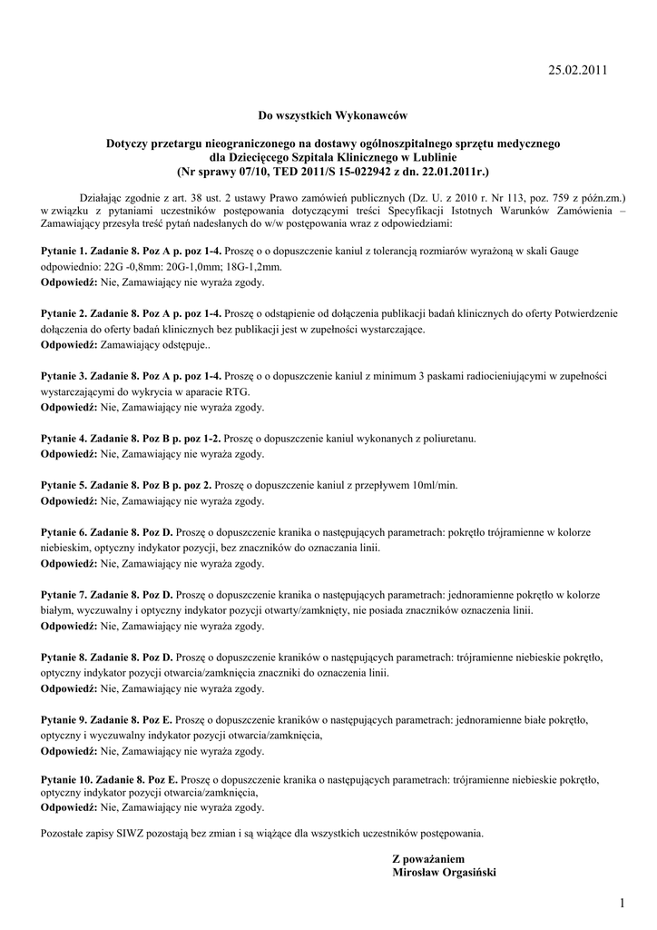 25.02.2011 Do wszystkich Wykonawców Dotyczy przetargu nieograniczonego na dostawy ogólnoszpitalnego sprzętu medycznego dla Dziecięcego Szpitala Klinicznego w Lublinie (Nr sprawy 07/10, TED 2011/S 15-022942 z dn. 22.01.2011r.) Działając zgodnie z art. 38 ust. 2 ustawy Prawo zamówień publicznych (Dz. U. z 2010 r. Nr 113, poz. 759 z późn.zm.) w związku z pytaniami uczestników postępowania dotyczącymi treści Specyfikacji Istotnych Warunków Zamówienia – Zamawiający przesyła treść pytań nadesłanych do w/w postępowania wraz z odpowiedziami: Pytanie 1. Zadanie 8. Poz A p. poz 1-4. Proszę o o dopuszczenie kaniul z tolerancją rozmiarów wyrażoną w skali Gauge odpowiednio: 22G -0,8mm: 20G-1,0mm; 18G-1,2mm. Odpowiedź: Nie, Zamawiający nie wyraża zgody. Pytanie 2. Zadanie 8. Poz A p. poz 1-4. Proszę o odstąpienie od dołączenia publikacji badań klinicznych do oferty Potwierdzenie dołączenia do oferty badań klinicznych bez publikacji jest w zupełności wystarczające. Odpowiedź: Zamawiający odstępuje.. Pytanie 3. Zadanie 8. Poz A p. poz 1-4. Proszę o o dopuszczenie kaniul z minimum 3 paskami radiocieniującymi w zupełności wystarczającymi do wykrycia w aparacie RTG. Odpowiedź: Nie, Zamawiający nie wyraża zgody. Pytanie 4. Zadanie 8. Poz B p. poz 1-2. Proszę o dopuszczenie kaniul wykonanych z poliuretanu. Odpowiedź: Nie, Zamawiający nie wyraża zgody. Pytanie 5. Zadanie 8. Poz B p. poz 2. Proszę o dopuszczenie kaniul z przepływem 10ml/min. Odpowiedź: Nie, Zamawiający nie wyraża zgody. Pytanie 6. Zadanie 8. Poz D. Proszę o dopuszczenie kranika o następujących parametrach: pokrętło trójramienne w kolorze niebieskim, optyczny indykator pozycji, bez znaczników do oznaczania linii. Odpowiedź: Nie, Zamawiający nie wyraża zgody. Pytanie 7. Zadanie 8. Poz D. Proszę o dopuszczenie kranika o następujących parametrach: jednoramienne pokrętło w kolorze białym, wyczuwalny i optyczny indykator pozycji otwarty/zamknięty, nie posiada znaczników oznaczenia linii. Odpowiedź: Nie, Zamawiający nie wyraża zgody. Pytanie 8. Zadanie 8. Poz D. Proszę o dopuszczenie kraników o następujących parametrach: trójramienne niebieskie pokrętło, optyczny indykator pozycji otwarcia/zamknięcia znaczniki do oznaczenia linii. Odpowiedź: Nie, Zamawiający nie wyraża zgody. Pytanie 9. Zadanie 8. Poz E. Proszę o dopuszczenie kraników o następujących parametrach: jednoramienne białe pokrętło, optyczny i wyczuwalny indykator pozycji otwarcia/zamknięcia, Odpowiedź: Nie, Zamawiający nie wyraża zgody. Pytanie 10. Zadanie 8. Poz E. Proszę o dopuszczenie kranika o następujących parametrach: trójramienne niebieskie pokrętło, optyczny indykator pozycji otwarcia/zamknięcia, Odpowiedź: Nie, Zamawiający nie wyraża zgody. Pozostałe zapisy SIWZ pozostają bez zmian i są wiążące dla wszystkich uczestników postępowania. Z poważaniem Mirosław Orgasiński 1