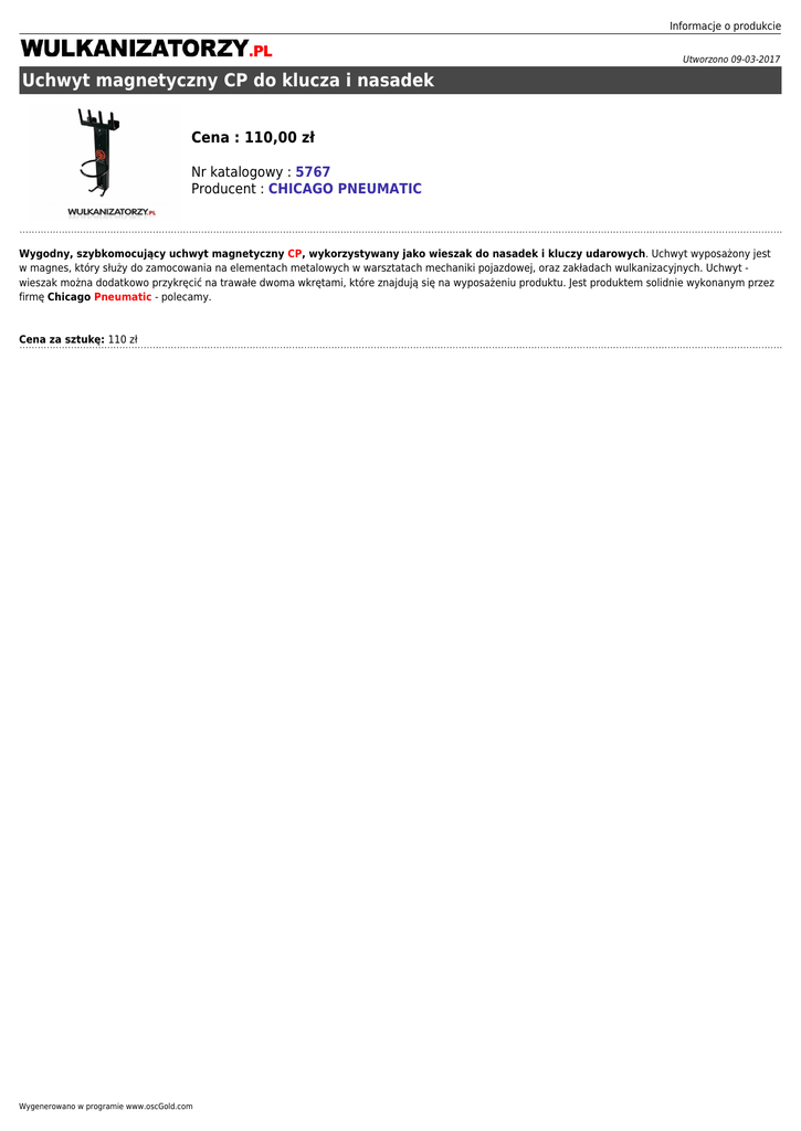 Informacje o produkcie Utworzono 09-03-2017 Uchwyt magnetyczny CP do klucza i nasadek Cena : 110,00 zł Nr katalogowy : 5767 Producent : CHICAGO PNEUMATIC Wygodny, szybkomocujący uchwyt magnetyczny CP, wykorzystywany jako wieszak do nasadek i kluczy udarowych. Uchwyt wyposażony jest w magnes, który służy do zamocowania na elementach metalowych w warsztatach mechaniki pojazdowej, oraz zakładach wulkanizacyjnych. Uchwyt wieszak można dodatkowo przykręcić na trawałe dwoma wkrętami, które znajdują się na wyposażeniu produktu. Jest produktem solidnie wykonanym przez firmę Chicago Pneumatic - polecamy. Cena za sztukę: 110 zł Wygenerowano w programie www.oscGold.com