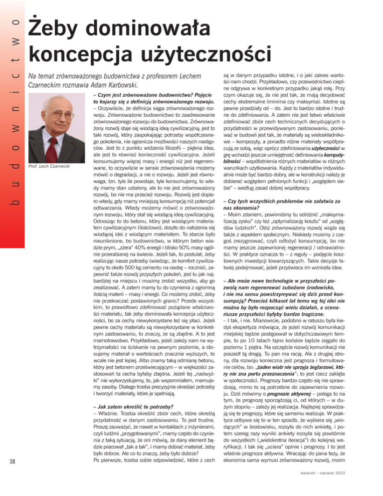 o w t c i n w o d u b 38 Żeby dominowała koncepcja użyteczności mb0114b BUDOWNICTWO są w danym przypadku istotne, i o jaki zakres wartoNa temat zrównoważonego budownictwa z ZRÓWNOWAŻONE profesorem Lechem ści nam chodzi. Przykładowo, czy przewodnictwo cieplCzarneckim rozmawia Adam Karbowski. ne odgrywa w konkretnym przypadku jakąś rolę. Przy – Czym jest zrównoważone budownictwo? Pojęcie czym okazuje się, że nie jest tak, że mają decydować to kojarzy się z definicją zrównoważonego rozwoju. cechy ekstremalne (minima czy maksyma). Istotne są – Oczywiście, że definicja sięga zrównoważonego rozpewne przedziały od – do. Jest to bardzo istotne i trudwoju. Zrównoważone budownictwo to zaadresowanie ne do zdefiniowania. A zatem nie jest łatwo właściwie zrównoważonego rozwoju do budownictwa. Zrównowazdefiniować zbiór cech technicznych decydujących o żony rozwój staje się wiodącą ideą cywilizacyjną; jest to przydatności w przewidywanym zastosowaniu, ponietaki rozwój, który zaspokajając potrzeby współczesneważ w budowli jest tak, że materiały są wieloskładnikogo pokolenia, nie ogranicza możliwości naszych następwe – kompozyty, a ponadto różne materiały współpraców. Jest to z punktu widzenia filozofii – piękna idea, cują ze sobą, więc oprócz zdefiniowania użyteczności w ale jest to również konieczność cywilizacyjna. Jeżeli grę wchodzi jeszcze umiejętność definiowania kompatykonsumujemy więcej masy i energii niż jest regenerobilności – współistnienia różnych materiałów w różnych Prof. Lech Czarnecki wane,Marek to oczywiście w sensie zrównoważenia możemy warunkach użytkowania. Każdy z materiałów indywiduLech Czarnecki Kaproń mówić o degradacji, a nie o rozwoju. Jeżeli jest równoalnie może być bardzo dobry, ale w konstrukcji należy je waga, tzn. tyle ile powstaje, tyle konsumujemy, to wtedobierać względem pełnionych funkcji i „względem siedy mamy stan ustalony, ale to nie jest zrównoważony bie”ne – wedługZzasad współpracy. inicjadobrej tywy In stytutu Techniki BudowPostulat zrównoważonego rozwoju, który zaspokajając potrzeby obec rozwój, bo nie ma przecież rozwoju. Rozwój jest dopielanej został utworzony w PKN Komitet nie ograniczy przyszłym pokoleniom możliwości zaspokojenia ich potrzeb, wtedy, mniejszą niż potencjał – Czy wszystkich nieno załatwia zabuniczny problemów KT 307 „Zrów ważone po ponad dwudziestu larotach odgdyjemamy go sfor mułokonsumpcję wania (ONZ, 1987) stał się tychTech Wtedy możemy mówić o zrównoważonas ekonomia? downictwo” – zwierciadlany w stosunku w Europie ważną ideą cyodtwarzania. wilizacyjną. nym rozwoju, który stał się wiodącą ideą cywilizacyjną. – Moim zdaniem, tu odróżnić „maksymado CENpowinniśmy TC 350. Wszyst ko to dzieje się Odnosząc to do betonu, który jest wiodącym materializację zysku” czy też „optymalizację kosztu” od rów „wzglęmalne potwierdzenie w inicjatywie Konie tylko w skali europejskiej, ale nież Ogólne zasady zrównoważenia łem cywilizacyjnym (ilościowo), doszło do nałożenia się dów ludzkich”. Otóż zrównoważony rozwój wiąże misji Europejskiej, która zapowiedziaglobalnej. W skali światowej to m.in. się niesformułował H. Daly w 1996 r. Są one wiodącej idei z wiodącym materiałem. To starcie Niekiedy musimy z czeła projekt Rozporzą dzeniabyło zastętakże pują-z aspektem uchronspołecznym. ność rozwo ju budow nictwa ponastępujące: którym beton wie- Roz gośpozrezygnować, odłożyć konsumpcję, bo ny niemi cego Dyrekw tywę 89/106/WE. dyktowaczyli na wzglę dami demograficz ● surowce odnawialne nieuniknione, nie powinnybo budownictwo, dzieniż prym, energii 50% masy ogólzapewnionej rządze niei blisko wprowa dzi zrów nowamamy żony jeszcze a incy dentalnośćregeneracji głównego/ odnawialnoobecnie nobyć konsumowane szybciej, mo„zżera” gą 40% nie przerabianej na świecie. Jeżeli tak, to postulat, żeby ści. W praktyce oznacza to – z reguły – podjęcie koszrozwój budownictwa jako siódme wyśnika energii, reprezentowanego przez być regenerowane; realizując nasze potrzeby (wiedząc, że komfort cywilizatownych inwestycji towarzyszących. Takie decyzje łamaganie podstawowe: obiekt budowpik naftowy (rysunek 1). W skali europej● surowce nieodnawialne nie powincyjny to około 500 kg cementu na osobę – rocznie), zatwiej podejmować, jeżeli przyświeca im wzniosła idea. lany powinien być zaprojektowany, skiej można zauważyć pewną równoleny być konsumowane szybciej, niż napewnić także rozwój przyszłych pokoleń, jest tu jak najwzniesiony (a także użytkowany) głość między działaniami (rysunek 2) krastępuje ich zastępowanie przez subbardziej na miejscu i musimy zrobić wszystko, aby go – Ale może nowe technologie w przyszłości poi rozebrany w sposób zgodny z wystytuty odnawialne; zrealizować. A zatem mamy tu do czynienia z ogromną zwolą nam regenerować zubożone środowisko, maganiami zrównoważonego roz● zanieczyszczenia i odpady nie poilością materii – masy i energii. Co możemy zrobić, żeby i nie ma sensu powstrzymywać się dziś przed konwoju. Z istoty rzeczy będzie to wywinny powstawać szybciej, niż natura nie przekraczać postawionych granic? Przede wszystsumpcją? Przecież kilkaset lat temu wg tej idei nie ma ga nie nad rzęd ne w sto sun ku może je absorbować, recyklizować lub kim, to prawidłowo zdefiniować pożądane właściwomożna by było rozpocząć wielu działań, a scenado pozostałych. Zrównoważenie rozunieszkodliwiać. ści materiału, tak żeby dominowała koncepcja użyteczriusze przyszłości byłyby bardzo tragiczne. woju budownictwa jest definiowane Efekty stosowania w różnym stopniu ności, bo za cechy niewykorzystane też się płaci. Jeżeli – I tak, i nie. Mianowicie, podobno w ratuszu była kiew aspekcie ekologicznym, a