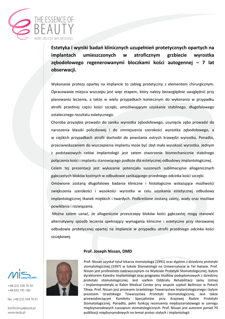 Estetyka i wyniki badań klinicznych uzupełnień protetycznych opartych na implantach umieszczonych w atroficznym grzbiecie wyrostka zębodołowego regenerowanymi bloczkami kości autogennej – 7 lat obserwacji. Wykonanie protezy opartej na implancie to zabieg protetyczny z elementem chirurgicznym. Opracowanie miejsca wszczepu jest więc etapem, który należy bezwzględnie uwzględnić przy planowaniu leczenia, a także w wielu przypadkach koniecznym do wykonania w przypadku atrofii przedniej części kości szczęki, umożliwiającym uzyskanie stabilnego, długofalowego ostatecznego rezultatu estetycznego. Choroba przyzębia prowadzi do zaniku wyrostka zębodołowego, usunięcie zęba prowadzi do naruszenia blaszki policzkowej i do zmniejszenia szerokości wyrostka zębodołowego, a w ciężkich przypadkach atrofii dochodzi do powstania ostrych krawędzi wyrostka. Ponadto, przeciwwskazaniem do wszczepienia implantu może być zbyt mała wysokość wyrostka. Jednym z podstawowych celów implantologii jest zatem stworzenie biomechanicznie stabilnego połączenia kości i implantu stanowiącego podłoże dla estetycznej odbudowy implantologicznej. Celem tej prezentacji jest wykazanie potencjału suszonych sublimacyjnie allogenicznych gąbczastych bloków kostnych w odbudowie zanikającego przedniego odcinka kości szczęki. Omówione zostaną długofalowe badania kliniczne i histologiczne wskazujące możliwości zwiększenia szerokości i wysokości wyrostka w celu uzyskania estetycznej odbudowy implantologicznej tkanek miękkich i twardych. Podkreślone zostaną zalety, wady oraz możliwe powikłania i rozwiązania. Można zatem uznać, że allogeniczne przeszczepy bloków kości gąbczastej mogą stanowić alternatywny sposób leczenia spełniający wymagania kliniczne i estetyczne przy sterowanej odbudowie protetycznej opartej na implancie w przypadku atrofii przedniego odcinka kości szczękowej. Prof. Joseph Nissan, DMD +48 (22) 338 70 50 +48 693 795 180 fax: +48 (22) 338 70 01 [email protected] www.teob.pl Prof. Nissan uzyskał tytuł lekarza stomatologa (1991) oraz dyplom z dziedziny protetyki stomatologicznej (1997) w Szkole Stomatologii na Uniwersytecie w Tel Awiwie. Prof. Nissan jest profesorem nadzwyczajnym na Wydziale Protetyki Stomatologicznej, byłym dyrektorem Katedry Implantologii oraz programu studiów podyplomowych z dziedziny protetyki stomatologicznej. Jest szefem Oddziału Rehabilitacji Jamy Ustnej i Implantoprotetyki w Rabin Medical Center przy zespole szpitali Beilinson w Petach Tikwa. Prof. Nissan jest prezesem Izraelskiego Towarzystwa Implantologicznego i byłym prezesem Izraelskiego Towarzystwa Protetyki Stomatologicznej. Jest także przewodniczącym Komitetu Specjalistów przy Krajowej Radzie Protetyki Stomatologicznej. Ponadto, pełni funkcję recenzenta międzynarodowego w szeregu międzynarodowych czasopism stomatologicznych. Prof. Nissan jest autorem ponad 70 publikacji międzynarodowych na temat protez stałych i implantologii.