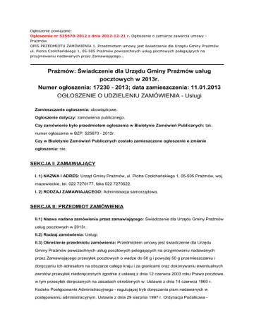 Ogłoszenie powiązane: Ogłoszenie nr 525670-2012 z dnia 2012-12-21 r. Ogłoszenie o zamiarze zawarcia umowy Prażmów OPIS PRZEDMIOTU ZAMÓWIENIA 1. Przedmiotem umowy jest świadczenie dla Urzędu Gminy Prażmów ul. Piotra Czołchańskiego 1, 05-505 Prażmów powszechnych usług pocztowych polegających na przyjmowaniu nadawanych przez Zamawiającego... Prażmów: Świadczenie dla Urzędu Gminy Prażmów usług pocztowych w 2013r. Numer ogłoszenia: 17230 - 2013; data zamieszczenia: 11.01.2013 OGŁOSZENIE O UDZIELENIU ZAMÓWIENIA - Usługi Zamieszczanie ogłoszenia: obowiązkowe. Ogłoszenie dotyczy: zamówienia publicznego. Czy zamówienie było przedmiotem ogłoszenia w Biuletynie Zamówień Publicznych: tak, numer ogłoszenia w BZP: 525670 - 2012r. Czy w Biuletynie Zamówień Publicznych zostało zamieszczone ogłoszenie o zmianie ogłoszenia: nie. SEKCJA I: ZAMAWIAJĄCY I. 1) NAZWA I ADRES: Urząd Gminy Prażmów, ul. Piotra Czołchańskiego 1, 05-505 Prażmów, woj. mazowieckie, tel. 022 7270177, faks 022 7270522. I. 2) RODZAJ ZAMAWIAJĄCEGO: Administracja samorządowa. SEKCJA II: PRZEDMIOT ZAMÓWIENIA II.1) Nazwa nadana zamówieniu przez zamawiającego: Świadczenie dla Urzędu Gminy Prażmów usług pocztowych w 2013r.. II.2) Rodzaj zamówienia: Usługi. II.3) Określenie przedmiotu zamówienia: Przedmiotem umowy jest świadczenie dla Urzędu Gminy Prażmów powszechnych usług pocztowych polegających na przyjmowaniu nadawanych przez Zamawiającego przesyłek pocztowych o wadze do 50 g i powyżej 50 g przemieszczaniu i doręczaniu ich adresatom na obszarze całego kraju i za granicami oraz dokonywaniu ewentualnych zwrotów przesyłek niedoręczonych zgodnie z ustawą z dnia 12 czerwca 2003 roku Prawo pocztowe w tym przesyłek doręczanych na zasadach określonych w: Ustawie z dnia 14 czerwca 1960 r. Kodeks Postępowania Administracyjnego - regulującej tryb doręczania pism nadawanych w postępowaniu administracyjnym. Ustawie z dnia 29 sierpnia 1997 r. Ordynacja Podatkowa - regulującej tryb doręczania pism nadawanych w trybie ordynacji podatkowej. Ustawie z dnia 23 kwietnia 1964 r. Kodeks Cywilny 2. Wykonawca zobowiązany jest zapewnić dla lokalizacji wskazanej w punkcie 1 możliwie najbliższy punkt nadawczy-odległość od lokalizacji do punktu nadania nie może być większa niż 2 km.. II.4) Wspólny Słownik Zamówień (CPV): 64.11.00.00-0. SEKCJA III: PROCEDURA III.1) TRYB UDZIELENIA ZAMÓWIENIA: Zamówienie z wolnej ręki III.2) INFORMACJE ADMINISTRACYJNE • Zamówienie dotyczy projektu/programu finansowanego ze środków Unii Europejskiej: nie SEKCJA IV: UDZIELENIE ZAMÓWIENIA IV.1) DATA UDZIELENIA ZAMÓWIENIA: 28.12.2012. IV.2) LICZBA OTRZYMANYCH OFERT: 1. IV.3) LICZBA ODRZUCONYCH OFERT: 0. IV.4) NAZWA I ADRES WYKONAWCY, KTÓREMU UDZIELONO ZAMÓWIENIA: • Poczta Polska SA zs w Warszawie ul. Stawki 2, Płock ul.Bielska 14b, 09-400 Płock, kraj/woj. mazowieckie. IV.5) Szacunkowa wartość zamówienia (bez VAT): 89384,80 PLN. IV.6) INFORMACJA O CENIE WYBRANEJ OFERTY ORAZ O OFERTACH Z NAJNIŻSZĄ I NAJWYŻSZĄ CENĄ • Cena wybranej oferty: 69741,43 • Oferta z najniższą ceną: 69741,43 / Oferta z najwyższą ceną: 69741,43 • Waluta: PLN. ZAŁĄCZNIK I Uzasadnienie udzielenia zamówienia w trybie negocjacji bez ogłoszenia, zamówienia z wolnej ręki albo zapytania o cenę • 1. Podstawa prawna Postępowanie prowadzone jest w trybie zamówienie z wolnej ręki na podstawie art. 67 ust. 1 pkt 4 ustawy z dnia 29 stycznia 2004r. - Prawo zamówień publicznych. • 2. Uzasadnienia wyboru trybu Należy podać uzasadnienie faktyczne i prawne wyboru trybu oraz wyjaśnić, dlaczego udzielenie zamówienia jest zgodne z przepisami. Zamawiający zastosował art. 67 ust.1 pkt 4 ustawy Prawo zamówień publicznych ponieważ przeprowadzone dwa postępowania w trybie przetargu nieograniczonego nie pozwoliły na wybranie wykonawcy. Obydwa postępowania zostały unieważnione . Pierwotne warunki zamówienia nie zostały w istotny sposób zmienione.