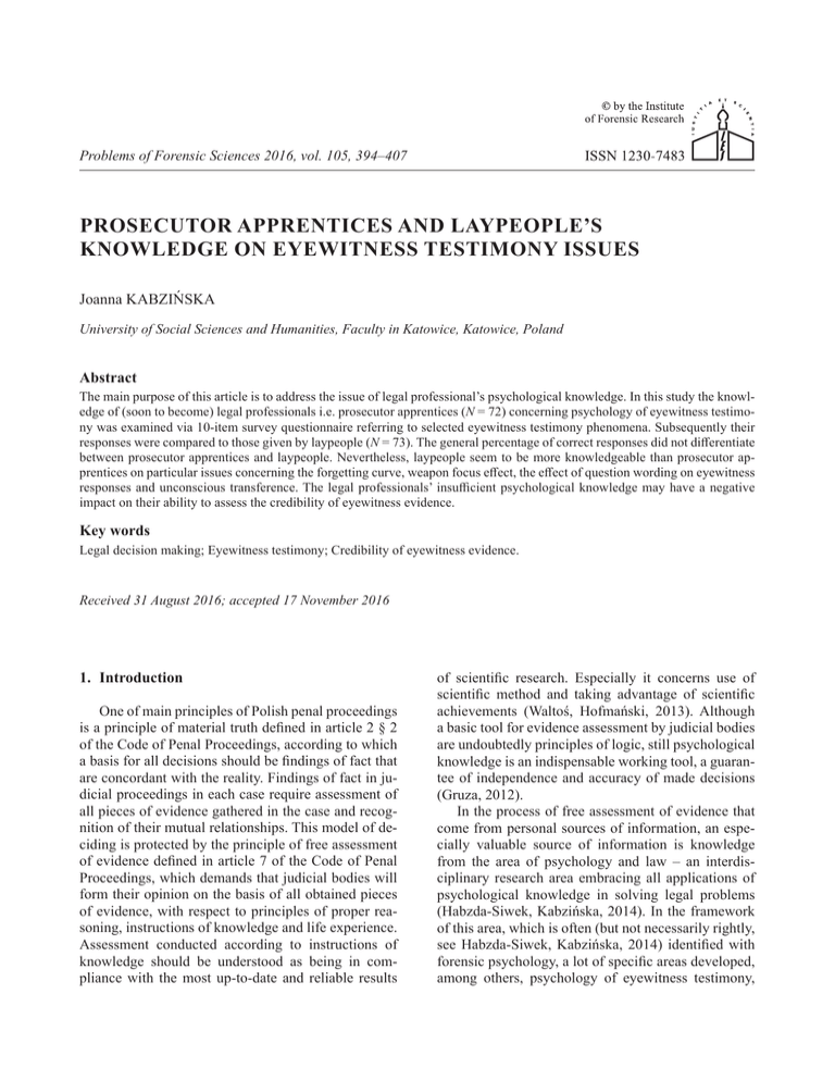 Problems of Forensic Sciences 2016, vol. 105, 394–407 Prosecutor apprentices and laypeople’s knowledge on eyewitness testimony issues Joanna KABZIŃSKA University of Social Sciences and Humanities, Faculty in Katowice, Katowice, Poland Abstract The main purpose of this article is to address the issue of legal professional’s psychological knowledge. In this study the knowledge of (soon to become) legal professionals i.e. prosecutor apprentices (N = 72) concerning psychology of eyewitness testimony was examined via 10-item survey questionnaire referring to selected eyewitness testimony phenomena. Subsequently their responses were compared to those given by laypeople (N = 73). The general percentage of correct responses did not differentiate between prosecutor apprentices and laypeople. Nevertheless, laypeople seem to be more knowledgeable than prosecutor apprentices on particular issues concerning the forgetting curve, weapon focus effect, the effect of question wording on eyewitness responses and unconscious transference. The legal professionals’ insufficient psychological knowledge may have a negative impact on their ability to assess the credibility of eyewitness evidence. Key words Legal decision making; Eyewitness testimony; Credibility of eyewitness evidence. Received 31 August 2016; accepted 17 November 2016 1.Introduction One of main principles of Polish penal proceedings is a principle of material truth defined in article 2 § 2 of the Code of Penal Proceedings, according to which a basis for all decisions should be findings of fact that are concordant with the reality. Findings of fact in judicial proceedings in each case require assessment of all pieces of evidence gathered in the case and recognition of their mutual relationships. This model of deciding is protected by the principle of free assessment of evidence defined in article 7 of the Code of Penal Proceedings, which demands that judicial bodies will form their opinion on the basis of all obtained pieces of evidence, with respect to principles of proper reasoning, instructions of knowledge and life experience. Assessment conducted according to instructions of knowledge should be understood as being in compliance with the most up-to-date and reliable results of scientific research. Especially it concerns use of scientific method and taking advantage of scientific achievements (Waltoś, Hofmański, 2013). Although a basic tool for evidence assessment by judicial bodies are undoubtedly principles of logic, still psychological knowledge is an indispensable working tool, a guarantee of independence and accuracy of made decisions (Gruza, 2012). In the process of free assessment of evidence that come from personal sources of information, an especially valuable source of information is knowledge from the area of psychology and law – an interdisciplinary research area embracing all applications of psychological knowledge in solving legal problems (Habzda-Siwek, Kabzińska, 2014). In the framework of this area, which is often (but not necessarily rightly, see Habzda-Siwek, Kabzińska, 2014) identified with forensic psychology, a lot of specific areas developed, among others, psychology of eyewitness testimony, Prosecutor apprentices and laypeople’s knowledge on eyewitness testimony issues which provides, among others, knowledge on factors that influence formulation of witness testimonies, techniques of questioning and methods of assessment of truthfulness and sincerity of witness testimonies (sometimes identified with their credibility). Credibility of a testimony is a probability attributed by a judicial body that information obtained from a witness reflects reality (Stanik, 2004; Wojciechowski, 2016). Witness testimonies may differ from a real course of events either as a result of conscious and intentional fabrication of testimony by a witness, or because of deformations or mistakes which are a result of influences of various factors that disturb processes of perception, storage and recollection of information. Credibility is not a term that is identical with sincerity of testimonies, or with their truthfulness. Sincerity of testimonies should be understood as consistency of their content with a witness’ subjective belief that s/he reports on a real course of events, and truthfulness should be understood as accordance of their content with an objective course of events (Wojciechowski, 2016). Assessment of credibility made by a judicial body (the court, public prosecutor) will be thorough and reliable if it considers assessment from the perspective of both truthfulness and sincerity criteria. Gruza (2003) presented a comprehensive systematics of methods of witnesses’ credibility assessment that are available for judicial bodies. Those methods were divided, according to division resulting from questioning tactics, into those referring to phenomena that occur before the questioning, during questioning, and after the questioning is finished. Among methods concerning phenomena that occur before a questioning has started, as first one advances analysis of processes that influence forming of testimonies. This analysis should consider both conditions accompanying the event, as well as information on the witness him/herself. Especially it should be directed at searching for factors which could influence processes of coding, storing and, finally, recollecting of information. One should take into account both estimator variables, as well as system variables (Wells, 1985). Estimator variables are those which, although they are beyond an area of influences of the widely understood administration of justice, still form witness’ memory concerning an event. The category of estimator variables includes, among others, age, sex, conditions of observation, and characteristics of the crime and its perpetrator. On the other hand, system variables are those factors whose influence on the content of memory depends on how administratio