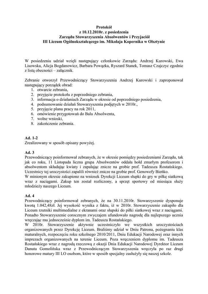 Protokół z 10.12.2010r. z posiedzenia Zarządu Stowarzyszenia Absolwentów i Przyjaciół III Liceum Ogólnokształcącego im. Mikołaja Kopernika w Olsztynie W posiedzeniu udział wzięli następujący członkowie Zarządu: Andrzej Kurowski, Ewa Lisowska, Alicja Bogdanowicz, Barbara Powązka, Ryszard Stanek, Tomasz Czajczyc zgodnie z listą obecności – załącznik. Zebranie otworzył Przewodniczący Stowarzyszenia Andrzej Kurowski i zaproponował następujący porządek obrad: 1. otwarcie zebrania, 2. przyjęcie protokołu z poprzedniego zebrania, 3. informacja o działaniach Zarządu w okresie od poprzedniego posiedzenia, 4. podsumowanie działań Stowarzyszenia podjętych w 2010r., 5. przyjęcie planu pracy na rok 2011, 6. omówienie przygotowań do Balu Absolwenta, 7. wolne wnioski, 8. zakończenie zebrania. Ad. 1-2 Zrealizowany w sposób opisany powyżej. Ad. 3 Przewodniczący poinformował zebranych, że w okresie pomiędzy posiedzeniami Zarządu, tak jak co roku, 11 Listopada liczna grupa Absolwentów oddała hołd zmarłym profesorom i absolwentom składając kwiaty i zapalając znicze na grobie prof. Tadeusza Rostańskiego. Uczestnicy tej uroczystości zapalili również znicze na grobie prof. Genowefy Bieńko. W minionym okresie zakupiono na wniosek Dyrekcji Liceum słupki do gry w piłkę siatkową wraz z naciągami. Zakup ten został rozliczony, a sprzęt sportowy od miesiąca służy młodzieży naszego Liceum. Ad. 4 Przewodniczący poinformował zebranych, że na 30.11.2010r. Stowarzyszenie dysponuje kwotą 1.042,48zł. Jej wysokość wynika z faktu, iż w 2010r. Stowarzyszenie zakupiło dla Liceum rzutniki multimedialne z ekranami oraz słupski do piłki siatkowej wraz z naciągami. Ponadto Stowarzyszenie corocznym zwyczajem ufundowało nagrodę dla najlepszego ucznia wręczając mu jednocześnie dyplom im. Tadeusza Rostańskiego. W 2010r. Stowarzyszenie aktywnie uczestniczyło we wszystkich uroczystościach organizowanych przez Dyrekcję Liceum. Braliśmy udział w Dniu Patrona, pożegnaniu klas maturalnych, rozpoczęciu roku szkolnego 2010/2011, Dniu Edukacji Narodowej oraz innych imprezach organizowanych na terenie Liceum. Poza wręczeniem dyplomu im. Tadeusza Rostańskiego wraz z nagrodą rzeczową z okazji Dnia Edukacji Narodowej Dyrektor Liceum Danuta Gomolińska wraz z Przewodniczącym Stowarzyszenia wręczyła po raz drugi honorowe matury III LO osobom, które w sposób specjalny zasłużyły się naszej szkole. Podobnie jak w latach poprzednich w mijającym roku zorganizowano Bal Absolwenta, Mistrzostwa Olsztyna Szkół Ponadgimnazjalnych oraz Regaty o puchar Jana Jakowickiego, a także odbył się kolejny rejs żeglarski. Należy również wspomnieć, że na przystani harcerskiej przez cały sezon żeglarski można było korzystać z jachtu BEZ 2 należącego do Stowarzyszenia. Ta mała „jednostka pływająca” nosi dumną nazwę „trójka”. Ad. 5 Wiceprzewodnicząca Stowarzyszenia zwróciła uwagę, że zarówno grono działaczy Stowarzyszenia, jak i lista członków naszej organizacji nie jest długa. Mimo to udaje nam się w sposób czynny uczestniczyć w codziennym życiu Liceum wzbogacając zarówno uroczystości szkolne, nagradzając najlepszych uczniów i osoby działające na rzecz szkoły, a także organizując imprezy i zawody sportowe, w których uczestniczy młodzież naszego Liceum, jak również ich rówieśnicy z innych szkół. Należy zrobić wszystko, aby imprezy posiadające kilkuletnia tradycję zostały utrzymane w kalendarzu na 2011r. Prezydium Zarządu proponuje, aby program roku 2011 przewidywał wszystkie dotychczasowe imprezy. Należy zrobić wszystko, aby przeprowadzić 11-12.06.2011r. spotkanie Absolwentów z okazji 10 lat działalności Stowarzyszenia. Powinno być to spotkanie tych Absolwentów, którzy zainteresowani są utrzymywaniem lub odnowieniem więzi przyjaźni oraz kontaktów z III LO. Członkowie Zarządu po krótkiej dyskusji zgodzili się z wnioskiem Wiceprzewodniczącej i uznali, że poza organizowaniem kolejnych edycji imprez znajdujących się w corocznym kalendarzu Stowarzyszenia należy podjąć działania zmierzające do rozszerzenia liczby członków, uczestników imprez organizowanych oraz poprawić skuteczność zbierania składek członkowskich Ad. 6 Katarzyna Frankowiak przypomniała, że 19.02.2011r. planowany jest kolejny Bal Absolwenta. Ze względu na fakt, iż w br. był on zorganizowany w restauracji Przystań Kortowska, a po jego zakończeniu organizatorzy otrzymali pozytywne oceny, należy najbliższy Bal zorganizować w tym samym miejscu. Powinien on być również balem „przebierańców”, a przynajmniej przewidywać możliwość uczestniczenia gości w przebraniach. Katarzyna Frankowiak zaproponowała, aby tym razem ukierunkować stroje na epokę, w której żył i działał Mikołaj Kopernik. Przewodniczący zaproponował, aby rozważyć również możliwość zorganizowania Balu w restauracji działającej na terenie centrum konferencyjnego UWM. Gospodarzem tego lokalu jest również Fundacja „ŻAK”, a więc nie powinno być problemu z utrzymaniem wstępnie zarezerwowanego terminu. Po dyskusji Przewodniczący został zobowiązany do przedłożenia na najbliższym zebraniu ostatecznych ustaleń oraz warunków, na jakich konkretny lokal zorganizuje zabawę. Uznano również, że impreza powinna być zorganizowana dla 70-80 osób, a jej koszt nie powinien przekraczać 80-90 zł. O ostatecznych uzgodnieniach członkowie Stowarzyszenia powinni być poinformowani na piśmie. Ad. 7-8 Ze względu na brak wolnych wniosków posiedzenie zostało zamknięte. Po zakończeniu części oficjalnej Przewodniczący złożył wszystkim obecnym serdeczne życzenia świąteczne i noworoczne, prosząc o przekazanie ich wszystkim Absolwentom i Przyjaciołom III LO w Olsztynie. Przewodniczący Wiceprzewodniczący Sekretarz Skarbik Andrzej Kurowski Ewa Lisowska Barbara Powązka Alicja Bogdanowicz Członkek