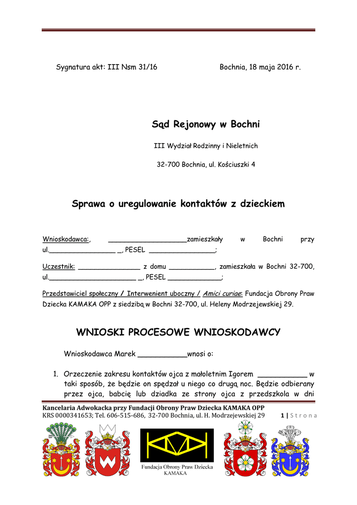 Sygnatura akt: III Nsm 31/16 Bochnia, 18 maja 2016 r. Sąd Rejonowy w Bochni III Wydział Rodzinny i Nieletnich 32-700 Bochnia, ul. Kościuszki 4 Sprawa o uregulowanie kontaktów z dzieckiem Wnioskodawca:, ___________________zamieszkały w Bochni przy ul.________________ _, PESEL ________________; Uczestnik: _______________ z domu ___________, zamieszkała w Bochni 32-700, ul._____________________ _, PESEL _____________; Przedstawiciel społeczny / Interwenient uboczny / Amici curiae: Fundacja Obrony Praw Dziecka KAMAKA OPP z siedzibą w Bochni 32-700, ul. Heleny Modrzejewskiej 29. WNIOSKI PROCESOWE WNIOSKODAWCY Wnioskodawca Marek ___________wnosi o: 1. Orzeczenie zakresu kontaktów ojca z małoletnim Igorem ___________ w taki sposób, że będzie on spędzał u niego co drugą noc. Będzie odbierany przez ojca, babcię lub dziadka ze strony ojca z przedszkola w dni Kancelaria Adwokacka przy Fundacji Obrony Praw Dziecka KAMAKA OPP KRS 0000341653; Tel. 606-515-686, 32-700 Bochnia, ul. H. Modrzejewskiej 29 1|Strona 2. 3. 4. 5. 6. nieparzyste i odprowadzany do przedszkola na drugi dzień rano. Wnioskodawca wnosi aby dni wolne od obowiązku szkolnego zostały podzielone równo pomiędzy rodziców w zakresie opieki nad małoletnim: cały lipiec u taty, pierwszy tydzień ferii zimowych też u niego; co drugi weekend z matką. W lata nieparzyste ojciec odbiera małoletniego w Wigilię o 18.00 i Wielką Sobotę o 15.00 i odwozi do uczestniczki po 24 godzinach. W lata parzyste zmiana. Zmianę postanowienia zabezpieczającego na czas trwania postępowania w zakresie sprawowania opieki i władzy rodzicielskiej przez oboje rodziców jak w pkt 1. Nadanie zarówno postępowaniu zabezpieczającemu jak orzeczeniu końcowemu klauzuli natychmiastowej wykonalności. Wydanie postanowień bez zbędnej zwłoki, nawet na posiedzeniu niejawnym, bez udziału stron. Dobro dziecka wymaga bowiem NATYCHMIASTOWEGO przerwania procesu zaniku więzi łączących chłopca z ojcem i jego rodzicami, a także z miejscem w którym mieszkał do grudnia 2015 r. Skierowanie rodziców i małoletniego na badanie do zespołu specjalistów przy Fundacji Obrony Praw Dziecka KAMAKA na okoliczność występowania u matki dziecka zaburzeń zachowania, które niewątpliwie doprowadzą do zniszczenia więzi Igora z połową jego rodziny i przedstawienia tut. sądowi opinii diagnozującej sytuację rodzinną i życiową małoletniego Igora _______, która zawierać będzie również opis najlepszych rozwiązań w zakresie orzecznictwa likwidujących patologię alienacji rodzicielskiej, przedstawiony przez instytucję wyspecjalizowaną w zakresie jej przeciwdziałania, na mocy art. 193 § 1., § 2. § 3 k.p.k., art. 195 k.p.k., art. 197 § 1., § 2. k.p.k., art. 198 § 1., § 2., § 3. k.p.k., art. 200 §1., § 2 punkty 1-6, § 3 k.p.k., art. 201 k.p.k., art. 205 § 1, § 2. § 3. k.p.k. art. 206 § 1. i § 2 k.p.k. Przeprowadzenie dowodu z zeznań biegłego Krzysztofa M. Kokoszka na okoliczności jak w pkt. 5. , a to na mocy art. 193 § 1., § 2. § 3 k.p.k., art. 195 k.p.k., art. 197 § 1., § 2. k.p.k., art. 198 § 1., § 2., § 3. k.p.k., art. 200 Kancelaria Adwokacka przy Fundacji Obrony Praw Dziecka KAMAKA OPP KRS 0000341653; Tel. 606-515-686, 32-700 Bochnia, ul. H. Modrzejewskiej 29 2|Strona §1., § 2 punkty 1-6, § 3 k.p.k., art. 201 k.p.k., art. 205 § 1, § 2. § 3. k.p.k. art. 206 § 1. i § 2 k.p.k. 7. Skierowanie stron na mediację do Fundacji Obrony Praw Dziecka KAMAKA OPP. Celem wypracowania polubownej ugody w zakresie opieki nad małoletnim i zredukowania napięć powstających na tym tle pomiędzy rodzicami. 8. Skierowanie stron na terapię do Fundacji Obrony Praw Dziecka KAMAKA OPP. W szczególności na terapię przeciwdziałającą eskalowaniu przemocy na tle alienacji rodzicielskiej oraz niwelowaniu jej skutków. 9. Przeprowadzenie dowodu z akt, a w szczególności z wyroku wydanego przez Sąd Apelacyjny w Gdańsku 15 lipca 2015 roku w sprawie o sygnatura akt I AC 202/15 na okoliczność, że nie orzeczenie opieki wspólnej zagraża dobrom osobistym małoletniego i jego ojca. (Sąd Apelacyjny w Gdańsku uznał, że więź dziecka z ojcem stanowi (cyt.) „dobro osobiste szczególnego rodzaju, tzn. takie, że jego naruszenie prowadzi do szczególnie silnych cierpień psychicznych” i nakazał matce wypłacenie ojcu bardzo wysokiego odszkodowania i zadośćuczynienia, dlatego bo doprowadziła do sytuacji w której córki deklarują brak chęci do spotkań z tatą.) 10. Orzeczenie, że miejscem zamieszkania małoletniego będzie miejsce zamieszkania rodzica u którego w danym dniu się znajduje. 11. Zobowiązanie matki do przestrzegania orzeczeń sądu w zakresie opieki wspólnej nad małoletnim synem stron, w szczególności czasu jaki ma on spędzać u ojca. 12. Nakazanie matce zapłacenia ojcu 5 000 zł (słownie: pięć tysięcy złotych) za każde naruszenie postanowienia sądu w zakresie opieki Kancelaria Adwokacka przy Fundacji Obrony Praw Dziecka KAMAKA OPP KRS 0000341653; Tel. 606-515-686, 32-700 Bochnia, ul. H. Modrzejewskiej 29 3|Strona wspólnej nad małoletnim synem stron, w szczególności terminów w których ma on przechodzić pod opiekę ojca, a to na mocy art. 598 15 k.p.c. i art. 59816 k.p.c. 13. Wygaszenie alimentów w związku z tym, że każdy z rodziców będzie spełniał swój obowiązek alimentacyjny w naturze, utrzymując dziecko wtedy, kiedy będzie przebywało pod jego opieką. UZASADNIENIE: Wniosek o wydanie postanowienia w kwestii kontaktów z dzieckiem (w formie zabezpieczenia lub w formie orzeczenia końcowego) niezwłocznie wynika z tego, że obecnie matka stosuje wobec swojego dziecka, wobec jego ojca, wobec babci i dziadka dziecka ze strony ojca przemoc na tle alienacji rodzicielskiej, ze szczególnym okrucieństwem. Zwrócić należy również uwagą Wysokiego Sądu na ewidentną, zabronioną przez Konstytucję RP, dyskryminację w zakresie dostępu do małoletniego. Tak mały zakres 
