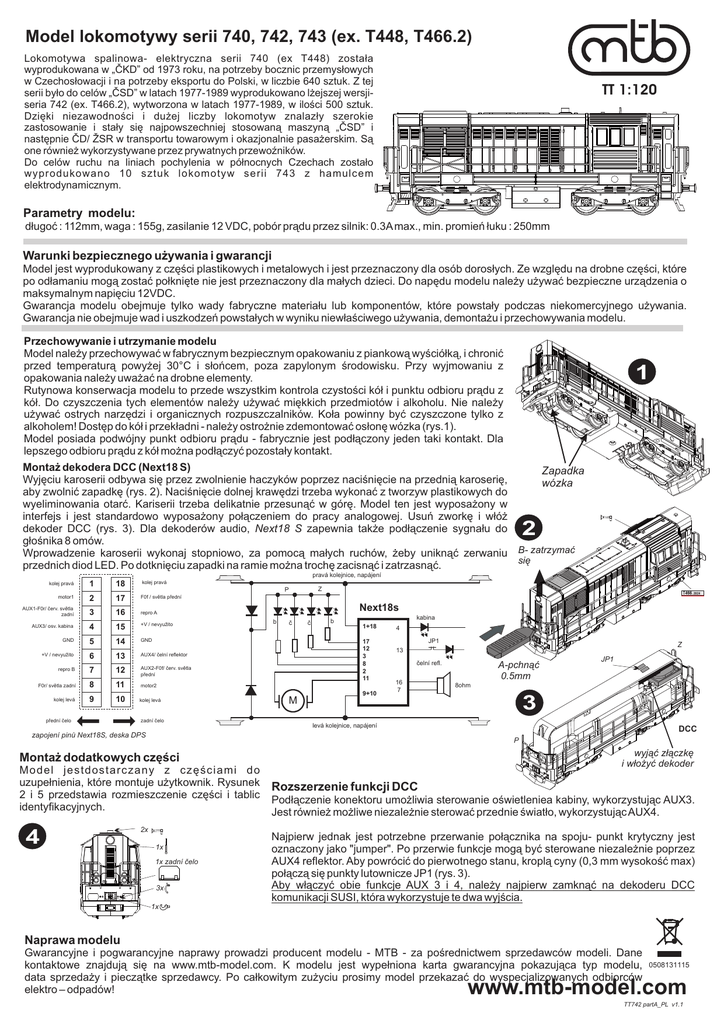 Model lokomotywy serii 740, 742, 743 (ex. T448, T466.2) Lokomotywa spalinowa- elektryczna serii 740 (ex T448) zosta³a wyprodukowana w „ÈKD” od 1973 roku, na potrzeby bocznic przemys³owych w Czechos³owacji i na potrzeby eksportu do Polski, w liczbie 640 sztuk. Z tej serii by³o do celów „ÈSD” w latach 1977-1989 wyprodukowano l¿ejszej wersjiseria 742 (ex. T466.2), wytworzona w latach 1977-1989, w iloœci 500 sztuk. Dziêki niezawodnoœci i du¿ej liczby lokomotyw znalaz³y szerokie zastosowanie i sta³y siê najpowszechniej stosowan¹ maszyn¹ „ÈSD” i nastêpnie ÈD/ SR w transportu towarowym i okazjonalnie pasa¿erskim. S¹ one równie¿ wykorzystywane przez prywatnych przewoŸników. Do celów ruchu na liniach pochylenia w pó³nocnych Czechach zosta³o wyprodukowano 10 sztuk lokomotyw serii 743 z hamulcem elektrodynamicznym. TT 1:120 Parametry modelu: d³ugoæ : 112mm, waga : 155g, zasilanie 12 VDC, pobór pr¹du przez silnik: 0.3A max., min. promieñ ³uku : 250mm Warunki bezpiecznego u¿ywania i gwarancji Model jest wyprodukowany z czêœci plastikowych i metalowych i jest przeznaczony dla osób doros³ych. Ze wzglêdu na drobne czêœci, które po od³amaniu mog¹ zostaæ po³kniête nie jest przeznaczony dla ma³ych dzieci. Do napêdu modelu nale¿y u¿ywaæ bezpieczne urz¹dzenia o maksymalnym napiêciu 12VDC. Gwarancja modelu obejmuje tylko wady fabryczne materia³u lub komponentów, które powsta³y podczas niekomercyjnego u¿ywania. Gwarancja nie obejmuje wad i uszkodzeñ powsta³ych w wyniku niew³aœciwego u¿ywania, demonta¿u i przechowywania modelu. Przechowywanie i utrzymanie modelu Model nale¿y przechowywaæ w fabrycznym bezpiecznym opakowaniu z piankow¹ wyœció³k¹, i chroniæ przed temperatur¹ powy¿ej 30°C i s³oñcem, poza zapylonym œrodowisku. Przy wyjmowaniu z opakowania nale¿y uwa¿aæ na drobne elementy. Rutynowa konserwacja modelu to przede wszystkim kontrola czystoœci kó³ i punktu odbioru pr¹du z kó³. Do czyszczenia tych elementów nale¿y u¿ywaæ miêkkich przedmiotów i alkoholu. Nie nale¿y u¿ywaæ ostrych narzêdzi i organicznych rozpuszczalników. Ko³a powinny byæ czyszczone tylko z alkoholem! Dostêp do kó³ i przek³adni - nale¿y ostro¿nie zdemontowaæ os³onê wózka (rys.1). Model posiada podwójny punkt odbioru pr¹du - fabrycznie jest pod³¹czony jeden taki kontakt. Dla lepszego odbioru pr¹du z kó³ mo¿na pod³¹czyæ pozosta³y kontakt. Monta¿ dekodera DCC (Next18 S) Zapadka Wyjêciu karoserii odbywa siê przez zwolnienie haczyków poprzez naciœniêcie na przedni¹ karoseriê, wózka aby zwolniæ zapadkê (rys. 2). Naciœniêcie dolnej krawêdzi trzeba wykonaæ z tworzyw plastikowych do wyeliminowania otaræ. Kariserii trzeba delikatnie przesun¹æ w górê. Model ten jest wyposa¿ony w interfejs i jest standardowo wyposa¿ony po³¹czeniem do pracy analogowej. Usuñ zworkê i w³ó¿ dekoder DCC (rys. 3). Dla dekoderów audio, Next18 S zapewnia tak¿e pod³¹czenie sygna³u do g³oœnika 8 omów. Wprowadzenie karoserii wykonaj stopniowo, za pomoc¹ ma³ych ruchów, ¿eby unikn¹æ zerwaniu B- zatrzymaæ siê przednich diod LED. Po dotkniêciu zapadki na ramie mo¿na trochê zacisn¹æ i zatrzasn¹æ. 1 2 pravá kolejnice, napájení kolej pravá 1 18 kolej pravá motor1 2 17 F0f / svìtla pøední AUX1-F0r/ èerv. svìtla zadní 3 16 repro A AUX3/ osv. kabina 4 15 +V / nevyuito GND 5 14 GND +V / nevyuito 6 13 AUX4/ èelní reflektor 7 12 AUX2-F0f/ èerv. svìtla pøední repro B F0r/ svìtla zadní 8 11 motor2 kolej levá 9 10 kolej levá pøední èelo Z P zadní èelo T466.2024 Next18s b è è b kabina 1+18 17 12 3 8 2 11 M 9+10 4 JP1 èelní refl. 16 7 A-pchn¹æ 0.5mm JP1 8ohm 3 levá kolejnice, napájení zapojení pinù Next18S, deska DPS DCC P wyj¹æ z³¹czkê i w³o¿yæ dekoder Monta¿ dodatkowych czêœci Model jestdostarczany z czêœciami do uzupe³nienia, które montuje u¿ytkownik. Rysunek 2 i 5 przedstawia rozmieszczenie czêœci i tablic identyfikacyjnych. 4 Z 13 2x 1x 1x zadní èelo 3x Rozszerzenie funkcji DCC Pod³¹czenie konektoru umo¿liwia sterowanie oœwietleniea kabiny, wykorzystuj¹c AUX3. Jest równie¿ mo¿liwe niezale¿nie sterowaæ przednie œwiat³o, wykorzystuj¹c AUX4. Najpierw jednak jest potrzebne przerwanie po³¹cznika na spoju- punkt krytyczny jest oznaczony jako "jumper". Po przerwie funkcje mog¹ byæ sterowane niezale¿nie poprzez AUX4 reflektor. Aby powróciæ do pierwotnego stanu, kropl¹ cyny (0,3 mm wysokoœæ max) po³¹cz¹ siê punkty lutownicze JP1 (rys. 3). Aby w³¹czyæ obie funkcje AUX 3 i 4, nale¿y najpierw zamkn¹æ na dekoderu DCC komunikacji SUSI, która wykorzystuje te dwa wyjœcia. 1x Naprawa modelu Gwarancyjne i pogwarancyjne naprawy prowadzi producent modelu - MTB - za poœrednictwem sprzedawców modeli. Dane kontaktowe znajduj¹ siê na www.mtb-model.com. K modelu jest wype³niona karta gwarancyjna pokazuj¹ca typ modelu, data sprzeda¿y i piecz¹tke sprzedawcy. Po ca³kowitym zu¿yciu prosimy model przekazaæ do wyspecjalizowanych odbiorców elektro – odpadów! 0508131115 www.mtb-model.com TT742 partA_PL v1.1