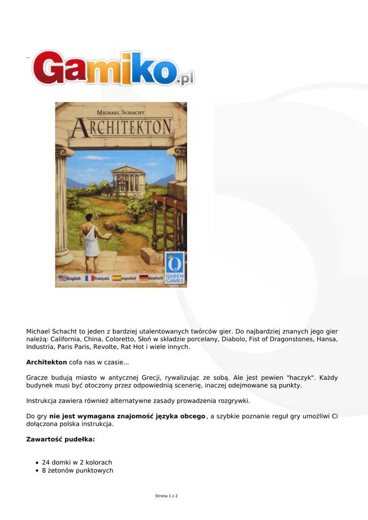 Michael Schacht to jeden z bardziej utalentowanych twórców gier. Do najbardziej znanych jego gier należą: California, China, Coloretto, Słoń w składzie porcelany, Diabolo, Fist of Dragonstones, Hansa, Industria, Paris Paris, Revolte, Rat Hot i wiele innych. Architekton cofa nas w czasie... Gracze budują miasto w antycznej Grecji, rywalizując ze sobą. Ale jest pewien "haczyk". Każdy budynek musi być otoczony przez odpowiednią scenerię, inaczej odejmowane są punkty. Instrukcja zawiera również alternatywne zasady prowadzenia rozgrywki. Do gry nie jest wymagana znajomość języka obcego , a szybkie poznanie reguł gry umożliwi Ci dołączona polska instrukcja. Zawartość pudełka: 24 domki w 2 kolorach 8 żetonów punktowych Strona 1 z 2 22 kafelki budynków 24 kafelki okolicy 1 instrukcja Wiek 8+ Liczba graczy 2 Czas gry ok. 30 - 45 minut Instrukcja polska Wydanie międzynarodowe Producent Queen Games Projektant Michael Schacht Strona 2 z 2