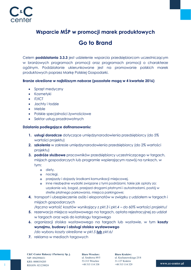 Wsparcie MŚP w promocji marek produktowych Go to Brand Celem poddziałania 3.3.3 jest udzielenie wsparcia przedsiębiorcom uczestniczącym w branżowych programach promocji oraz programach promocji o charakterze ogólnym. Poddziałanie ukierunkowane jest na promowanie polskich marek produktowych poprzez Markę Polskiej Gospodarki. Branże określone w najbliższym naborze (pozostałe mogą w 4 kwartale 2016) Sprzęt medyczny Kosmetyki IT/ICT Jachty i łodzie Meble Polskie specjalności żywnościowe Sektor usług prozdrowotnych Działania podlegające dofinansowaniu: 1. usługi doradcze dotyczące umiędzynarodowienia przedsiębiorcy (do 5% wartości projektu) 2. szkolenia w zakresie umiędzynarodowienia przedsiębiorcy (do 2% wartości projektu) 3. podróże służbowe pracowników przedsiębiorcy uczestniczącego w targach, misjach gospodarczych lub programie wspierającym rozwój na rynkach, w tym: o o o o diety, noclegi, przejazdy i dojazdy środkami komunikacji miejscowej, inne niezbędne wydatki związane z tymi podróżami, takie jak opłaty za: uzyskanie wiz, bagaż, przejazd drogami płatnymi i autostradami, postój w strefie płatnego parkowania, miejsca parkingowe; 4. transport i ubezpieczenie osób i eksponatów w związku z udziałem w targach i misjach gospodarczych /łączna wartość kosztów wynikający z pkt.3 i pkt.4 – do 60% wartości projektu/ 5. rezerwacja miejsca wystawowego na targach, opłata rejestracyjnej za udział w targach oraz wpis do katalogu targowego 6. organizacji stoiska wystawowego na targach lub wystawie, w tym koszty wynajmu, budowy i obsługi stoiska wystawowego /do wyboru koszty określone w pkt.5 lub pkt.6/ 7. reklama w mediach targowych 1 C&C-Center Rakoczy i Partnerzy Sp. j. NIP: 8942996831 KRS: 0000354205 REGON: 021238024 Biuro Wrocław: ul. Sztabowa 89/5 53-313 Wrocław +48 515 114 338 Biuro Kraków: ul. Kochanowskiego 25/8 31-127 Kraków +48 515 114 329 www.cc-center.pl 8. udział w seminariach, kongresach i konferencjach 9. organizacja pokazów, prezentacji i degustacji produktów w zakresie promocji marki produktowej 10. informacyjno-promocyjne projektu 11. ustanowienie i utrzymanie zabezpieczenia w formie, o której mowa w art. 131 ust. 4 lit. a rozporządzenia Parlamentu Europejskiego i Rady (UE) nr 1303/2013, dla zaliczki wypłaconej na rzecz MŚP Maksymalna kwota kosztów kwalifikowalnych wynosi: 1 000 000 zł. Poziom dofinansowania (dla wartości kosztów kwalifikowalnych): 1. Pomoc publiczna - 50% 2. Pomoc de minimis: 60% - średnie przedsiębiorstwo; 75% - małe przedsiębiorstwo; 80% - mikroprzedsiębiorstwo z województwa mazowieckiego; 85% - mikroprzedsiębiorstwo z pozostałych województw. Nabór wniosków: do 5 sierpnia 2016 OFERTA 2 000 zł za przygotowanie dokumentacji konkursowej 500 zł za przygotowanie kosztów wskazanych imprez targowych (opcjonalnie) success fee 10% od wartości przyznanego dofinansowania. Potwierdzam przyjęcie oferty firmy C&C-Center Rakoczy i Partnerzy Sp. j w dniu ……................................ Pieczątka i podpis …………………………………………….. 2 C&C-Center Rakoczy i Partnerzy Sp. j. NIP: 8942996831 KRS: 0000354205 REGON: 021238024 Biuro Wrocław: ul. Sztabowa 89/5 53-313 Wrocław +48 515 114 338 Biuro Kraków: ul. Kochanowskiego 25/8 31-127 Kraków +48 515 114 329 www.cc-center.pl