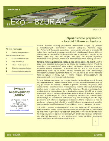 WYDANIE 5 „Eko – BZURA” Lipiec 2015 r. Opakowanie przyszłości – torebki foliowe vs. kartony W tym numerze: 1 Opakowanie przyszłości - torebki foliowe vs. kartony 3 Odpady niebezpieczne 3 Oleje odpadowe 4 Azbest – trudna sprawa 6 7 Z kącika młodego ekologa Członkowie Zgromadzenia Związek Międzygminny „BZURA” ul. Pijarska 1 lokal 9, II piętro, 99-400 Łowicz Tel./fax: 46 839 62 71 e - mail: [email protected] Torebki foliowe inaczej popularne reklamówki ciągle są jednym z nieodłącznych elementów naszych zakupów. Pomimo tego, że Parlament Europejski ograniczył stosowanie foliówek o grubości 50 mikronów z możliwością wyłączenia lekkich plastikowych toreb, które są niezbędne ze względów higienicznych (np. sprzedawca pakuje w nie mięso, ryby czy sery na wagę) lub gdy ich użycie ograniczy marnotrawstwo żywności, nadal 90% torebek foliowych kończy na ulicy. Torebkę foliową przeciętnie każdy z nas używa jakieś 12 minut. Jest to zazwyczaj czas jaki pokonujemy ze sklepu do naszego domu. Wtedy to właśnie chcąc przedłużyć sobie zakupy omiatamy obłędnym wzrokiem wszystkie witryny sklepowe i zastanawiamy się czy to czy tamto nie przydałoby nam się w domu. Wtedy właśnie jest czas nerwowego miętoszenia poczciwej torebki foliowej. Po powrocie do domu torebka foliowa ląduje w koszu lub w jakimś miejscu przeznaczonym dla zapomnianych i wymiętoszonych torebek. Torebki foliowe doczekały się drugiej, trzeciej i kolejnej generacji. Torebki biodegradowalne, torebki lniane, worki na kapcie przerobione na zakupy czy już ostatni hit mody – torebki z glonów. Pomimo wszystkich prób uzdrowienia i przystosowania nieokrzesanej torebki foliowej kulturalnego zachowania w środowisku ona nadal funkcjonuje. Czy są one rzeczywiście wielofunkcyjne rozkładając się w środowisku około 100-400 lat z czego w naszych rękach zazwyczaj spędzają jedynie kilkanaście minut swojego życia? Oczywiście jest to bardzo wdzięczny materiał do przetwarzania termicznego w spalarniach odpadów czy do recyklingu ale do tego potrzebna jest zdolność segregacji odpadów, której większość z nas nie posiada, zwłaszcza jeśli chodzi o torebki foliowe, a ograniczać zgodnie z postanowieniami Parlamentu Europejskiego trzeba i samo się nie zrobi. Już dzisiaj można zaobserwować rosnącą świadomość ekologiczną konsumentów, którzy coraz częściej zwracają uwagę na to, jaki wpływ opakowanie kupowanych przez nich produktów wywiera na środowisko. Rośnie popularność opakowań przyjaznych dla środowiska np. kartoników do płynnej żywności, a ich producenci mają ambicję stworzenia opakowań jeszcze bardziej ekologicznych. 1 Przede wszystkim warto wiedzieć, że na ogół karton jako surowiec w środowisku rozkłada się w zależności od składu od 1 roku do 10 lat. W porównaniu z setkami lat foliówek to niebo a ziemia, zwłaszcza, że czas jaki pudełko kartonowe spędzi w naszych dłoniach może być znacznie dłuższy niż średnie kilkanaście minut, ponieważ pudełko można spersonalizować umieszczając na nim nasz ulubiony cytat, motto, sentencje czy w zasadzie cokolwiek będziemy chcieli. Karton bardzo łatwo się składa i rozkłada więc, z recyklingiem na pierwszym etapie nie powinniśmy mieć większych problemów. Opakowania kartonowe do mleka i soków mają ogromny potencjał ze względu na cały szereg unikalnych cech, które sprawiają nie tylko, że są one przyjazne środowisku, ale także niezwykle praktyczne. Są lekkie, co sprawia, że nie traci się energii na ich transport, nie tłuką się, a równocześnie dzięki swojemu kształtowi idealnie nadają się do transportu, magazynowania oraz eksponowania na półkach sklepów. Dzięki zastosowaniu technologii aseptycznej możliwe jest dłuższe przechowywanie produktów wrażliwych na czynniki zewnętrzne bez konieczności chłodzenia, co ma znaczący wpływ na redukcję emisji dwutlenku węgla do atmosfery. Pod uwagę należy wziąć, że kartoniki składają się w około 70-80% z papieru, a mianowicie celulozy, która pochodzi z drewna, czyli surowca odnawialnego. W praktyce oznacza to, że zużyte opakowania kartonowe mogą być poddawane recyklingowi, co od 2007 roku ma miejsce także w Polsce. W polskich papierniach odzyskuje się z kartoników wysokiej jakości celulozę, która następnie używana jest do produkcji papieru. Odpady po kartonach przerabia się na płyty „wiórowe” mające zastosowanie np. w budownictwie. Wspomniane cechy kartoników jak i fakt, że są coraz szerzej wykorzystywane do pakowania nowych produktów, świadczą o tym, że są to opakowania o ogromnym potencjale. Wiele osób zaskoczyć może informacja, że w kartony pakuje się już nie tylko soki i mleko, ale także produkty wcześniej pakowane w puszki lub słoiki (np. groszek, kukurydzę, przeciery, sosy, itp.), wino, cukier czy żywność dla dzieci. Można spodziewać się, że w przyszłości w kartony pakowane będzie coraz więcej produktów, gdyż jest to bardzo nowoczesne opakowanie o szerokim spektrum zastosowań, z których część jeszcze nie została wykorzystana. O tym, że kartoniki czeka atrakcyjna przyszłość może zadecydować też to, że ich producenci nieustannie pracują nad nowymi, innowacyjnymi rozwiązaniami, które jeszcze bardziej zwiększą ich funkcjonalność, pozwolą sprostać nowym wyzwaniom zglobalizowanych gospodarek, jak i oczekiwaniom stawianym przez klientów, a także sprawią, że będą jeszcze bardziej ekologiczne. Tempo rozwoju w branży opakowaniowej jest bardzo dynamiczne, a wszystkie działania zmierzają do opracowania opakowania jeszcze bardziej zrównoważonego ekologicznie. W ostatnich latach sektor opakowaniowy koncentrował się na czterech obszarach: ograniczaniu wagi – lekkie opakowania minimalizują wykorzystanie zasobów, wykorzystywaniu materiałów odnawialnych i z recyklingu, przydatności do recyklingu oraz proj