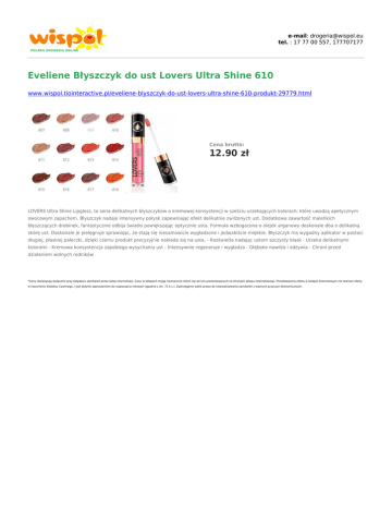 e-mail: [email protected] tel. : 17 77 00 557, 177707177 Eveliene Błyszczyk do ust Lovers Ultra Shine 610 www.wispol.tiointeractive.pl/eveliene-blyszczyk-do-ust-lovers-ultra-shine-610-produkt-29779.html Cena brutto: 12.90 zł LOVERS Ultra Shine Lipgloss, to seria delikatnych błyszczyków o kremowej konsystencji w sześciu urzekających kolorach, które uwodzą apetycznym owocowym zapachem. Błyszczyk nadaje intensywny połysk zapewniając efekt delikatnie zwilżonych ust. Dodatkowa zawartość maleńkich błyszczących drobinek, fantastycznie odbija światło powiększając optycznie usta. Formuła wzbogacona o olejek arganowy doskonale dba o delikatną skórę ust. Doskonale je pielęgnuje sprawiając, że stają się niesamowicie wygładzone i jedwabiście miękkie. Błyszczyk ma wygodny aplikator w postaci długiej, płaskiej pałeczki, dzięki czemu produkt precyzyjnie nakłada się na usta. - Rozświetla nadając ustom soczysty blask - Urzeka delikatnymi kolorami - Kremowa konsystencja zapobiega wysychaniu ust - Intensywnie regeneruje i wygładza - Głęboko nawilża i odżywia - Chroni przed działaniem wolnych rodników *Ceny obowiązują wyłącznie przy składaniu zamówień przez sklep internetowy. Ceny w sklepach mogą nieznacznie różnić się od cen prezentowanych na stronach sklepu internetowego. Przedstawiona oferta w sklepie internetowym nie stanowi oferty w rozumieniu Kodeksu Cywilnego, i jest jedynie zaproszeniem do rozpoczęcia rokowań (zgodnie z art. 71 k.c.). Zastrzegamy sobie prawo do niezrealizowania zamówień z ważnych przyczyn ekonomicznych.
