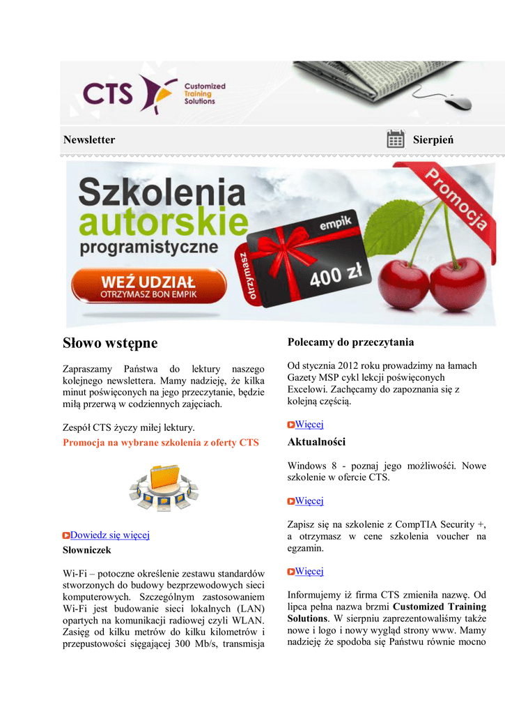 Newsletter Sierpień Słowo wstępne Polecamy do przeczytania Zapraszamy Państwa do lektury naszego kolejnego newslettera. Mamy nadzieję, że kilka minut poświęconych na jego przeczytanie, będzie miłą przerwą w codziennych zajęciach. Od stycznia 2012 roku prowadzimy na łamach Gazety MSP cykl lekcji poświęconych Excelowi. Zachęcamy do zapoznania się z kolejną częścią. Zespół CTS życzy miłej lektury. Promocja na wybrane szkolenia z oferty CTS Więcej Aktualności Windows 8 - poznaj jego możliwośći. Nowe szkolenie w ofercie CTS. Więcej Dowiedz się więcej Słowniczek Wi-Fi – potoczne określenie zestawu standardów stworzonych do budowy bezprzewodowych sieci komputerowych. Szczególnym zastosowaniem Wi-Fi jest budowanie sieci lokalnych (LAN) opartych na komunikacji radiowej czyli WLAN. Zasięg od kilku metrów do kilku kilometrów i przepustowości sięgającej 300 Mb/s, transmisja Zapisz się na szkolenie z CompTIA Security +, a otrzymasz w cene szkolenia voucher na egzamin. Więcej Informujemy iż firma CTS zmieniła nazwę. Od lipca pełna nazwa brzmi Customized Training Solutions. W sierpniu zaprezentowaliśmy także nowe i logo i nowy wygląd strony www. Mamy nadzieję że spodoba się Państwu równie mocno na dwóch kanałach jednocześnie. Nowości rynkowe jak nam :). Zapraszamy do jej obejrzenia. Więcej Super szybka sieć Wi-Fi! Firma Marvell zapowiedziała, że przygotuje czipy Wi-Fi, dzięki którym sieć może działać nawet z prędkością 7Gbps. To ponad sto razy szybciej, niż oferuje obecna technologia! ZGARNIJ PREMIĘ za udział w naszych szkoleniach. Pierwsze tablety Prestigio i iPady już rozdane. Więcej Więcej "Puste kieszenie nigdy nie powstrzymały nikogo przed podjęciem działania. Mogą to zrobić tylko puste głowy i puste serca." Norman Vincent Peale www.cts.com.pl Wypisz się z Newslettera >