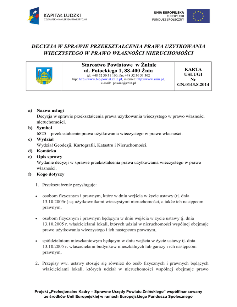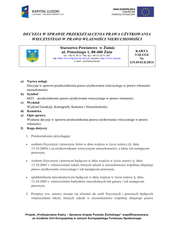 DECYZJA W SPRAWIE PRZEKSZTAŁCENIA PRAWA UŻYTKOWANIA WIECZYSTEGO W PRAWO WŁASNOŚCI NIERUCHOMOŚCI Starostwo Powiatowe w Żninie ul. Potockiego 1, 88-400 Żnin tel. +48 52 30 31 100, fax +48 52 30 31 302 bip: http://www.bip.powiat.znin.pl, internet: http://www.znin.pl, e-mail: [email protected] KARTA USŁUGI Nr GN.0143.8.2014 a) Nazwa usługi Decyzja w sprawie przekształcenia prawa użytkowania wieczystego w prawo własności nieruchomości. b) Symbol 6825 – przekształcenie prawa użytkowania wieczystego w prawo własności. c) Wydział Wydział Geodezji, Kartografii, Katastru i Nieruchomości. d) Komórka e) Opis sprawy Wydanie decyzji w sprawie przekształcenia prawa użytkowania wieczystego w prawo własności. f) Kogo dotyczy 1. Przekształcenie przysługuje: osobom fizycznym i prawnym, które w dniu wejścia w życie ustawy (tj. dnia 13.10.2005r.) są użytkownikami wieczystymi nieruchomości, a także ich następcom prawnym, osobom fizycznym i prawnym będącym w dniu wejścia w życie ustawy tj. dnia 13.10.2005 r. właścicielami lokali, których udział w nieruchomości wspólnej obejmuje prawo użytkowania wieczystego i ich następcom prawnym, spółdzielniom mieszkaniowym będącym w dniu wejścia w życie ustawy tj. dnia 13.10.2005 r. właścicielami budynków mieszkalnych lub garaży i ich następcom prawnym, 2. Przepisy ww. ustawy stosuje się również do osób fizycznych i prawnych będących właścicielami lokali, których udział w nieruchomości wspólnej obejmuje prawo Projekt „Profesjonalne Kadry – Sprawne Urzędy Powiatu Żnińskiego” współfinansowany ze środków Unii Europejskiej w ramach Europejskiego Funduszu Społecznego użytkowania wieczystego, które nabyły udział w użytkowaniu wieczystym po dniu 13 października 2005r. tj. po dniu wejścia w życie ustawy. 3. W przypadku współużytkowania wieczystego z żądaniem przekształcenia występują wszyscy współużytkownicy wieczyści, z zastrzeżeniem ust. 2 (art. 2 ustawy) „Z żądaniem przekształcenia mogą wystąpić współużytkownicy wieczyści, których suma udziałów wynosi co najmniej połowę. Jeżeli co najmniej jeden współużytkownik wieczysty zgłosi sprzeciw wobec złożonego wniosku o przekształcenie, właściwy organ zawiesza postępowanie. W takim przypadku przepis art. 199 kc stosuje się odpowiednio." 4. Prawo do nieodpłatnego przekształcenia przysługuje użytkownikom wieczystym i ich następcom prawnym, którym oddano nieruchomość w użytkowanie wieczyste w zamian za wywłaszczenie lub przejęcie nieruchomości gruntowej na rzecz Skarbu Państwa na podstawie innych tytułów, przed dniem 5 grudnia 1990r., niezależnie od przeznaczenia tej nieruchomości. 5. Przepisów ustawy nie stosuje się do: 1) nieruchomości oddanych w użytkowanie wieczyste Polskiemu Związkowi Działkowców; 2) nieruchomości oddanych w użytkowanie wieczyste państwowym i samorządowym osobom prawnym, a także spółkom handlowym, w odniesieniu do których Skarb Państwa lub jednostka samorządu terytorialnego jest podmiotem dominującym w rozumieniu ustawy z dnia 29 lipca 2005 r. o ofercie publicznej i warunkach wprowadzenia instrumentów finansowych do zorganizowanego systemu obrotu oraz o spółkach publicznych (Dz. U. z 2009 r. Nr 185, poz. 1439 oraz z 2010 r. Nr 167, poz. 1129); 3) nieruchomości, wobec których toczy się postępowanie administracyjne, mające na celu nabycie nieruchomości lub jej części pod inwestycję celu publicznego. g) Wymagane dokumenty Wniosek o wydanie decyzji w sprawie przekształcenia prawa użytkowania wieczystego w prawo własności, - Akt notarialny - odpis z rejestru przedsiębiorców KRS ( w przypadku spółek kapitałowych). h) Miejsce składania pism Sekretariat Starosty Żnińskiego - I piętro, pok. nr 19 i) Termin i sposób załatwienia - Jeśli zachodzą ustawowe przesłanki, wniosek załatwiany jest poprzez wydanie decyzji administracyjnej w sprawie przekształcenia prawa użytkowania wieczystego w prawo własności nieruchomości, w terminie 3 - 6 miesięcy; Projekt „Profesjonalne Kadry – Sprawne Urzędy Powiatu Żnińskiego” współfinansowany ze środków Unii Europejskiej w ramach Europejskiego Funduszu Społecznego - w przypadku braku przesłanek ustawowych wniosek jest załatwiany poprzez wydanie decyzji administracyjnej o odmowie bądź umorzeniu postępowania w sprawie, w terminie 3 - 4 miesięcy. j) Opłaty Opłata skarbowa: Wydanie decyzji w przedmiocie przekształcenia użytkowania wieczystego w prawo własności podlega opłacie skarbowej w wysokości 10 zł. Opłatę należy uiścić na rachunek bankowy organu podatkowego: Urząd Miejski w Żninie, Bank Spółdzielczy „PAŁUKI” w Żninie nr 47 8181 0000 2742 2000 0038. k) Podstawa prawna art. 1 – art. 5 ustawy z dnia 29 lipca 2005 r. o przekształceniu prawa użytkowania wieczystego w prawo własności nieruchomości ( tekst jednolity Dz. U. z 2012 r. Nr 83). Tryb odwoławczy Odwołanie za pośrednictwem Starosty Żnińskiego do Wojewody Kujawsko – Pomorskiego, w terminie 14 dni od daty doręczenia decyzji. m) Inne informacje II piętro pokój nr 34, tel. 0-52 30 311 00 wew. 62 Monika Kończal - inspektor, e-mail: [email protected] n) Więcej informacji l) Wnioski i formularze: - wniosek o wydanie decyzji w sprawie przekształcenia prawa użytkowania wieczystego w prawo własności nieruchomości, - przykład wypełnionego wniosku o wydanie decyzji w sprawie przekształcenia prawa użytkowania wieczystego w prawo własności nieruchomości. Projekt „Profesjonalne Kadry – Sprawne Urzędy Powiatu Żnińskiego” współfinansowany ze środków Unii Europejskiej w ramach Europejskiego Funduszu Społecznego