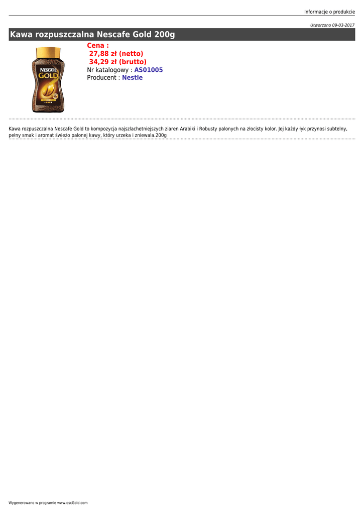 Informacje o produkcie Utworzono 09-03-2017 Kawa rozpuszczalna Nescafe Gold 200g Cena : 27,88 zł (netto) 34,29 zł (brutto) Nr katalogowy : AS01005 Producent : Nestle Kawa rozpuszczalna Nescafe Gold to kompozycja najszlachetniejszych ziaren Arabiki i Robusty palonych na złocisty kolor. Jej każdy łyk przynosi subtelny, pełny smak i aromat świeżo palonej kawy, który urzeka i zniewala.200g Wygenerowano w programie www.oscGold.com