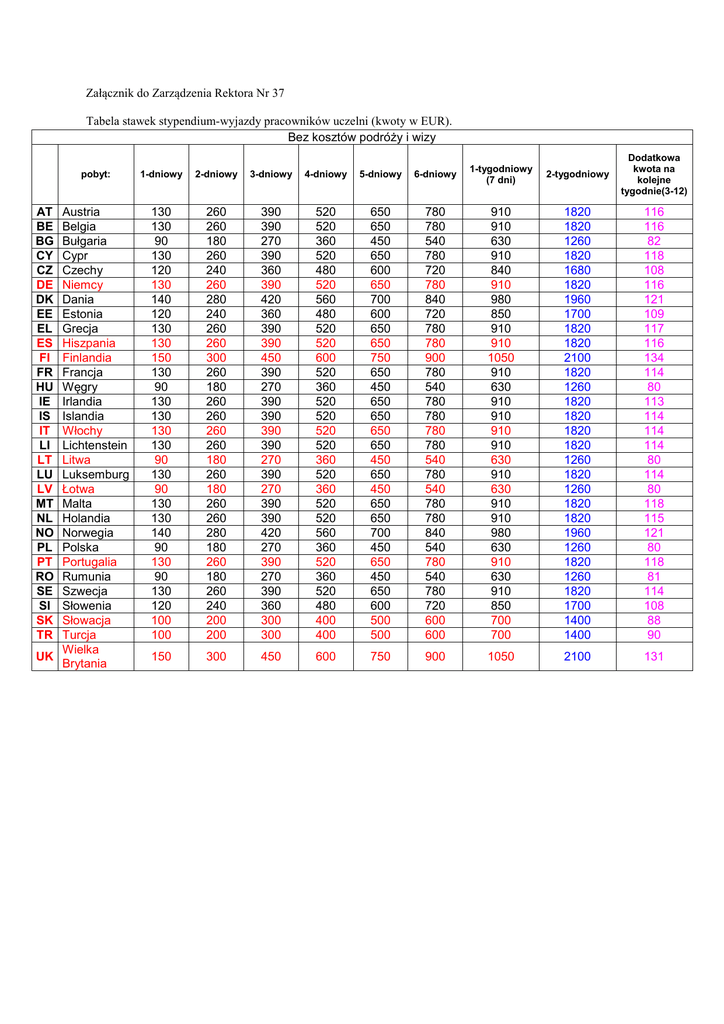 Załącznik do Zarządzenia Rektora Nr 37 Tabela stawek stypendium-wyjazdy pracowników uczelni (kwoty w EUR). Bez kosztów podróży i wizy pobyt: AT BE BG CY CZ DE DK EE EL ES FI FR HU IE IS IT LI LT LU LV MT NL NO PL PT RO SE SI SK TR Austria Belgia Bułgaria Cypr Czechy Niemcy Dania Estonia Grecja Hiszpania Finlandia Francja Węgry Irlandia Islandia Włochy Lichtenstein Litwa Luksemburg Łotwa Malta Holandia Norwegia Polska Portugalia Rumunia Szwecja Słowenia Słowacja Turcja Wielka UK Brytania 1-dniowy 2-dniowy 3-dniowy 4-dniowy 5-dniowy 6-dniowy 1-tygodniowy (7 dni) 2-tygodniowy Dodatkowa kwota na kolejne tygodnie(3-12) 130 130 90 130 120 130 140 120 130 130 150 130 90 130 130 130 130 90 130 90 130 130 140 90 130 90 130 120 100 100 260 260 180 260 240 260 280 240 260 260 300 260 180 260 260 260 260 180 260 180 260 260 280 180 260 180 260 240 200 200 390 390 270 390 360 390 420 360 390 390 450 390 270 390 390 390 390 270 390 270 390 390 420 270 390 270 390 360 300 300 520 520 360 520 480 520 560 480 520 520 600 520 360 520 520 520 520 360 520 360 520 520 560 360 520 360 520 480 400 400 650 650 450 650 600 650 700 600 650 650 750 650 450 650 650 650 650 450 650 450 650 650 700 450 650 450 650 600 500 500 780 780 540 780 720 780 840 720 780 780 900 780 540 780 780 780 780 540 780 540 780 780 840 540 780 540 780 720 600 600 910 910 630 910 840 910 980 850 910 910 1050 910 630 910 910 910 910 630 910 630 910 910 980 630 910 630 910 850 700 700 1820 1820 1260 1820 1680 1820 1960 1700 1820 1820 2100 1820 1260 1820 1820 1820 1820 1260 1820 1260 1820 1820 1960 1260 1820 1260 1820 1700 1400 1400 116 116 82 118 108 116 121 109 117 116 134 114 80 113 114 114 114 80 114 80 118 115 121 80 118 81 114 108 88 90 150 300 450 600 750 900 1050 2100 131
